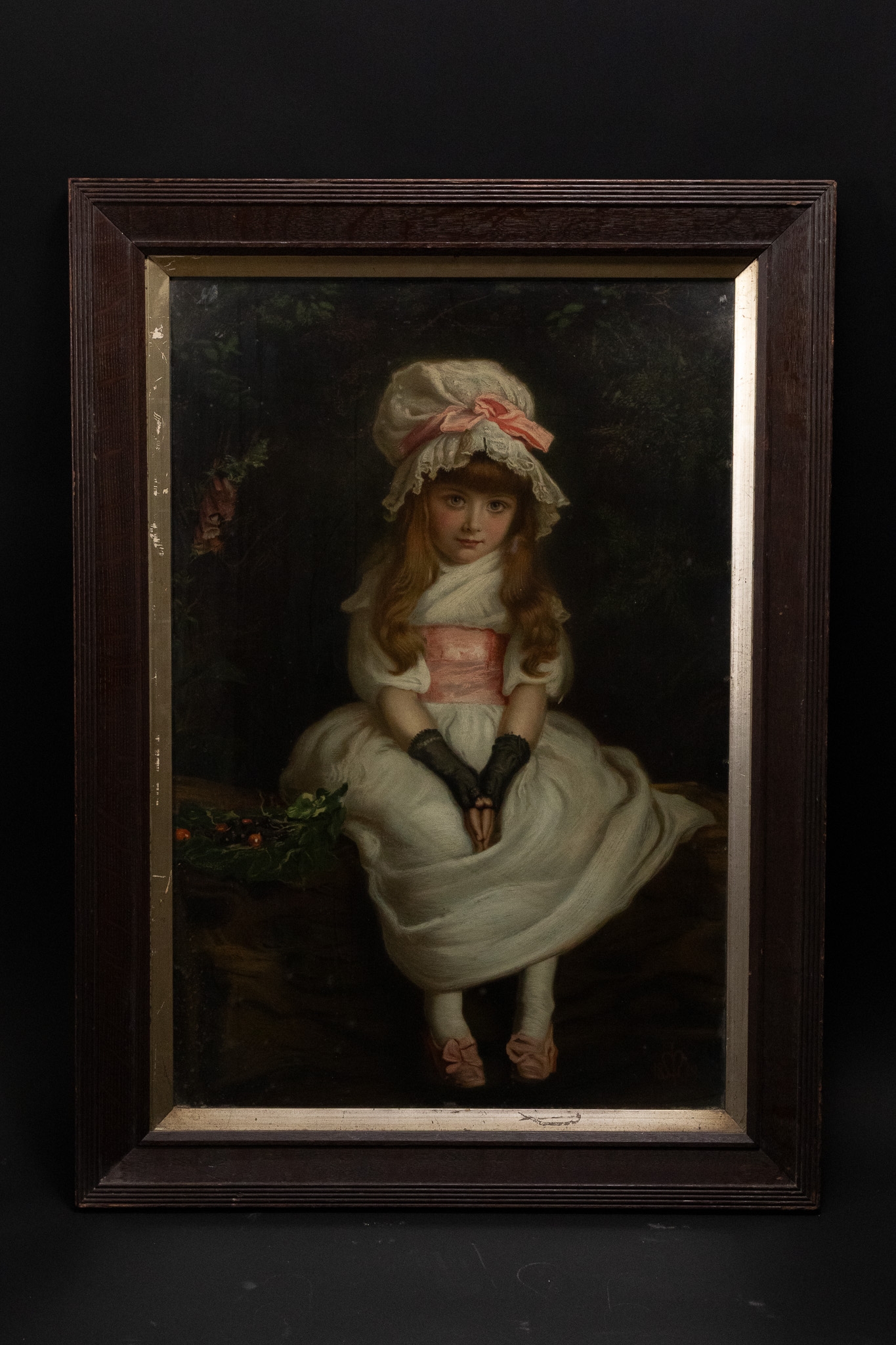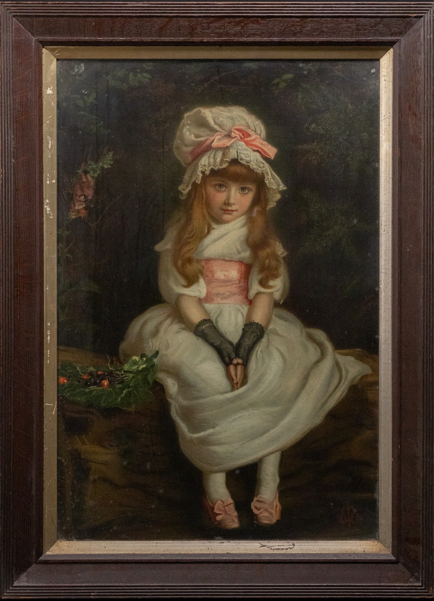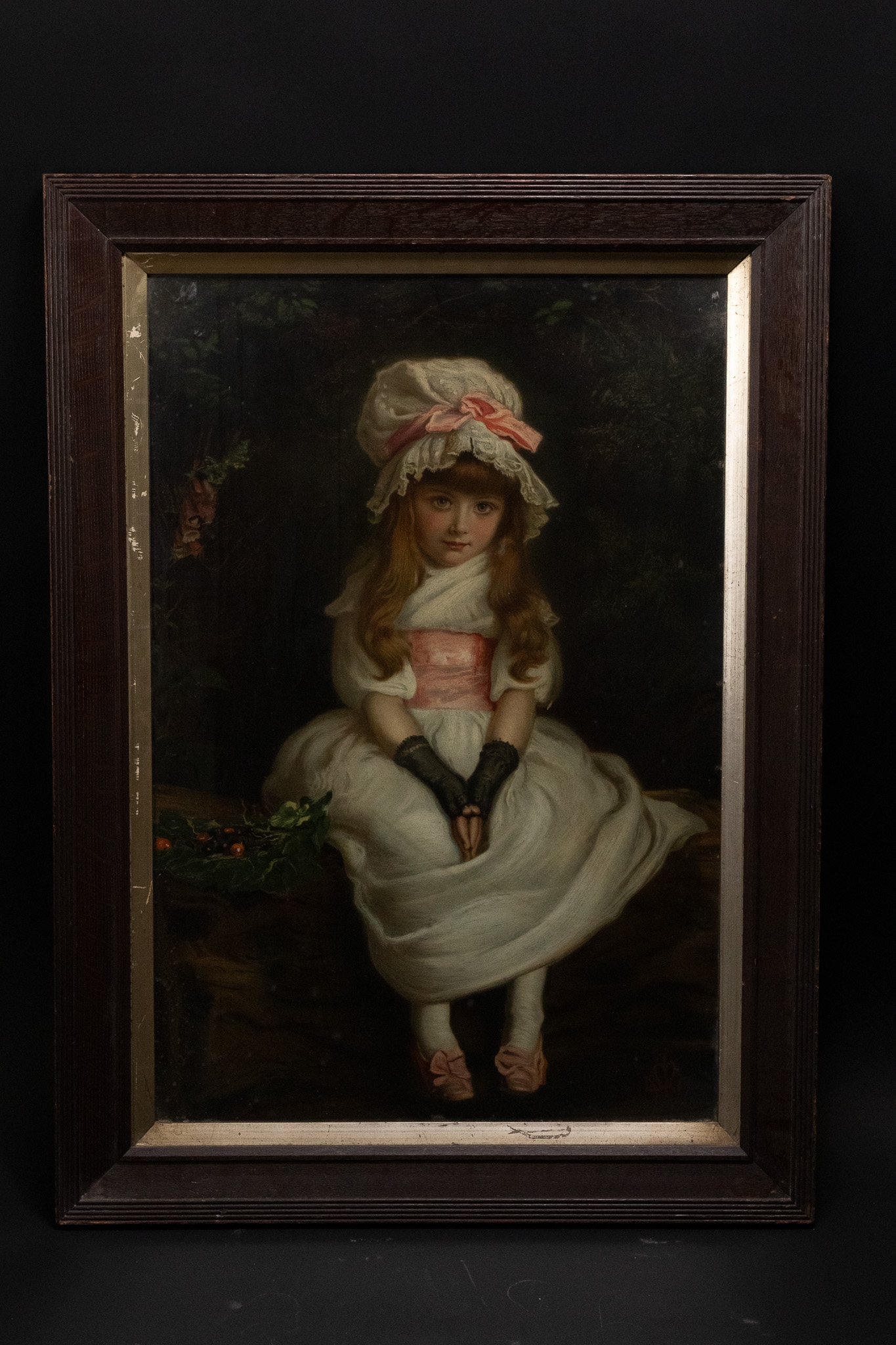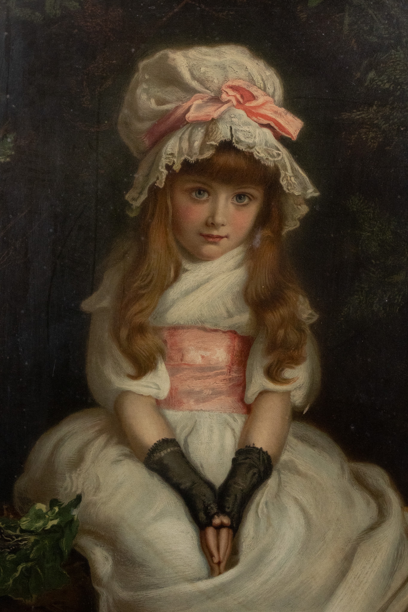 A finely executed 19th-century Continental lithograph depicting a seated young girl in period attire. The subject is portrayed wearing a soft white dress accented with a pale pink sash, matching shoes, and a bonnet trimmed with lace and ribbon. She sits delicately upon a rustic bench, her hands folded demurely in her lap, set against a dark wooded backdrop.