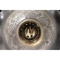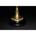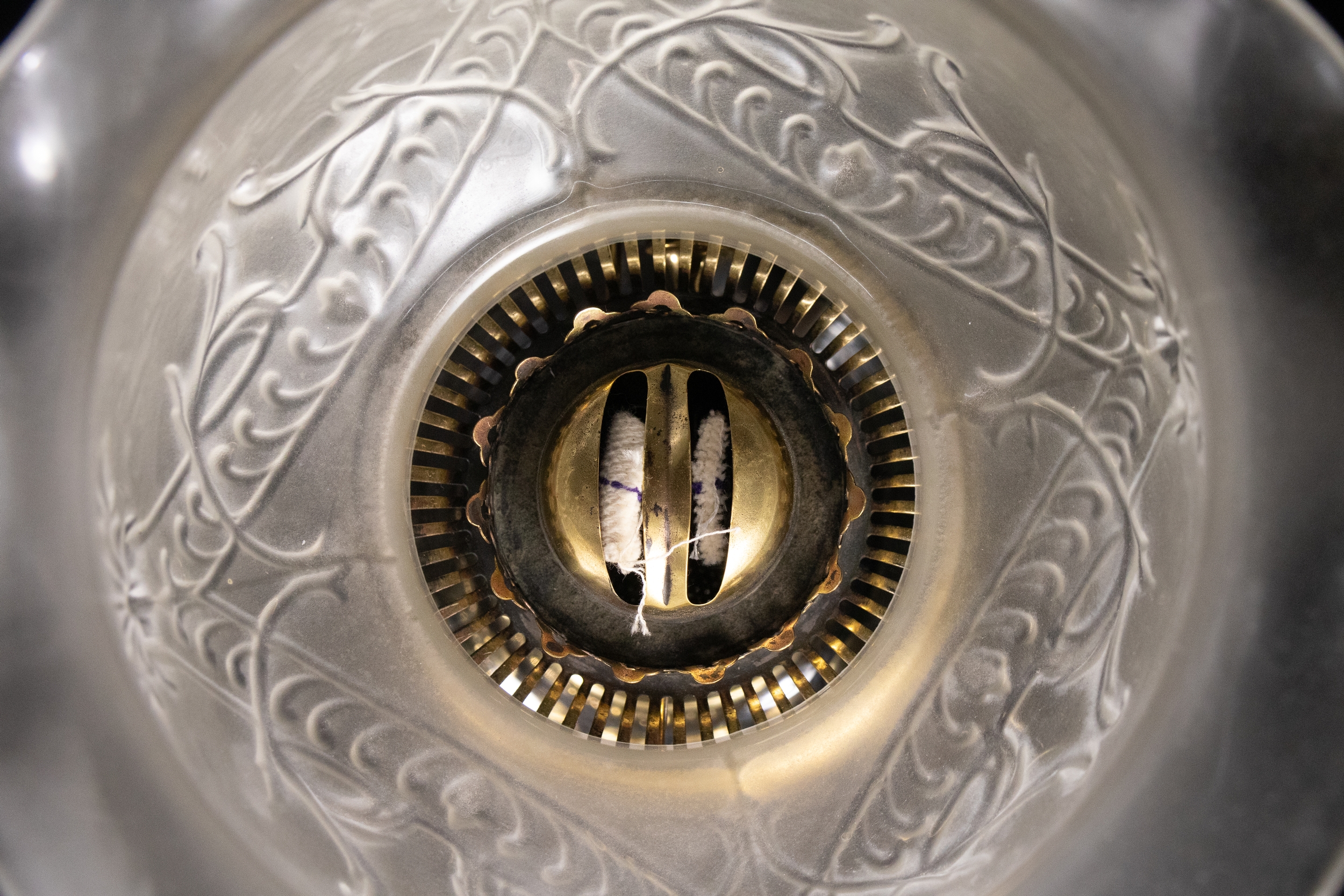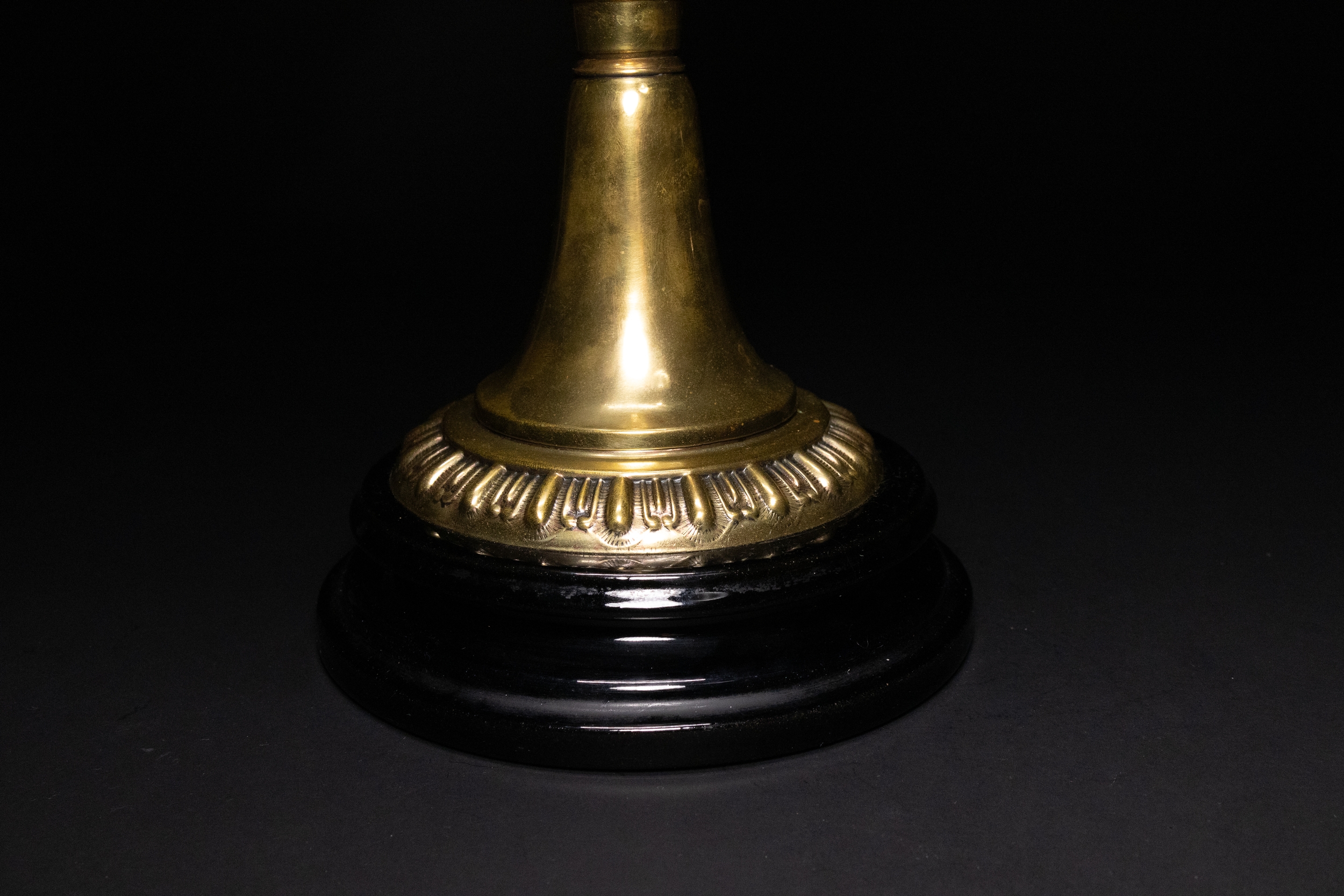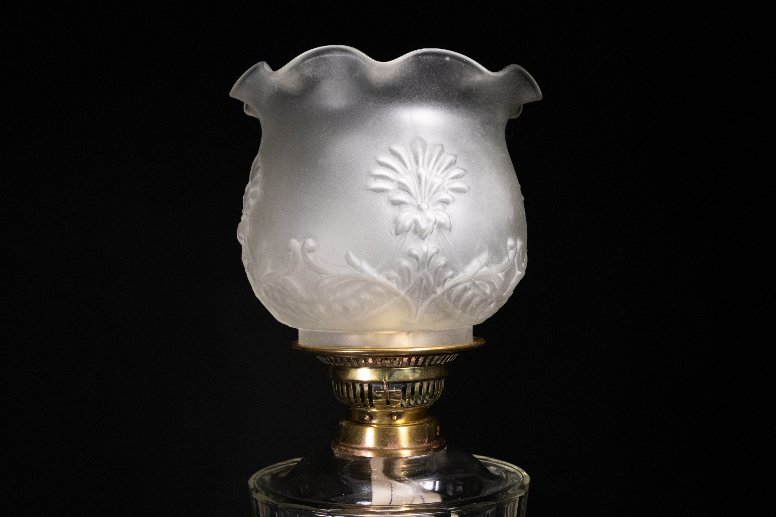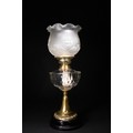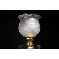 An opaline and brass table lamp, composed of a tiered structure resting on a glossy black circular base. The lower body features a ribbed glass oil reservoir mounted on an ornate polished brass support. Crowned with a delicately frosted glass shade, the top is decorated with embossed floral and foliate motifs, including prominent palmette designs.