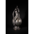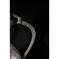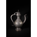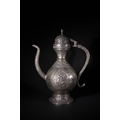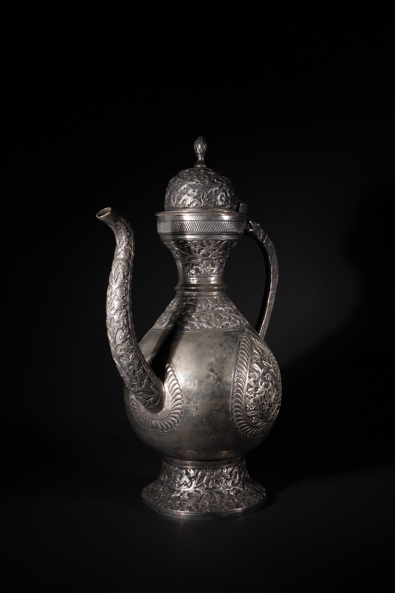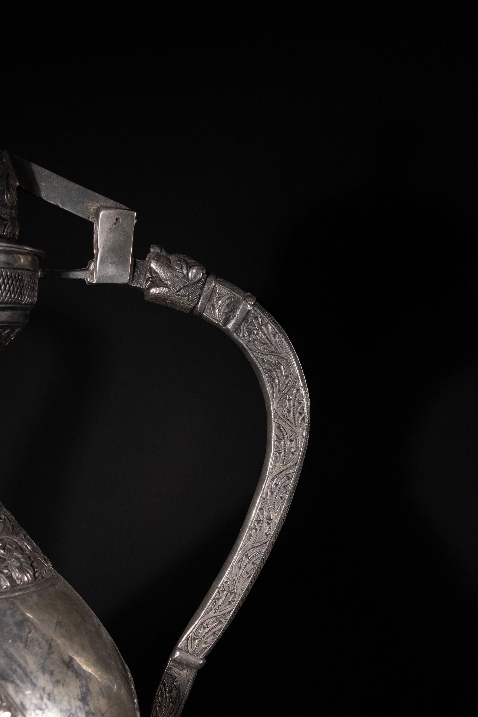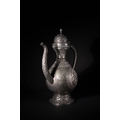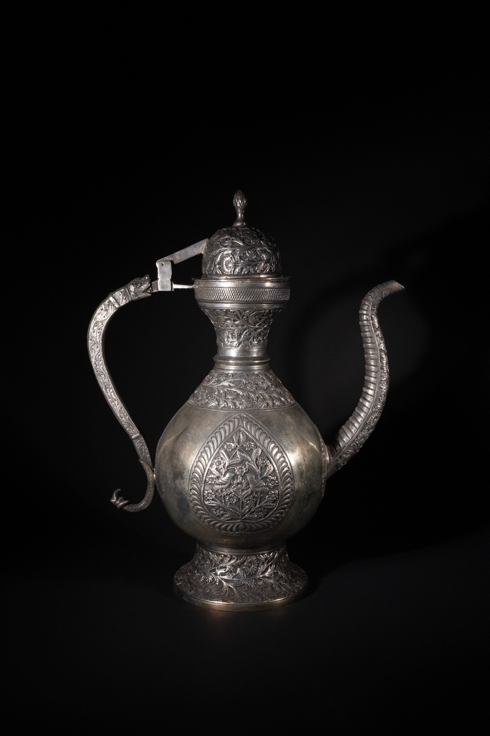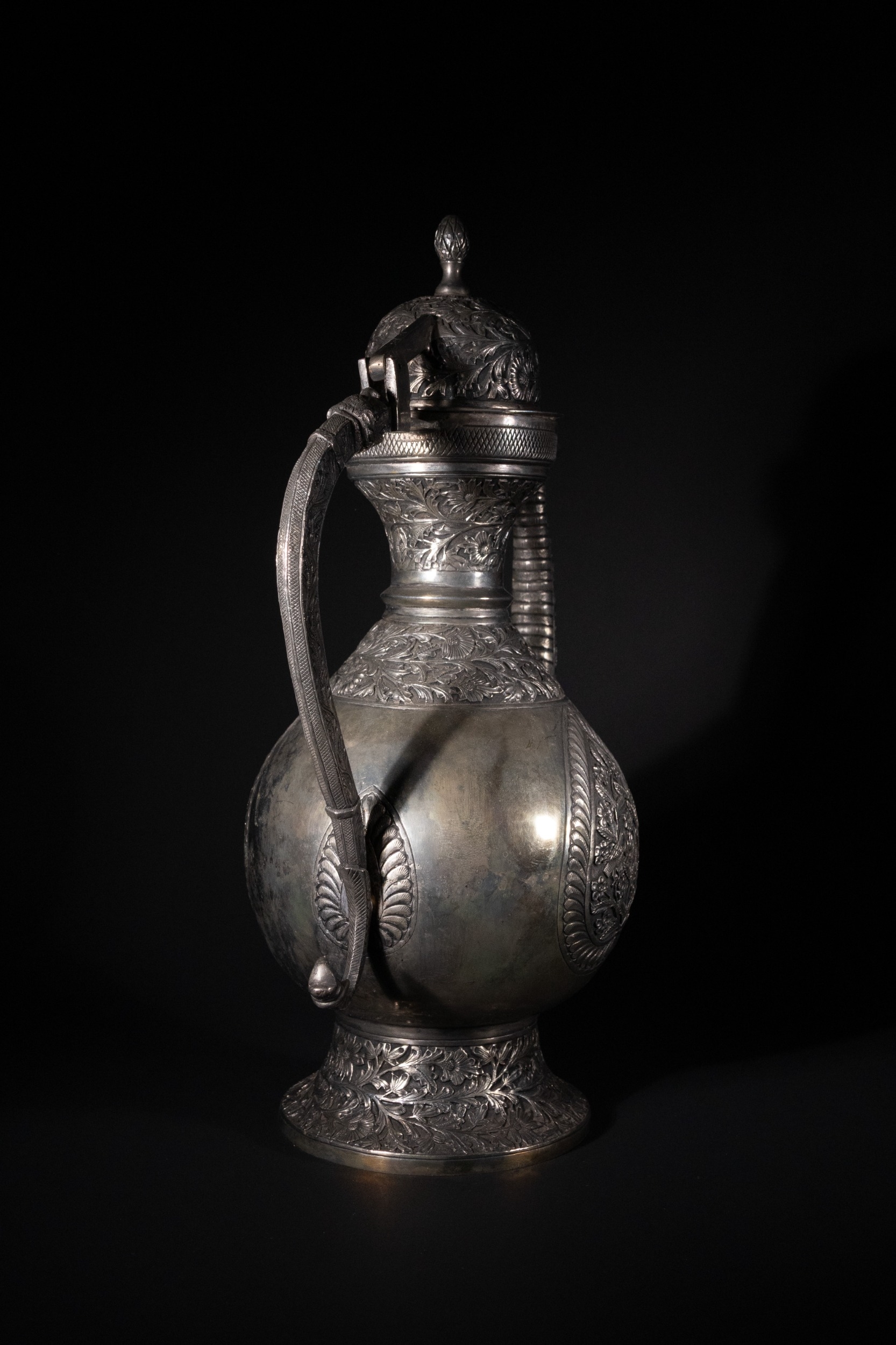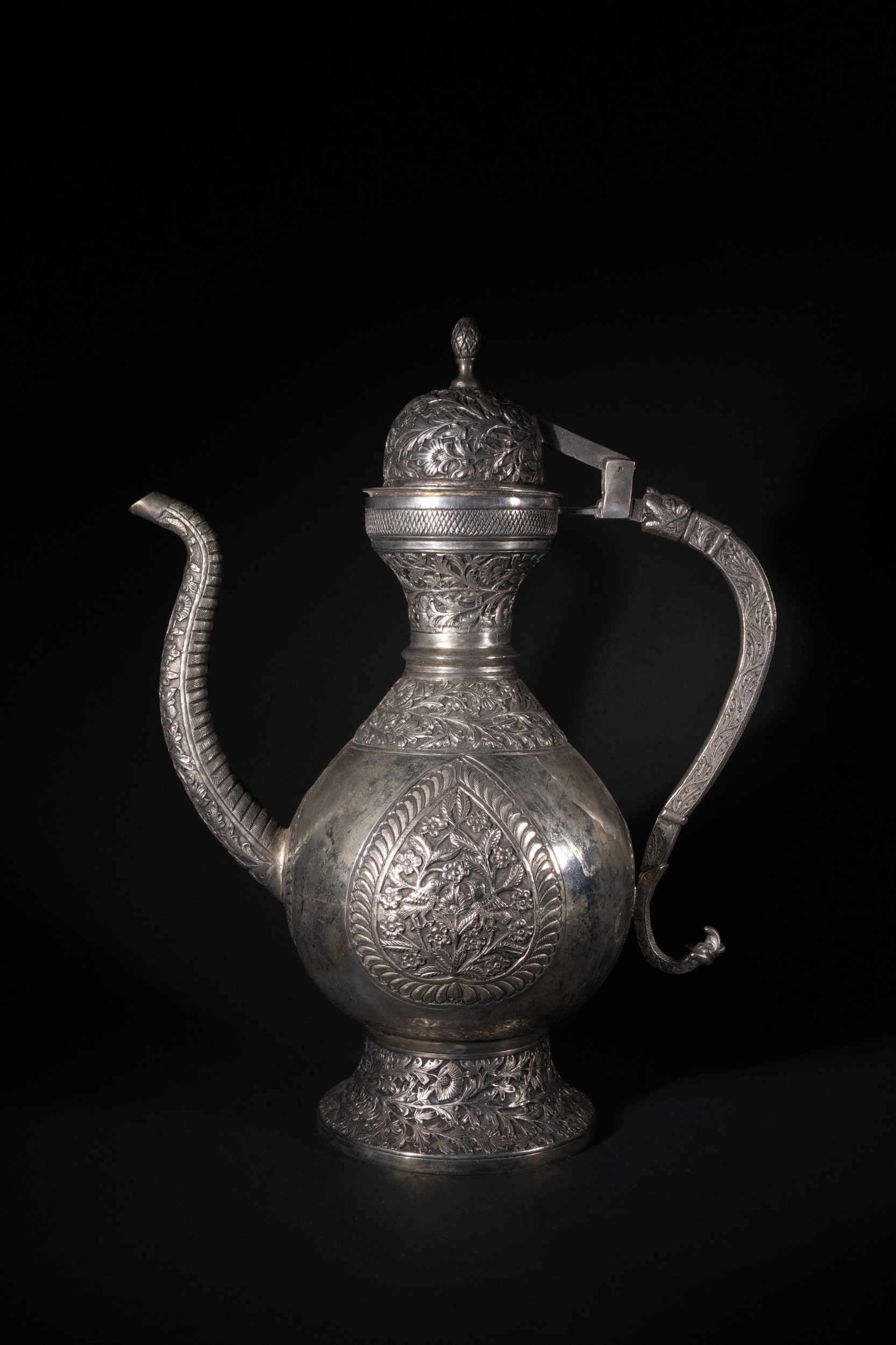 A Indo-Persian White Metal Ewer - This elaborately decorated ewer features a bulbous body, a slender S-shaped spout with a ribbed texture, and a curved handle terminating in a stylized animal head where it joins the neck. Its surface is extensively adorned with intricate repoussé and chased decoration, including floral and foliate scrollwork prominently displayed within teardrop-shaped cartouches on the main body. Geometric banding is present on the neck, lid, and footed base. The domed lid is topped with a decorative finial, also featuring floral motifs.