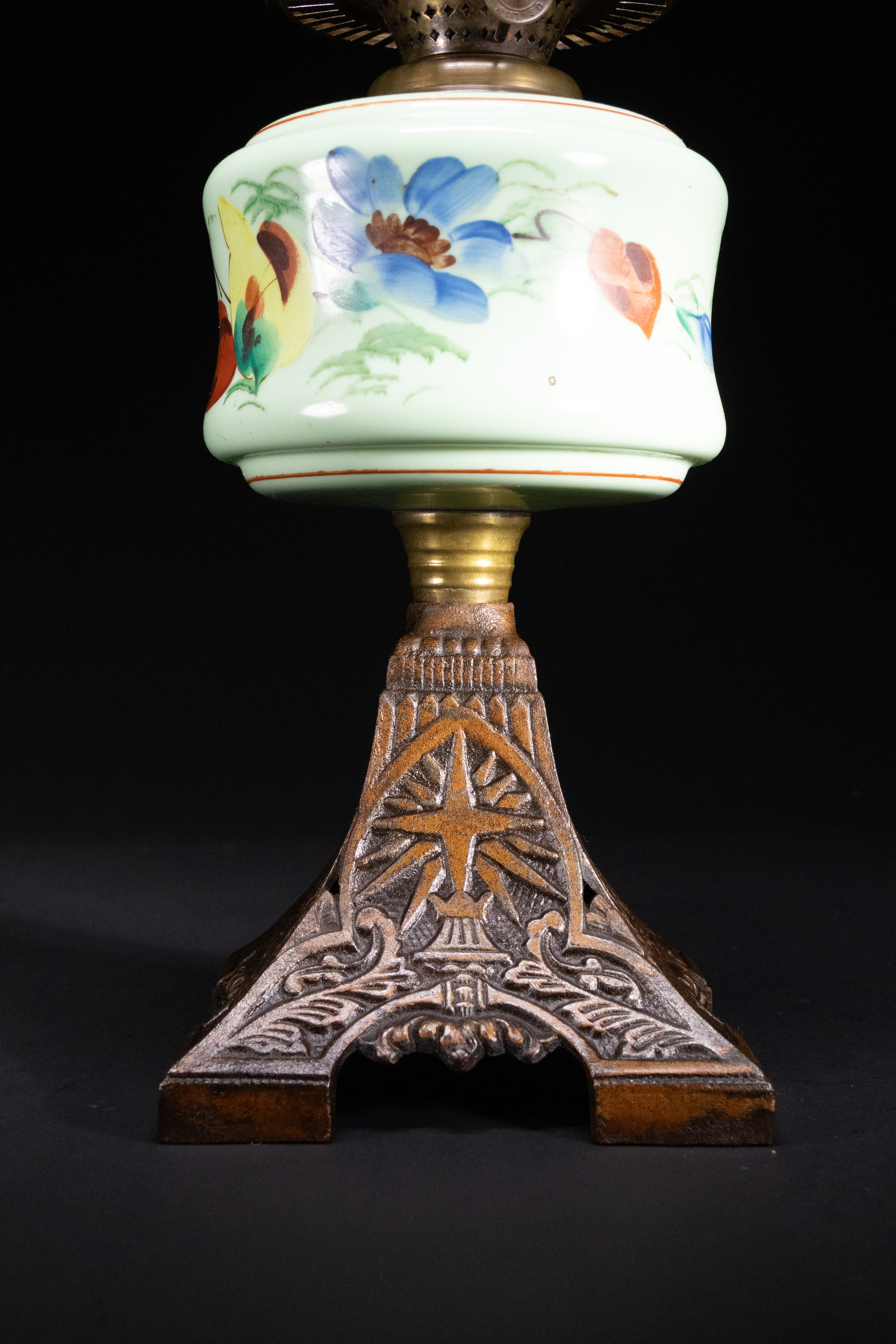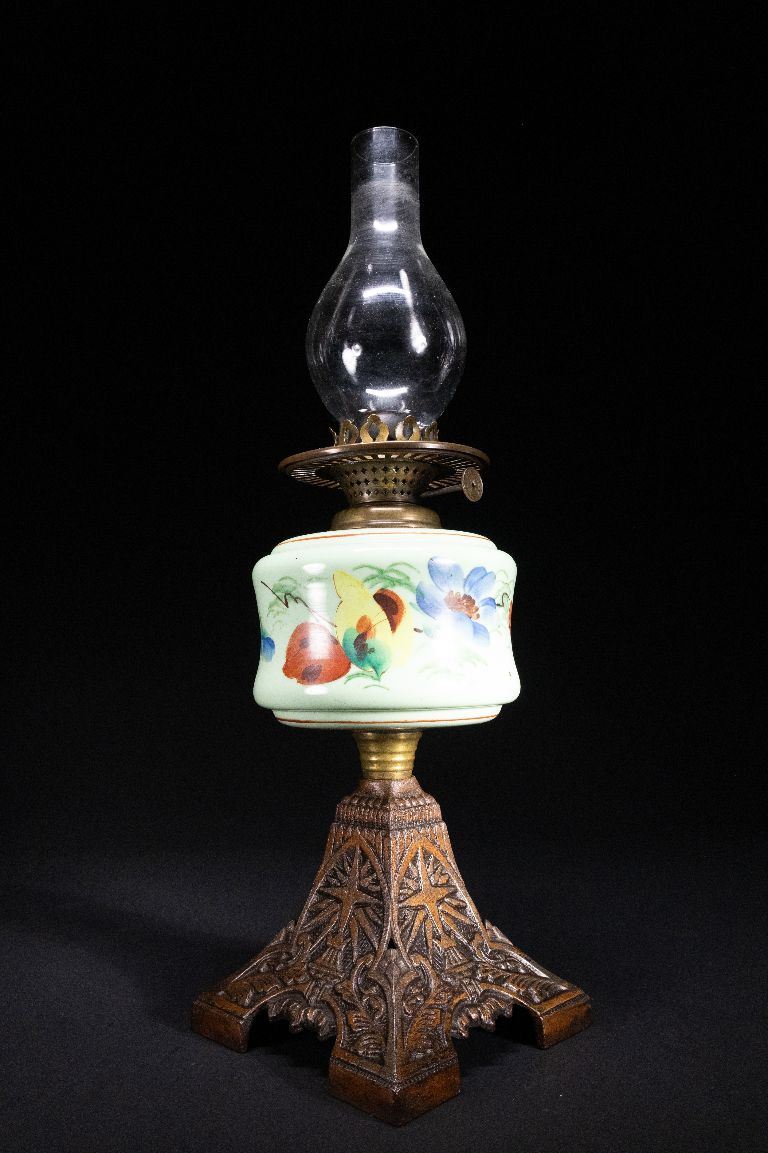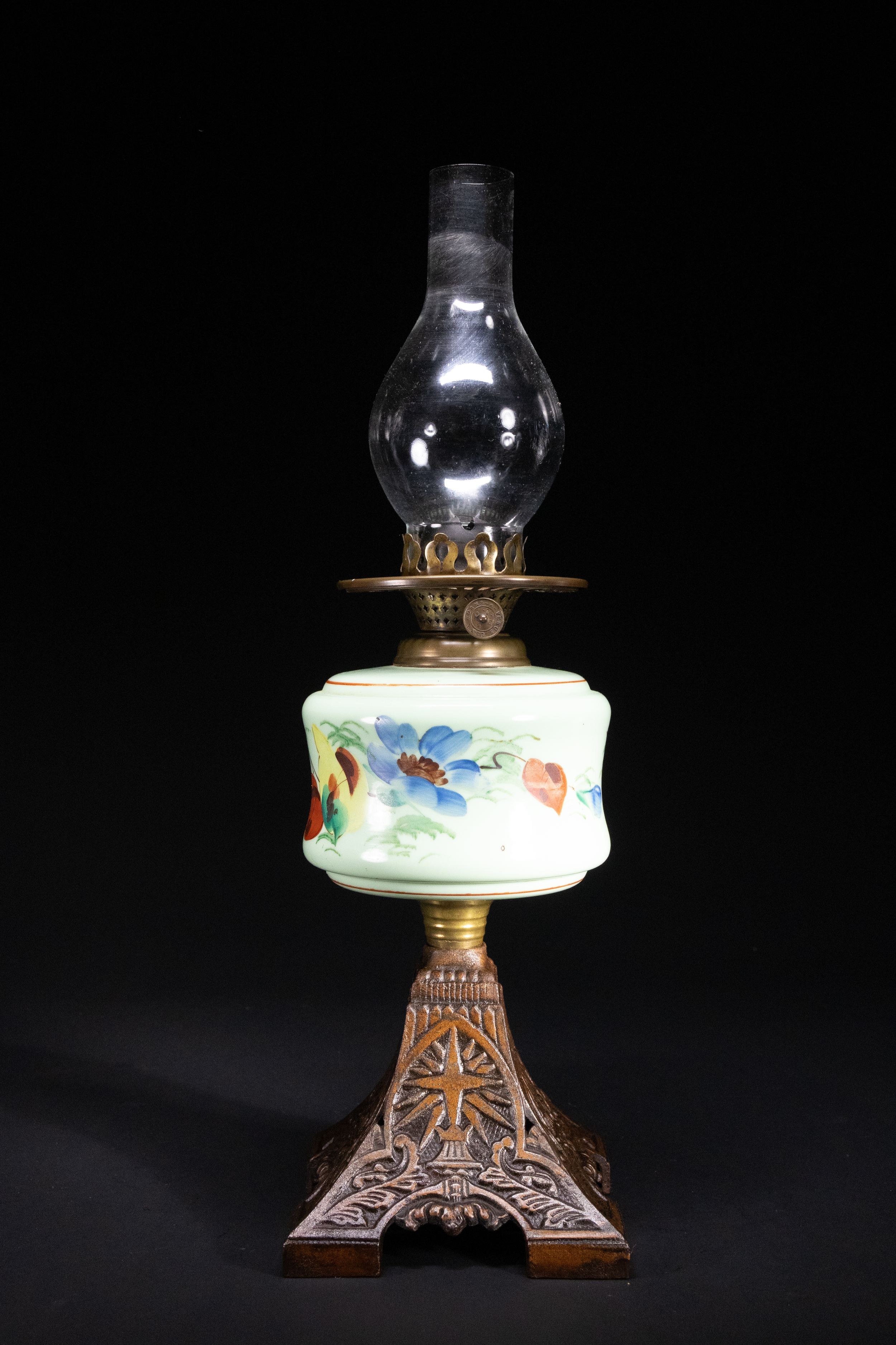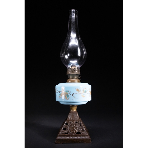 An oil lamp featuring a hand-painted opaline glass font decorated with vivid butterflies and blue floral motifs on a pale mint ground. The lamp is topped with a clear glass chimney and mounted on an ornate cast iron base with embossed foliate and starburst motifs.