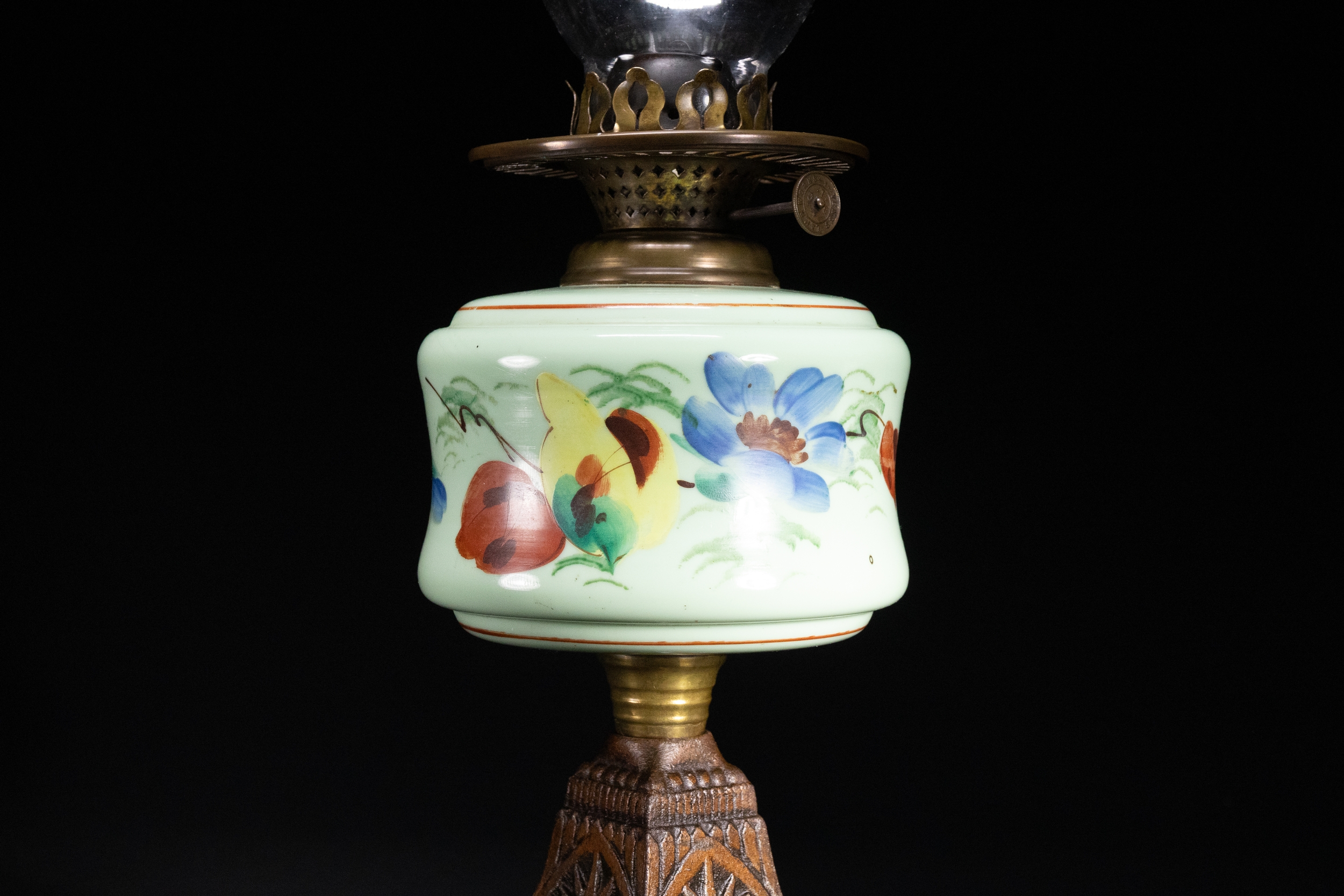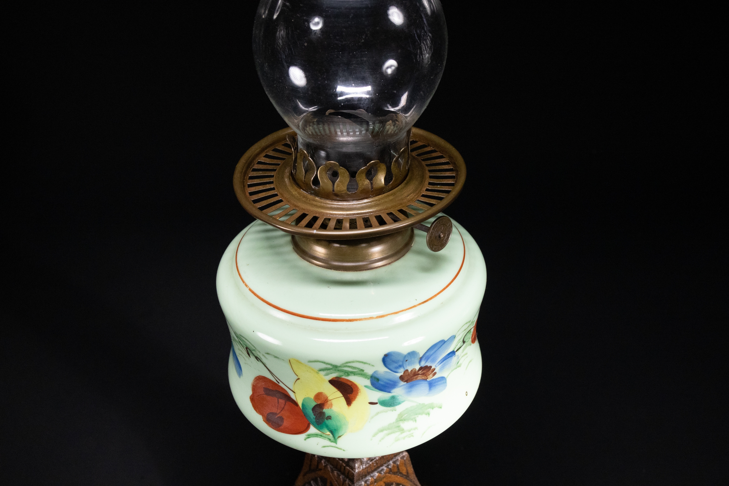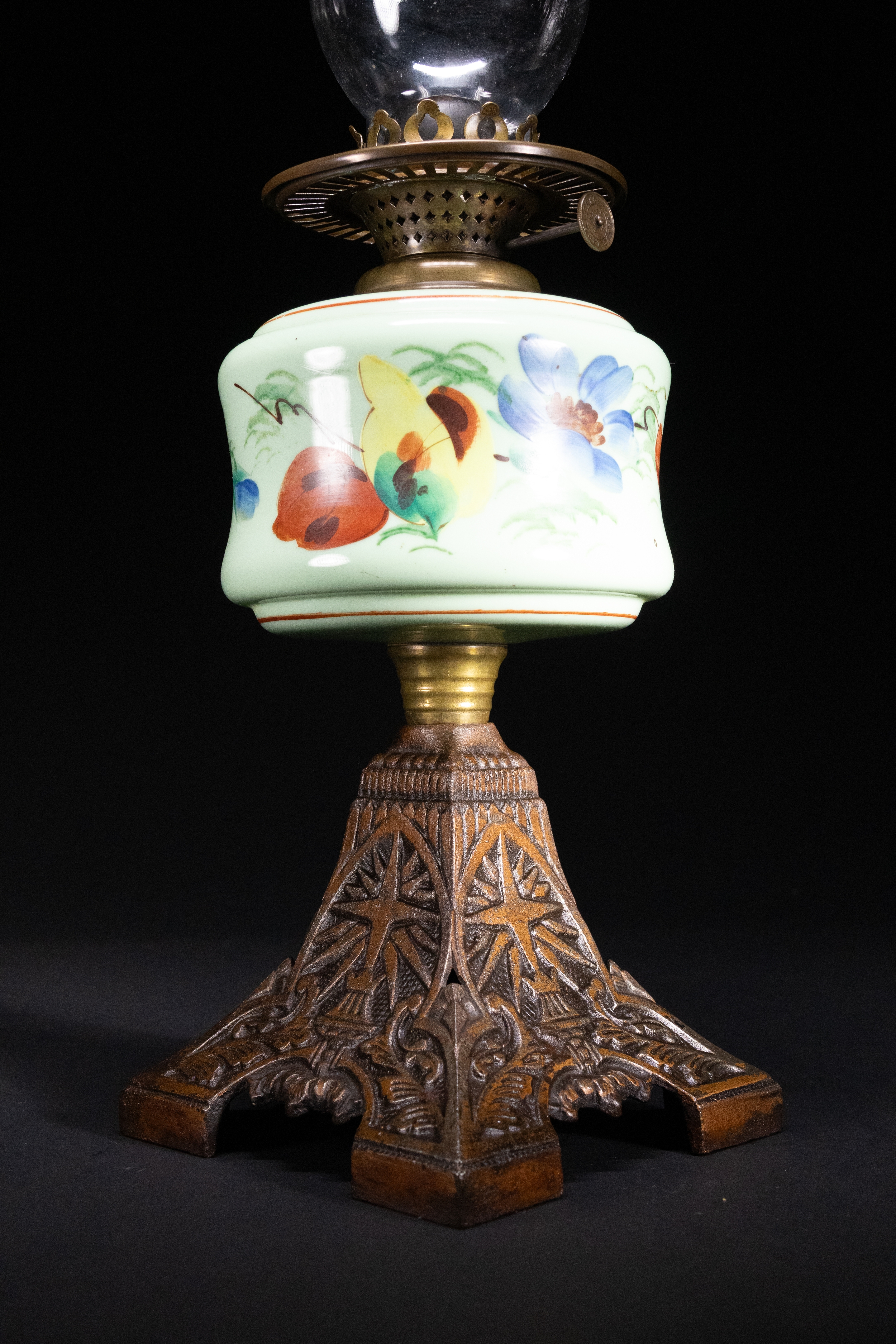 An oil lamp featuring a hand-painted opaline glass font decorated with vivid butterflies and blue floral motifs on a pale mint ground. The lamp is topped with a clear glass chimney and mounted on an ornate cast iron base with embossed foliate and starburst motifs.