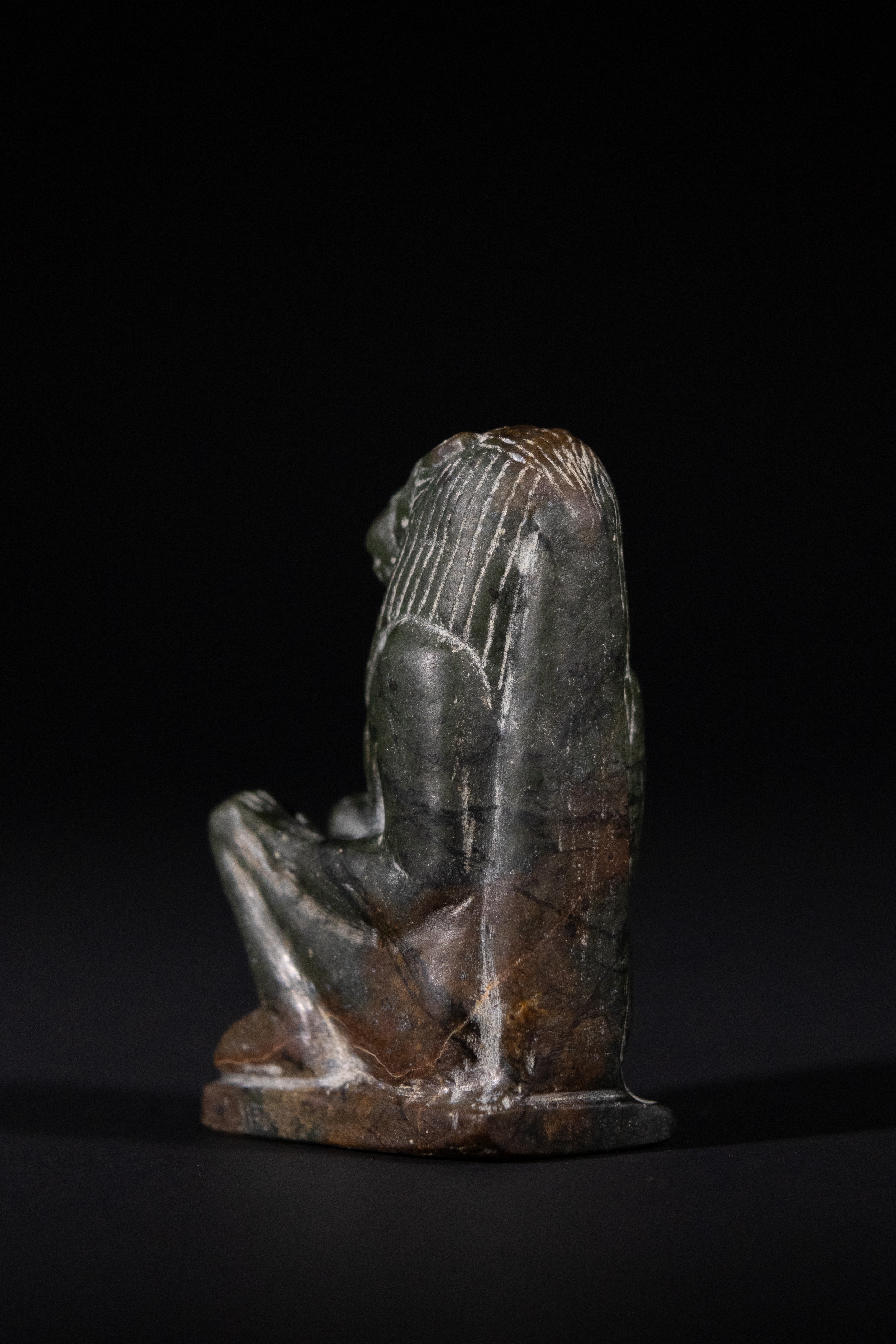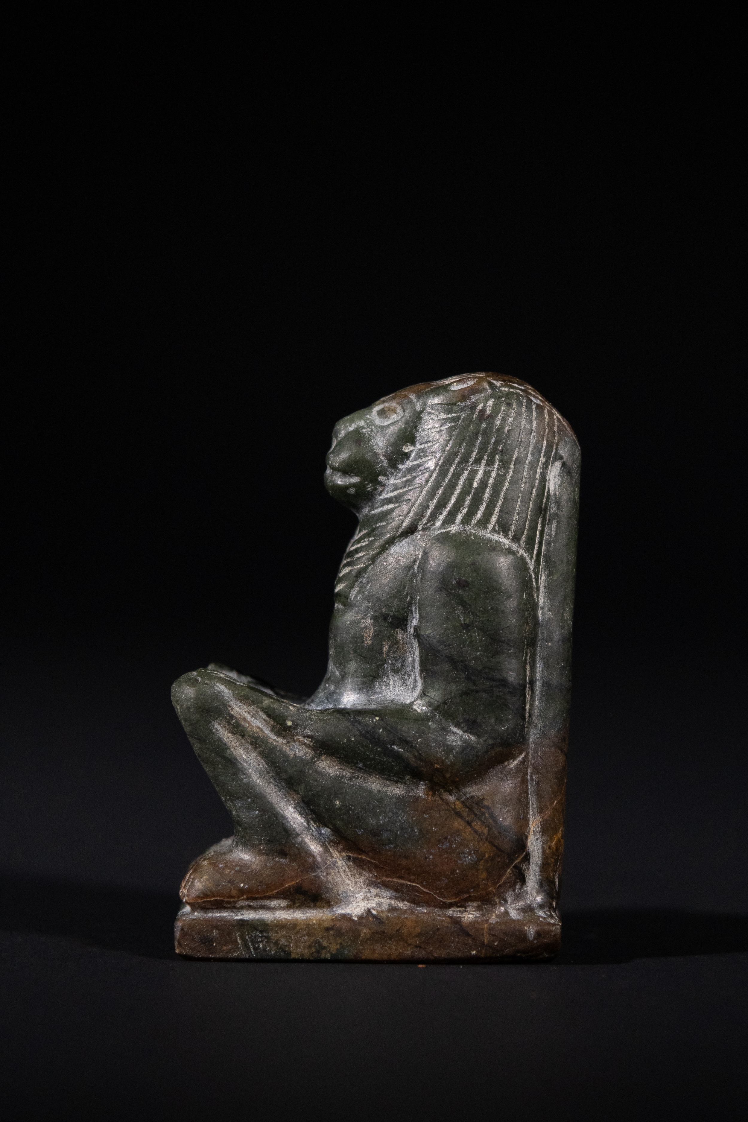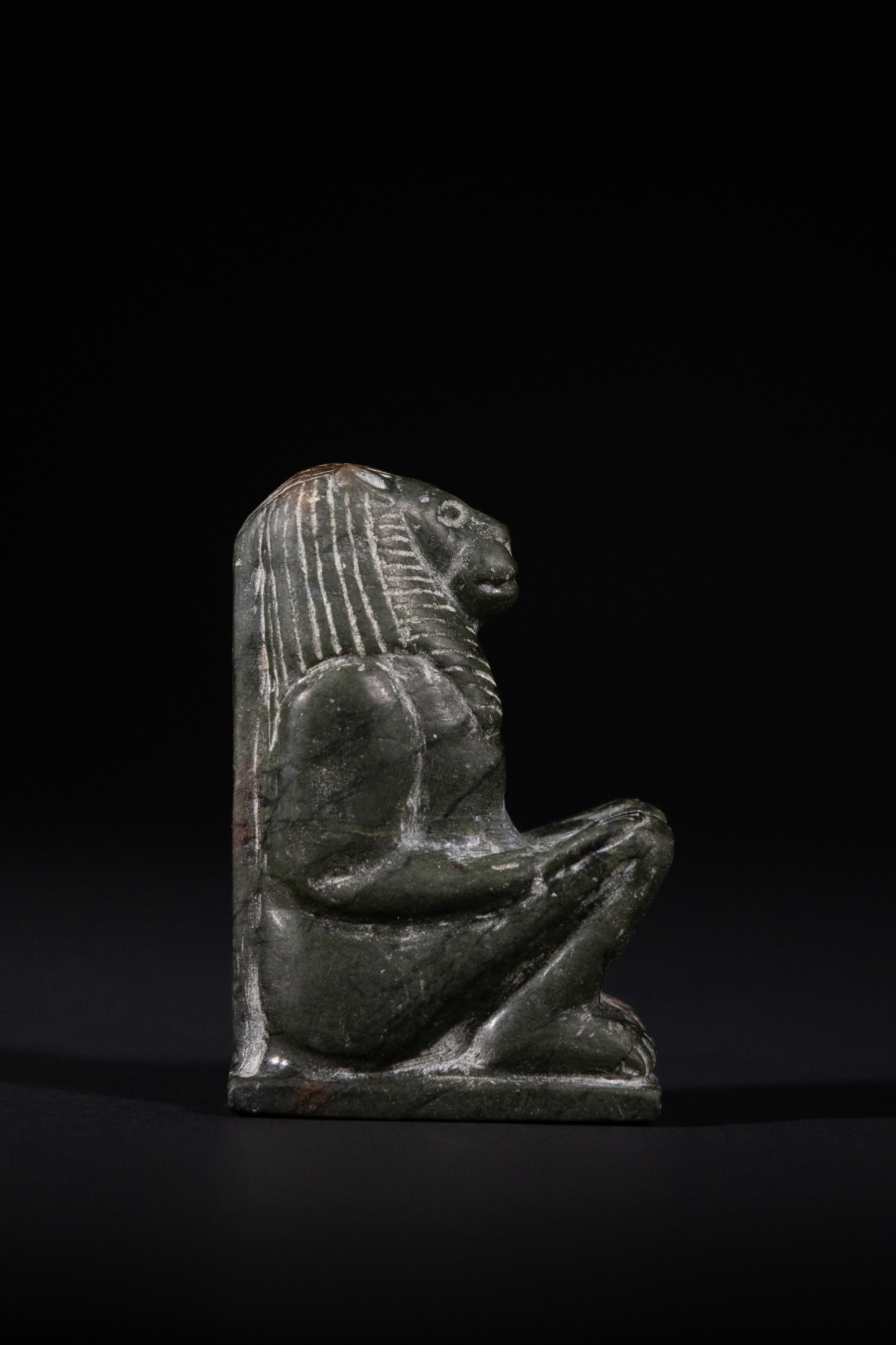 Carved from dark green granite, the figure depicts a lion-headed deity seated with knees drawn up and arms resting upon them. The head is detailed with incised mane striations and outlined facial features, enhancing the leonine form. The body is muscular and compact, positioned on a rectangular base. The reverse is flat, suggesting it may have served as a votive or temple piece.