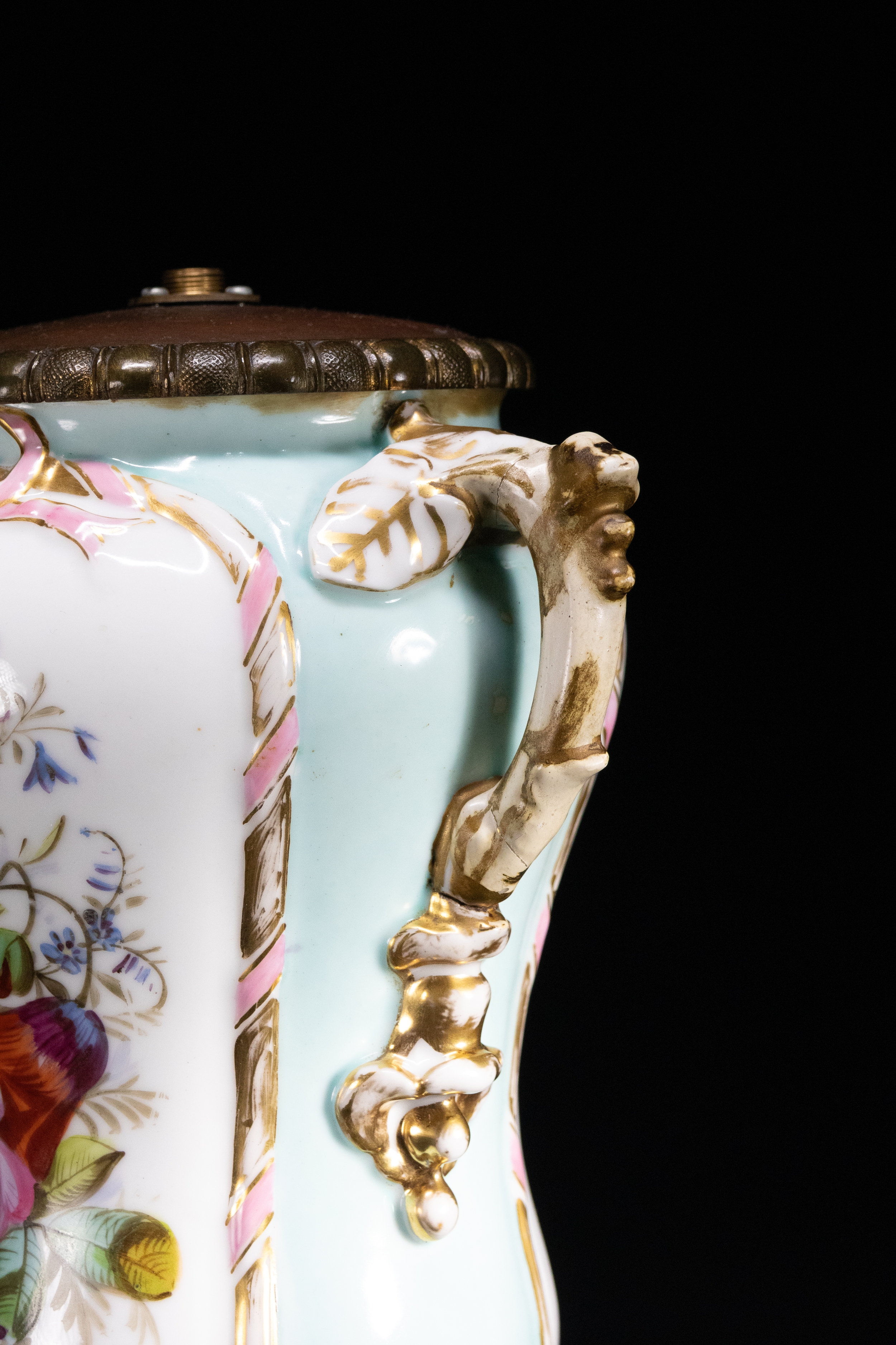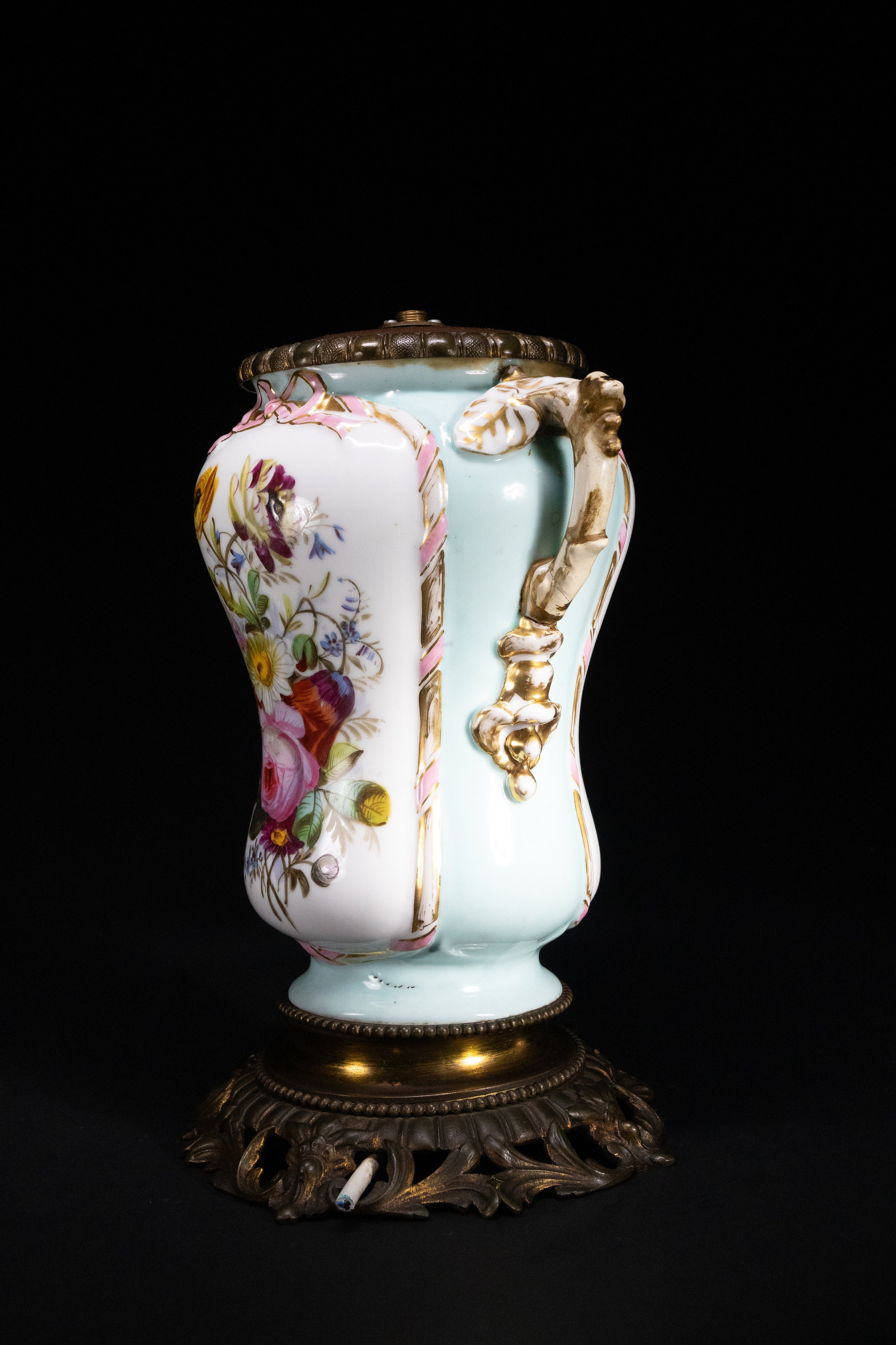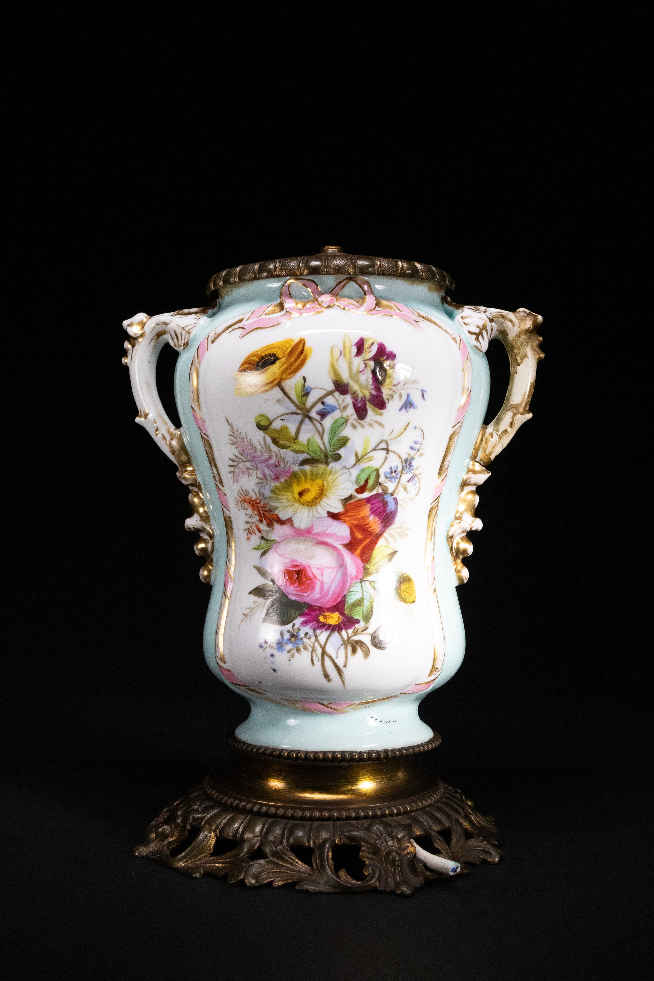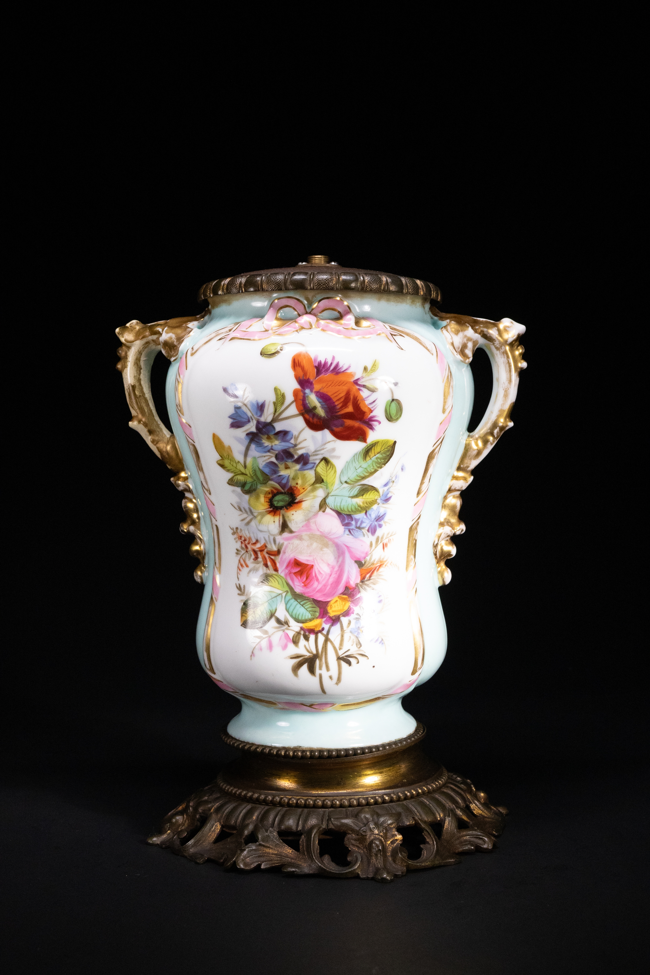 A French porcelain oil lamp base, adorned with vibrant hand-painted floral bouquets on a white ground with soft turquoise framing. The body is flanked by twin ornate handles with gilt detailing and Rococo-style relief work. The piece is mounted on an elaborately cast gilt-bronze (ormolu) base with scrolling acanthus motifs.