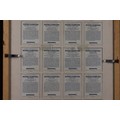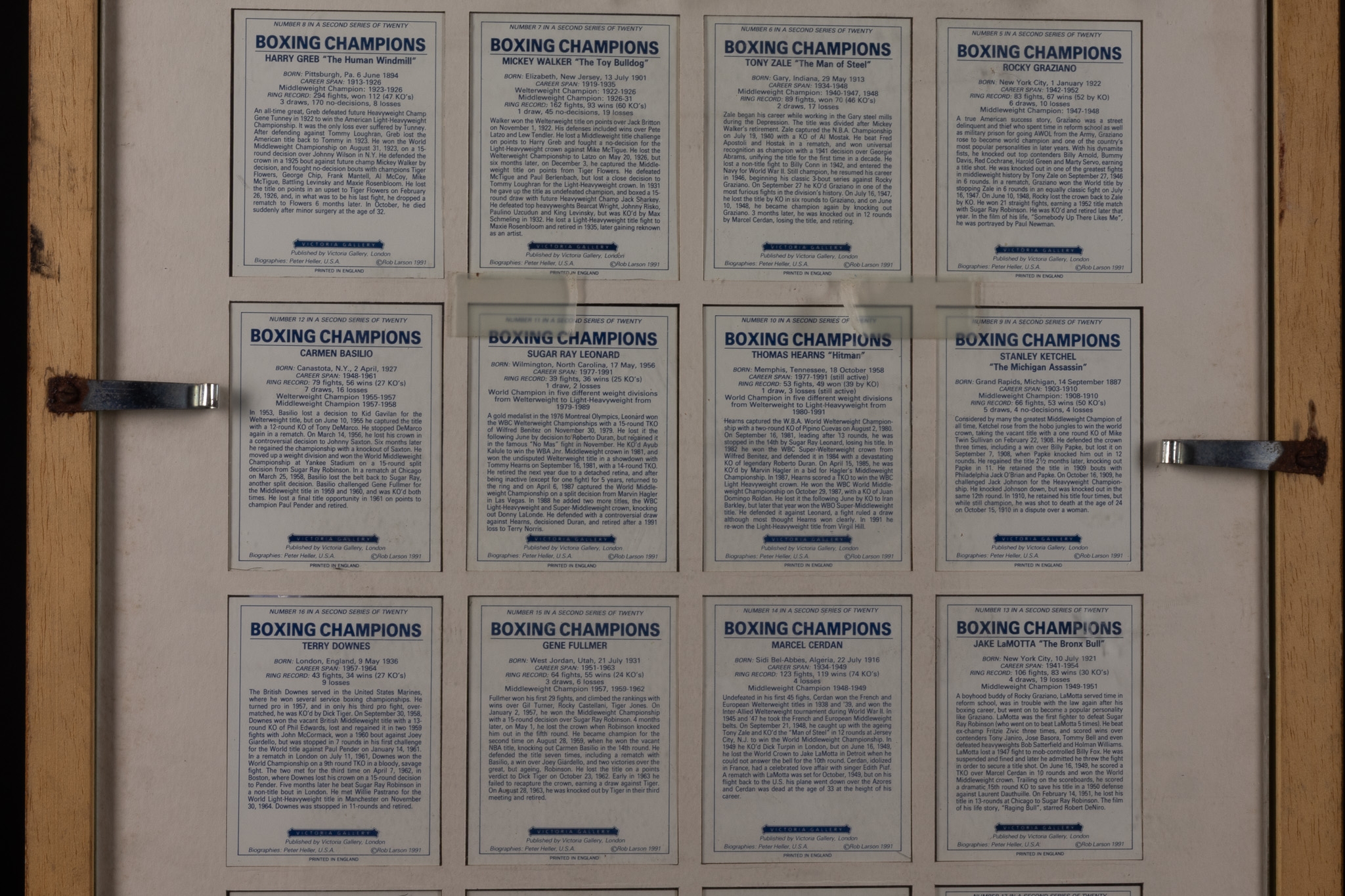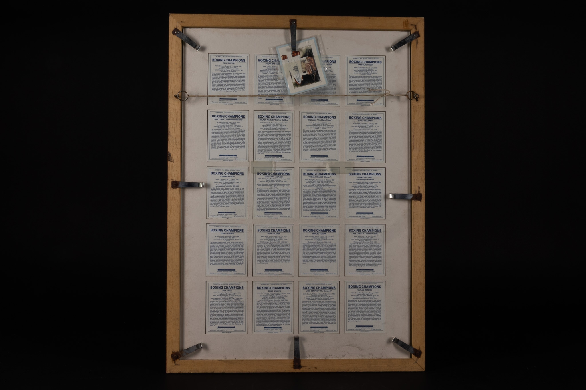 A framed display comprising a complete grid of illustrated boxing champions trading cards, each card featuring a stylised portrait of a renowned boxer depicted with gloves and fighting stance. The cards are uniformly mounted against a dark ground within a wooden frame with a gilt inner border, creating a cohesive and visually striking presentation. The reverse of the frame reveals the printed biographical text panels corresponding to each card.