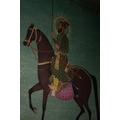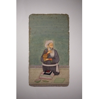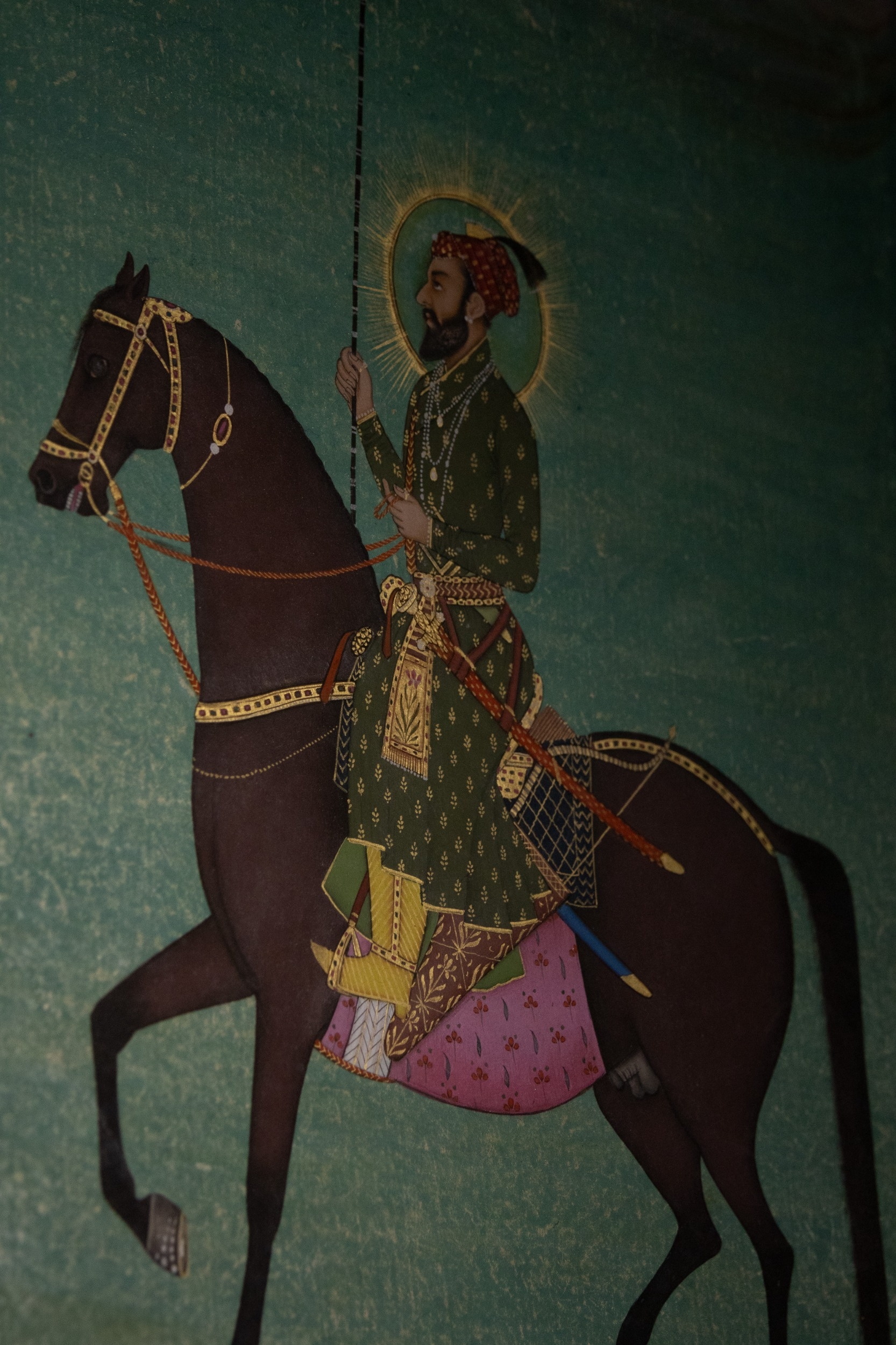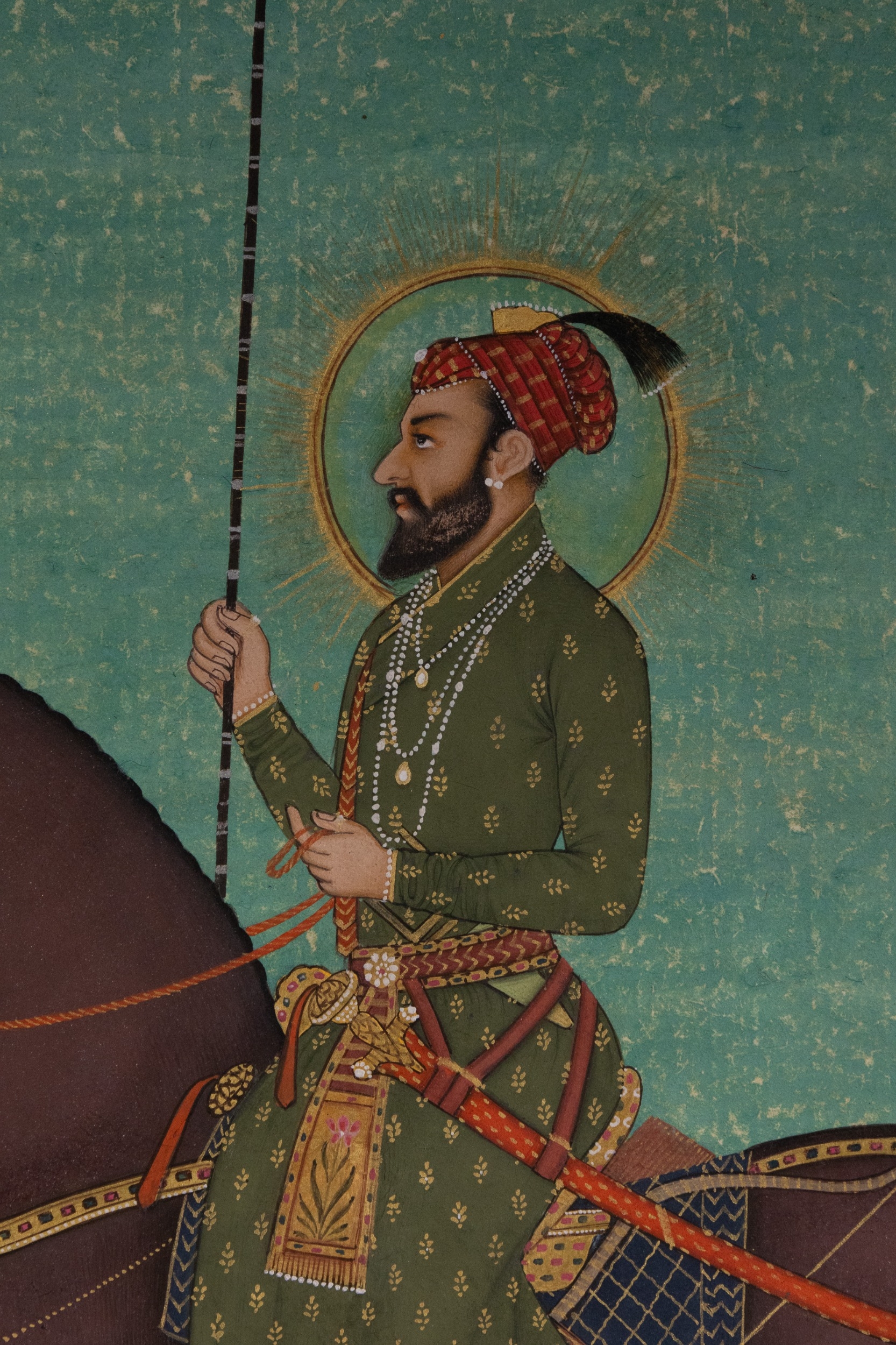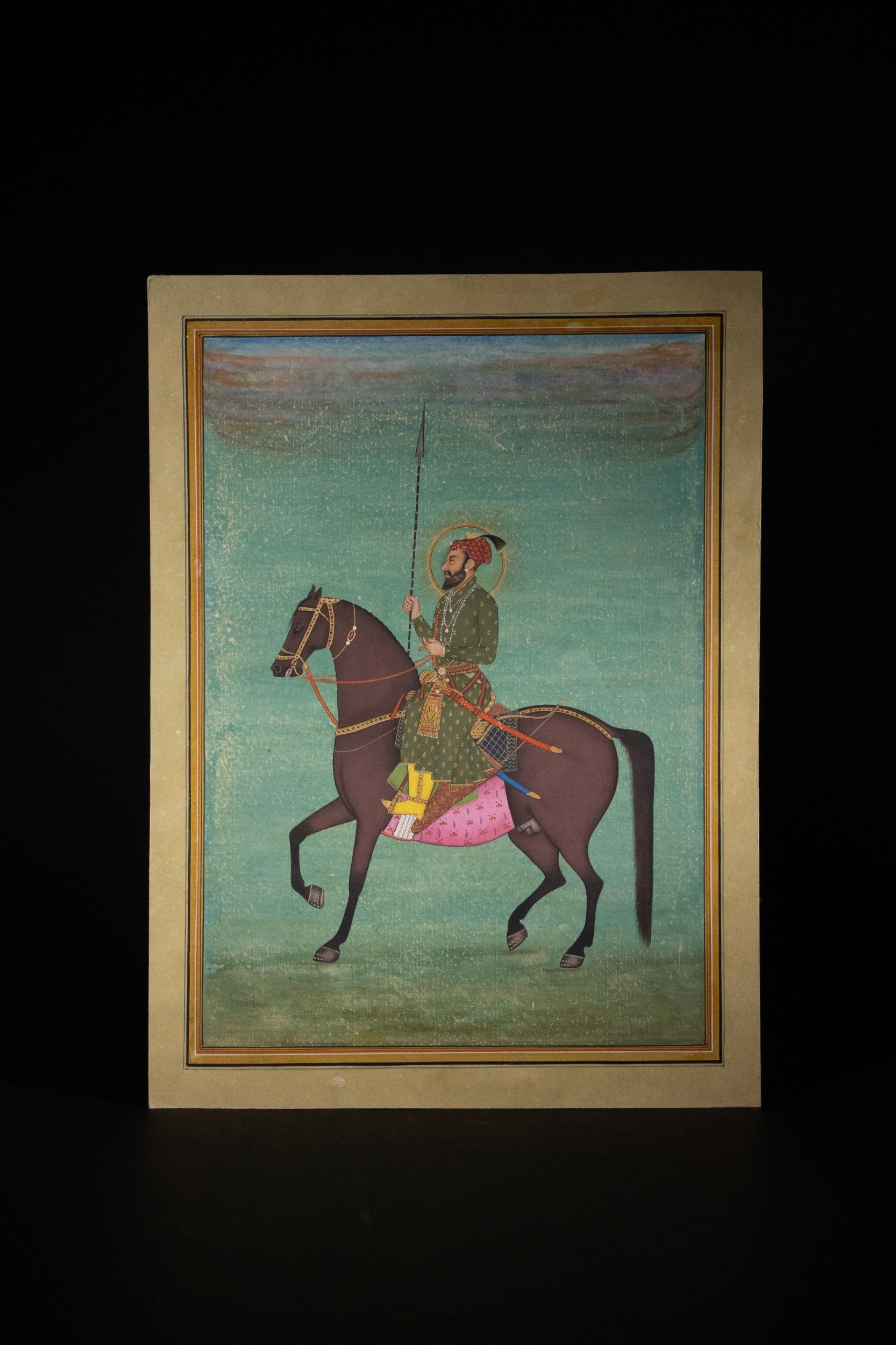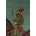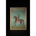 A Rajput or Mughal Equestrian Portrait of Raja Abhay Singh, 18th/19th Century - An Indian miniature painting on paper, depicting Raja Abhay Singh on horseback. The regal male figure is rendered in vibrant opaque pigments against a plain greenish-blue ground. Adorned with a turban, olive green jama, multiple pearl necklaces, and holding a spear, the figure features a gold halo, indicative of royalty or divinity. Text visible on the pink saddlecloth identifies the rider as 'Raja Abhay Singh' (राजा अभय सिंह), situating the piece stylistically within the 18th/19th-century Rajput or Mughal tradition.