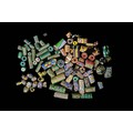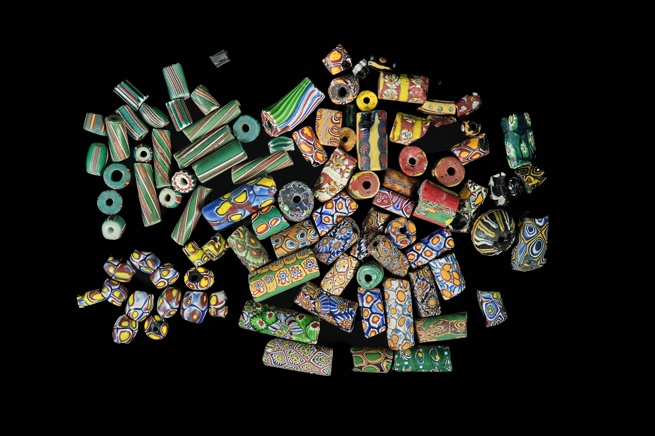A colourful and varied assortment of Millefiori glass beads, featuring a wide range of forms including cylindrical, barrel, rounded, and angular pieces. The group displays rich combinations of patterned canes in vibrant tones of green, yellow, blue, red, and white. Many beads show intricate floral rosettes, geometric tessellations, striped bands, and layered mosaic designs. Together, they create a striking and visually diverse collection of decorative glass beads.