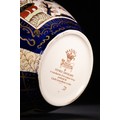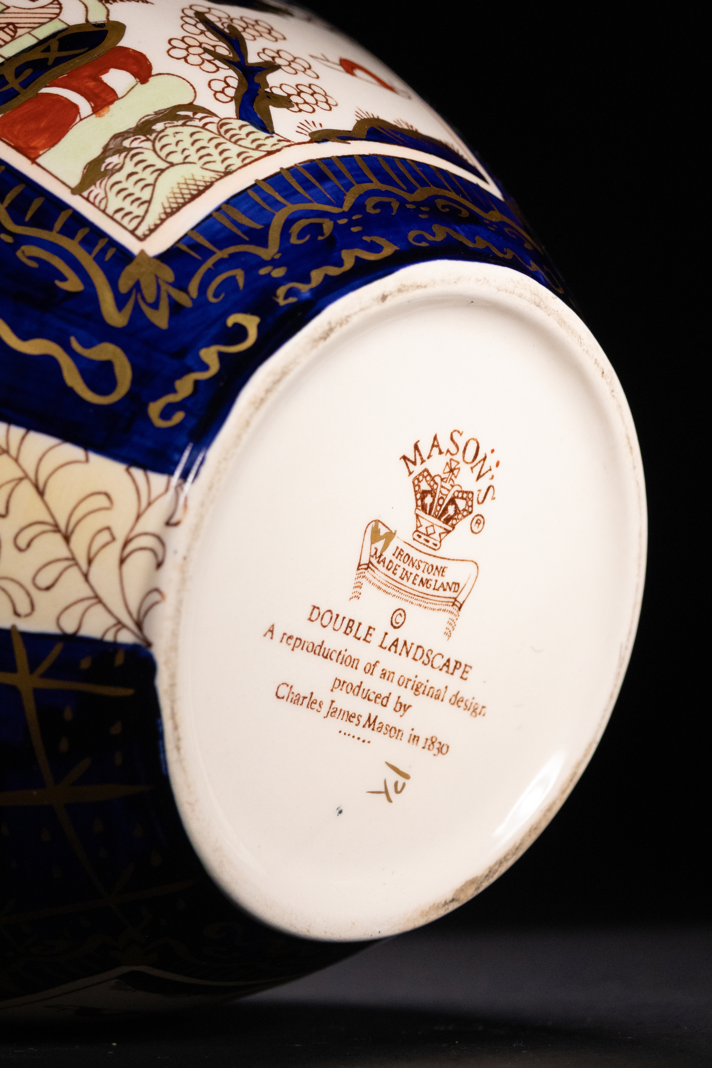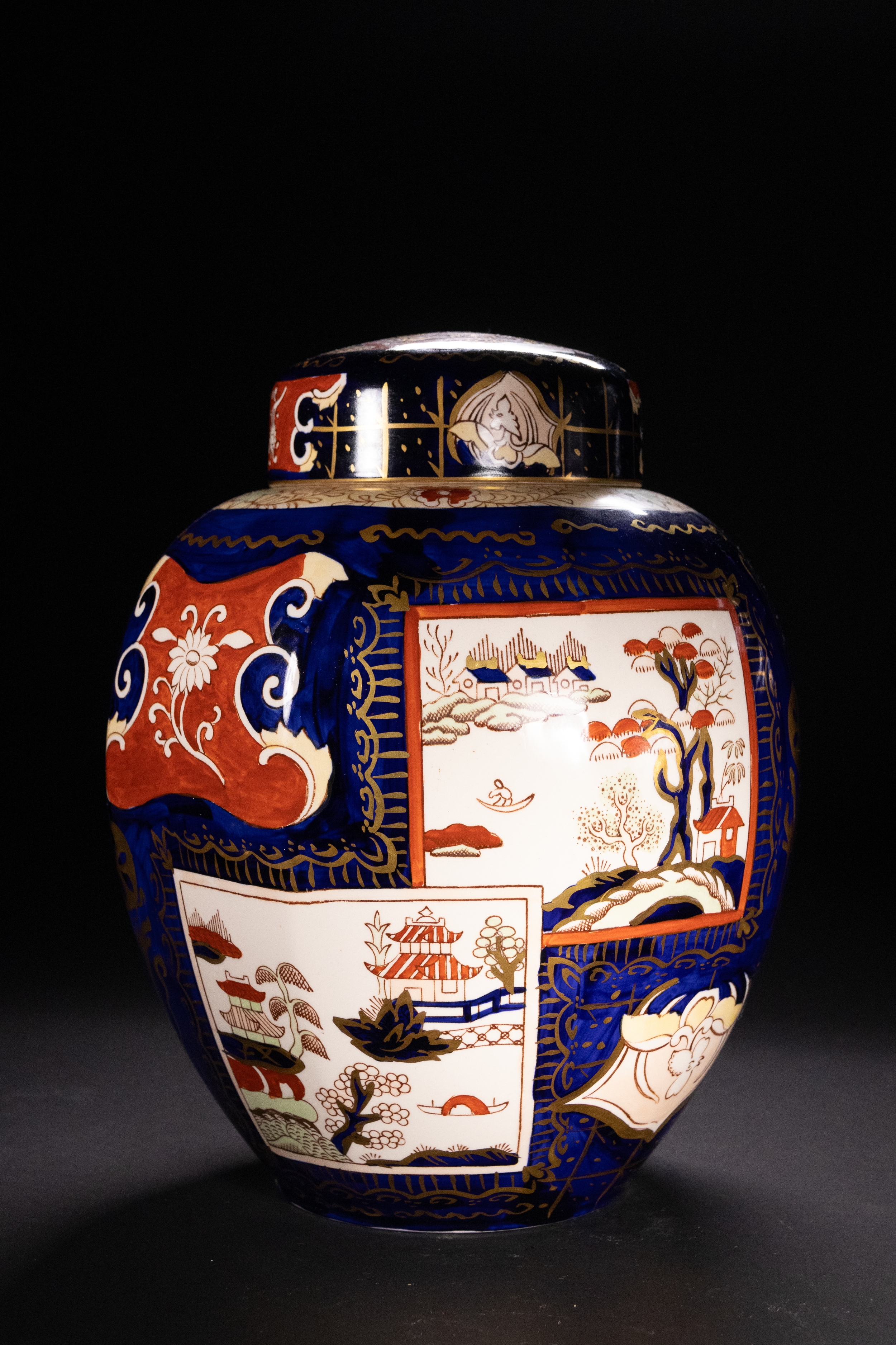 A finely decorated English ironstone ginger jar by Mason’s, featuring the vibrant ‘Double Landscape’ pattern. The bulbous form is adorned with alternating panels of traditional Chinese-inspired landscapes and stylised cartouches in a bold palette of cobalt blue, burnt orange, and gilded accents. The top band and lid mirror the intricate designs, culminating in a domed cover with matching decoration. The underside bears the Mason’s Ironstone mark and indicates this is a 20th-century reproduction of an original design by Charles James Mason, first produced in 1830.