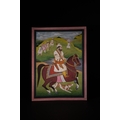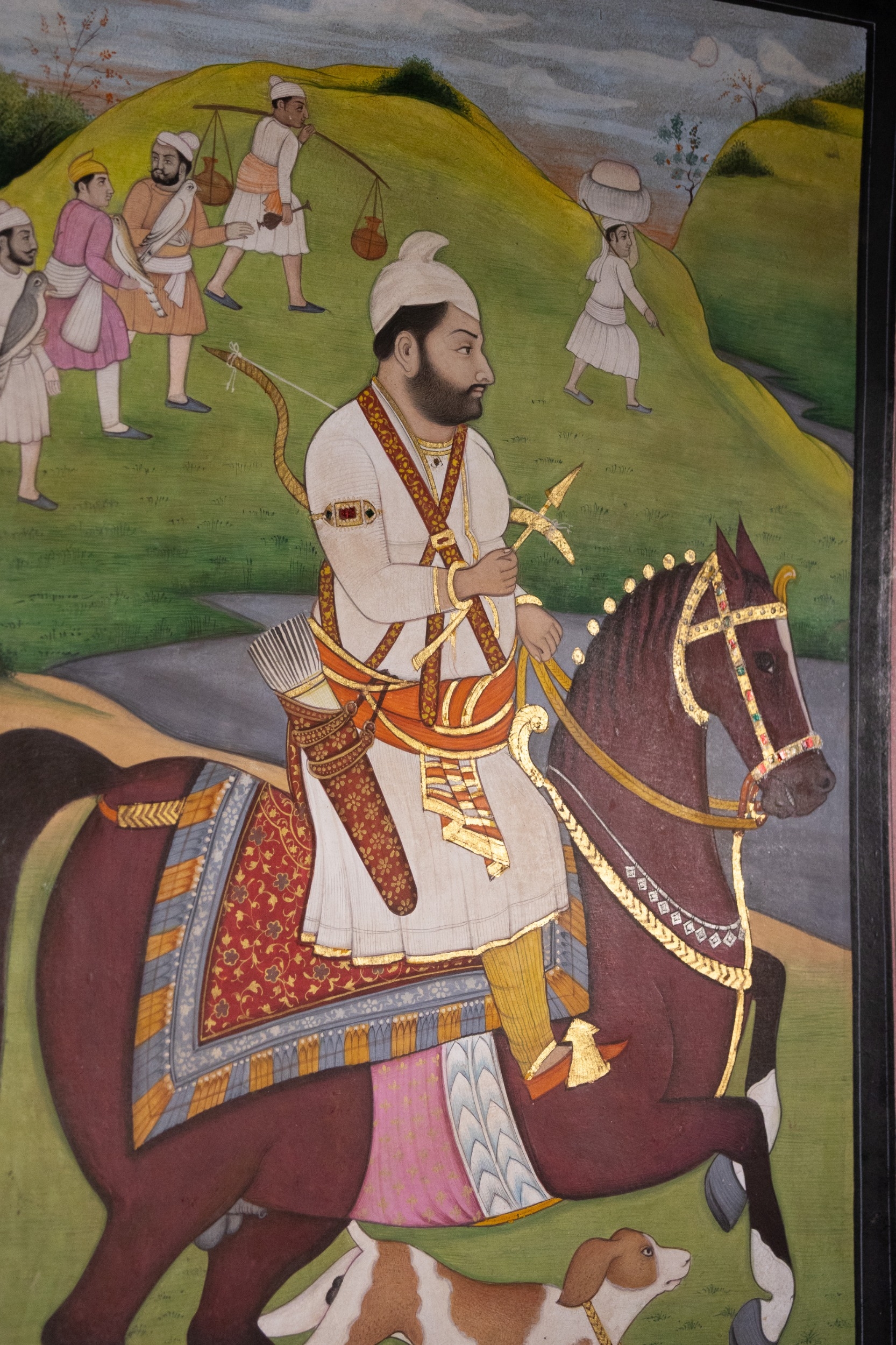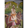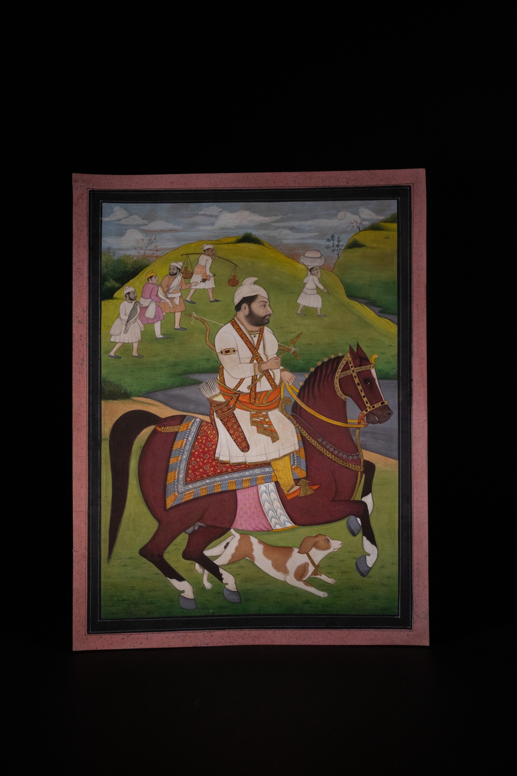 An Indian Sikh School Depicting a Nobleman on Horseback with Hounds, 19th Century - An Indian miniature painting, attributed to the Sikh School, 19th Century. Executed in opaque watercolors and gold leaf on paper, it depicts a central figure of a bearded nobleman or hunter on horseback, holding a bow and arrow, accompanied by two dogs. Several pedestrian figures traverse a verdant, hilly landscape in the background. The artwork exhibits stylistic characteristics of traditional Indian miniature painting, including flattened perspective, vibrant colors, and intricate detailing in attire and ornamentation. The painting features a dark outer border and an inner reddish-pink painted margin.