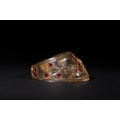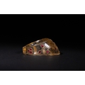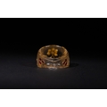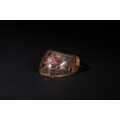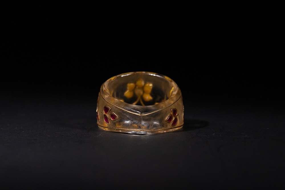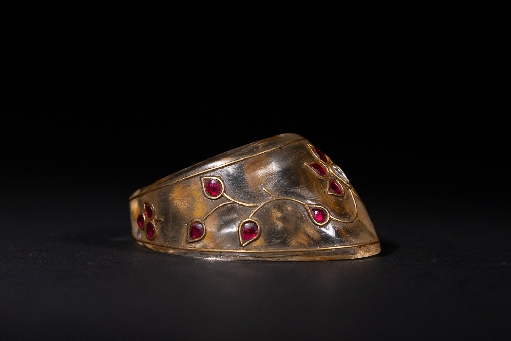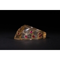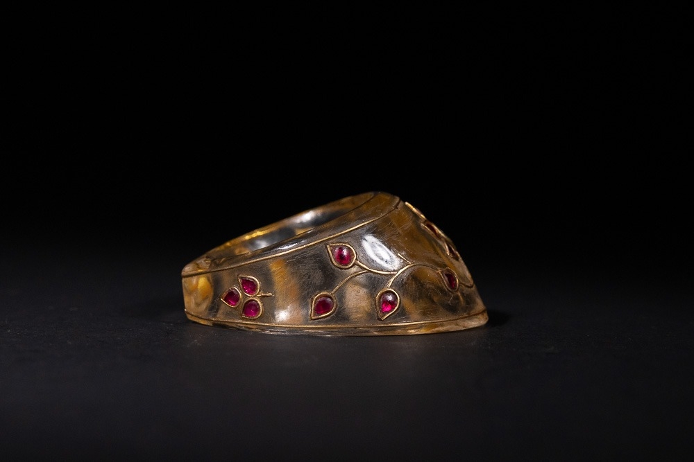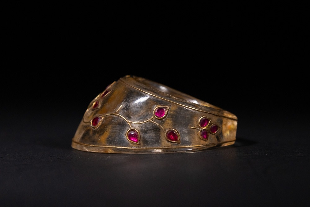 A Mughal Rock Crystal Gemstone-Set Archer's Ring - A Mughal Rock Crystal Gemstone-Set Archer's Ring. This substantial, wide ring, likely intended as a thumb ring, is crafted from a translucent, yellowish-brown hardstone, identified as rock crystal glass. It features an intricate wire inlay forming a curvilinear foliate design across its surface. Numerous tear-drop shaped red stones are bezel-set within the vines. A single central lighter-colored stone, is also bezel-set. The setting technique appears akin to *kundan* work.