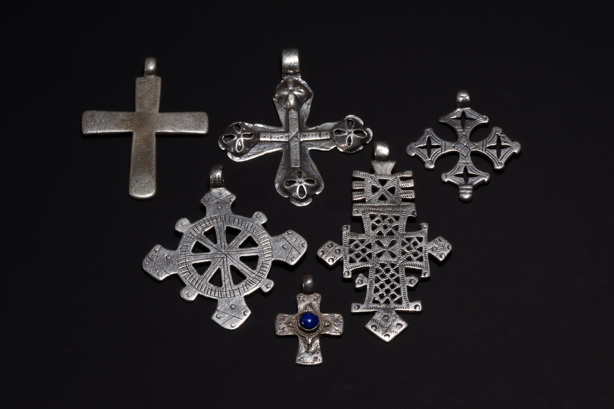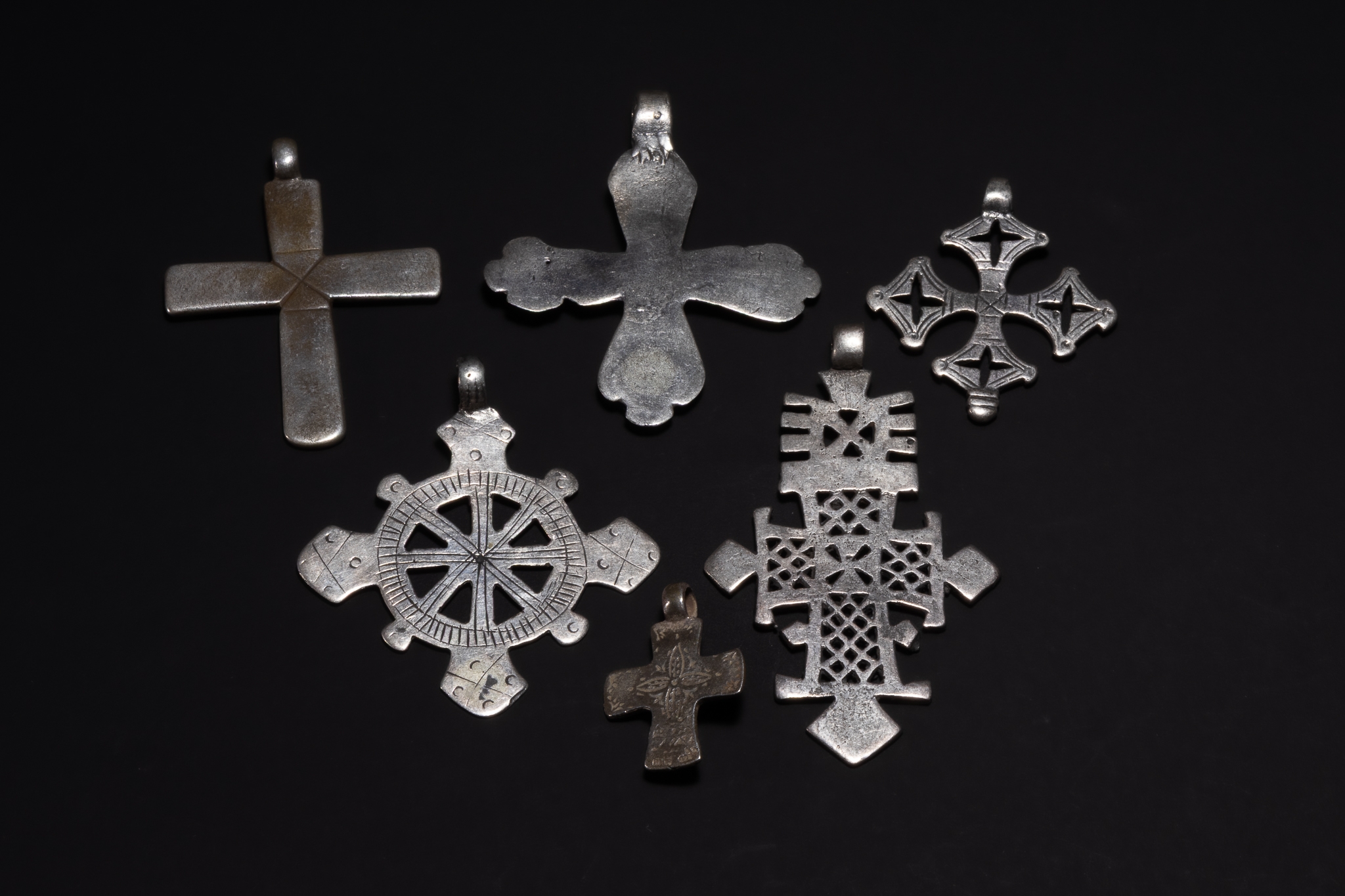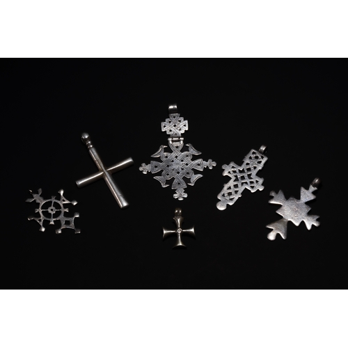 A varied collection of Ethiopian Coptic cross pendants, each cast in silver and displaying a range of traditional cross forms. The group includes solid and pierced examples, with designs featuring openwork lattice patterns, concentric wheel motifs, stepped and flared arms, and finely punched or engraved surface decoration. Several crosses show pronounced geometric symmetry, while others incorporate rounded terminals or stylised extensions typical of Ethiopian devotional jewellery.