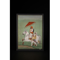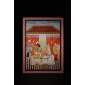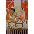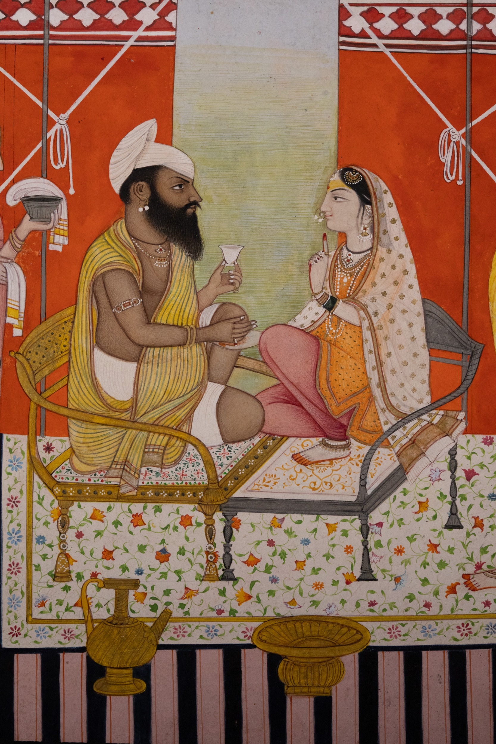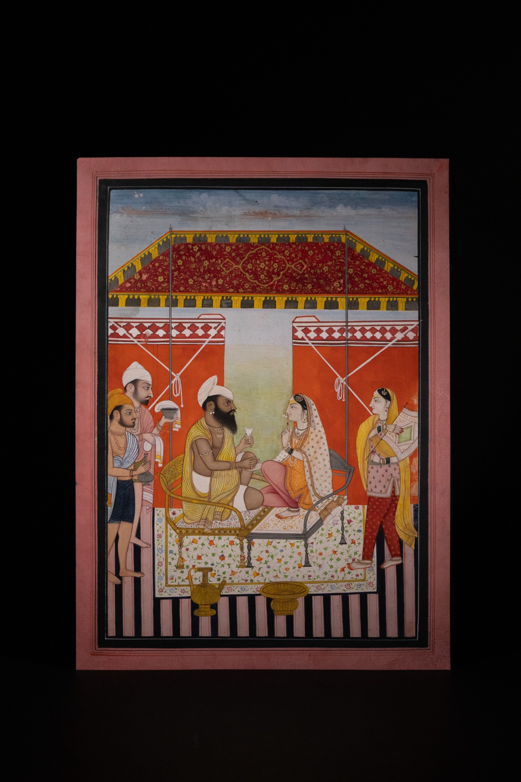 An Indian Miniature Painting depicting Desa Singh Majithia, the Sikh Governor of Guler, with a Lady and Attendants, circa Early 19th/Early 20th Century. - An Indian miniature painting depicting Desa Singh Majithia, the Sikh Governor of Guler, seated under a canopy with a lady and attendants. Rendered in opaque watercolors on paper, the central figures are a bearded man in yellow robes and a woman in an ornate orange and cream sari, seated on an elaborate patterned bench beneath a richly decorated canopy. They are engaged in conversation or an exchange. They are flanked by attendants, including a male figure offering a bowl and a female musician playing a stringed instrument. The work exhibits vibrant colors, intricate patterns, and fine detail, characteristic of traditional Indian court painting. It is presented within a painted pink border and inner black line.