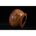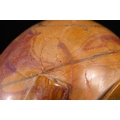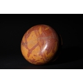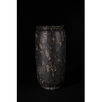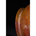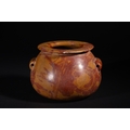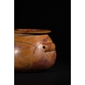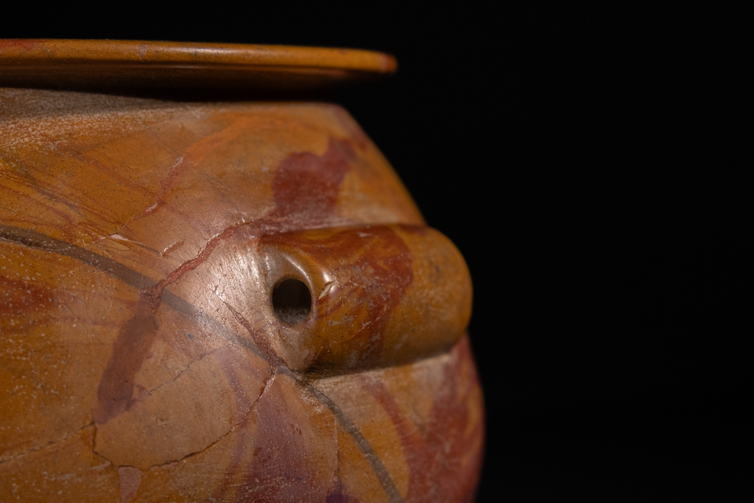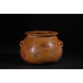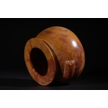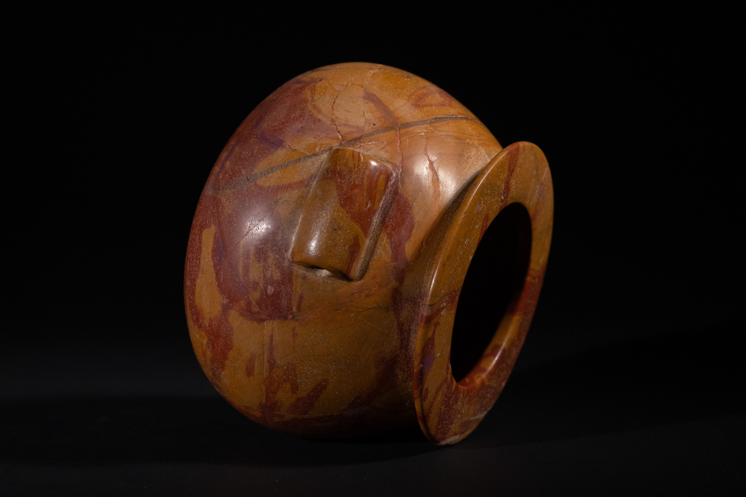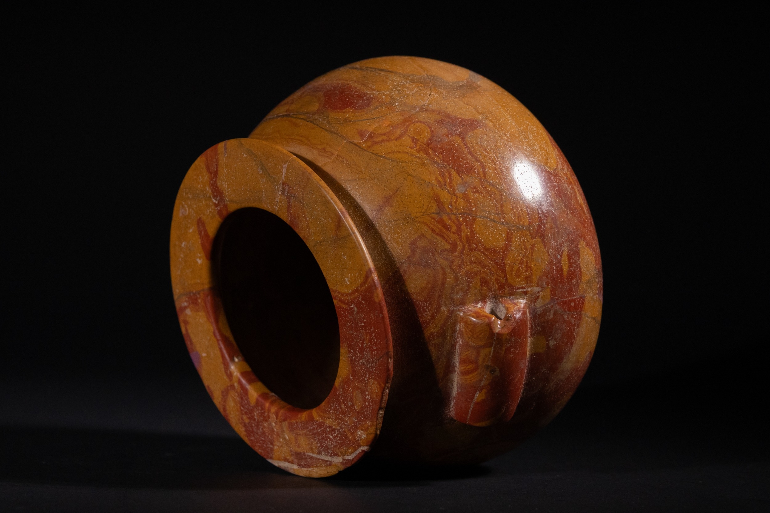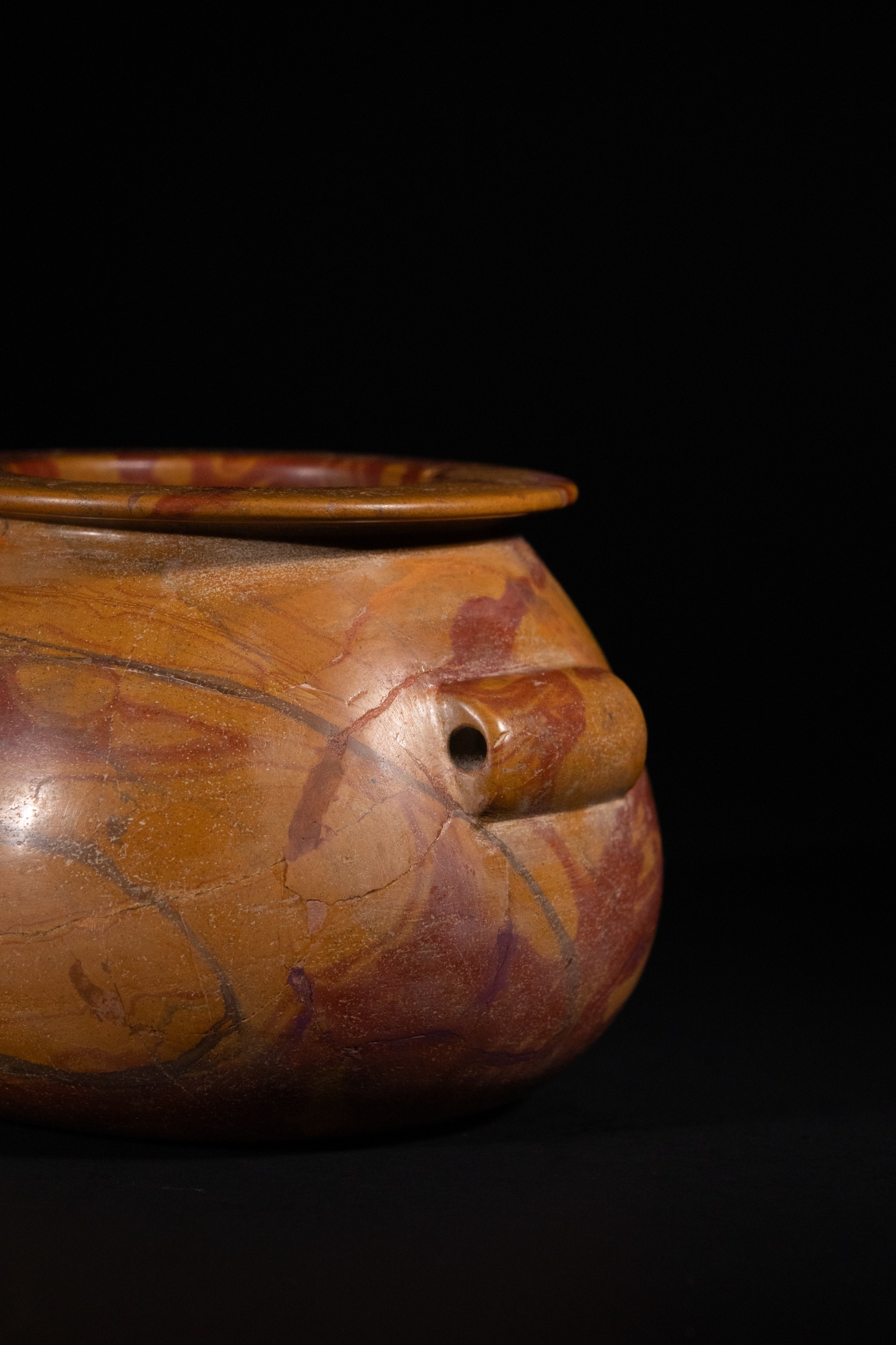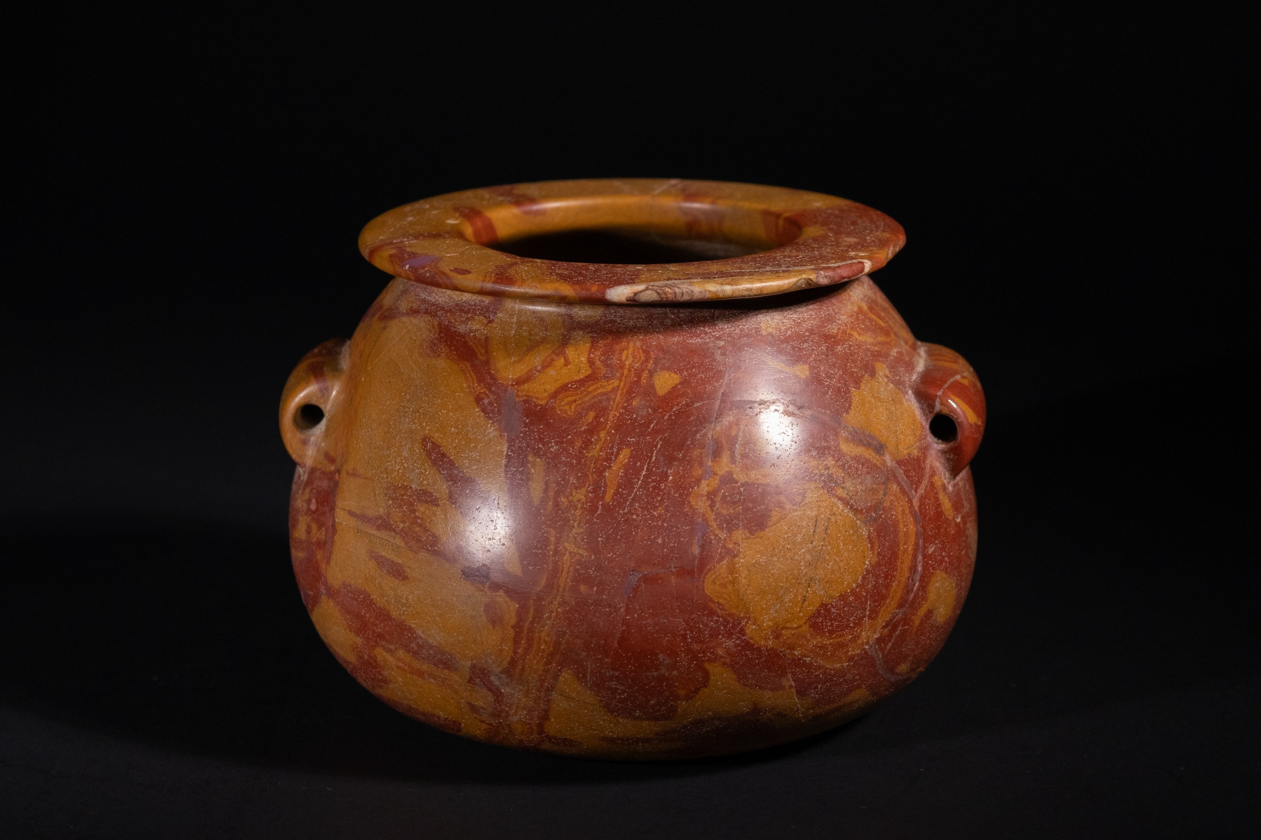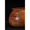 An Egyptian Early Dynastic Funerary Vase in Byrsian Marble or Steatite, 2nd Millennium BC – Early 1st Millennium BC - An Egyptian Early Dynastic Funerary Vase, dating from the 2nd Millennium BC – Early 1st Millennium BC, crafted from Byrsian Marble or Steatite. This stout, rounded vessel is carved from a variegated stone, exhibiting natural patterns of reddish-brown, tan, and cream. It features a short neck with a flat, outwardly flaring rim and two small, pierced lug handles symmetrically placed on its shoulders.
