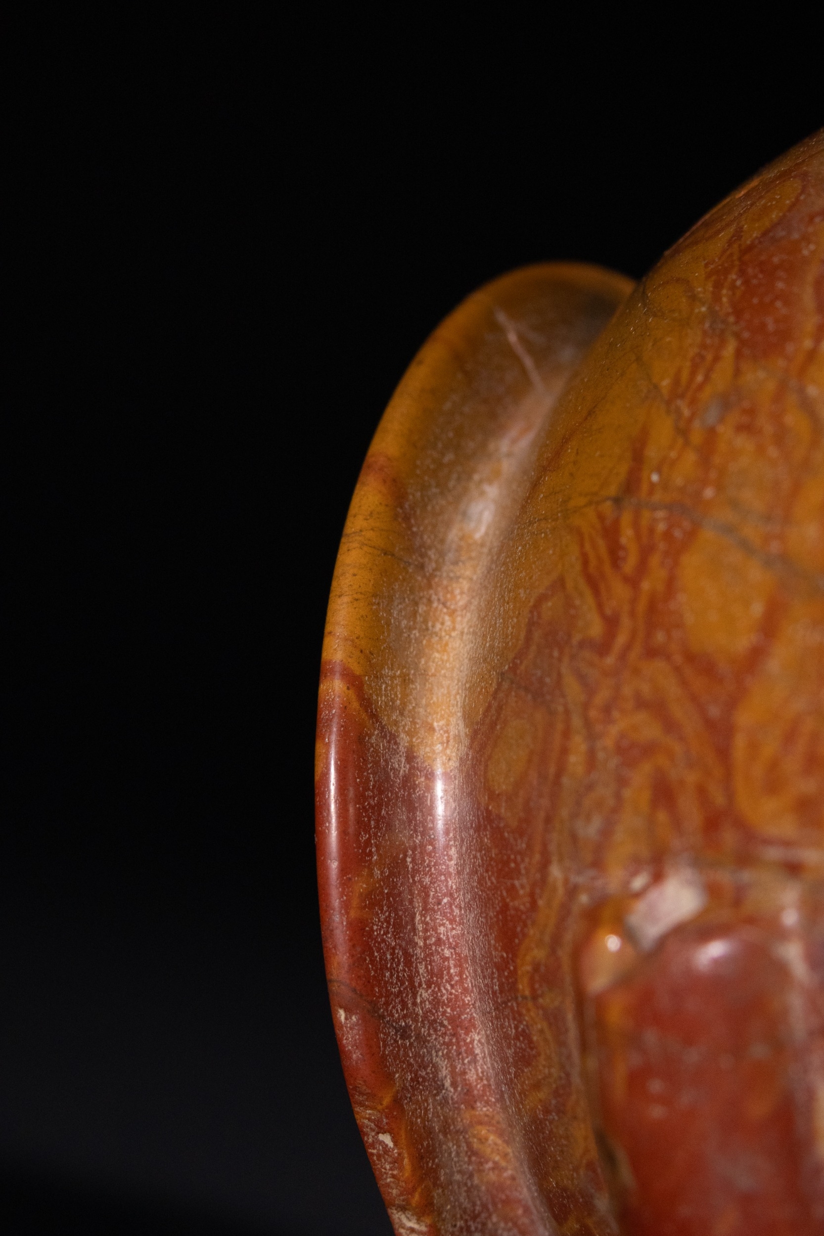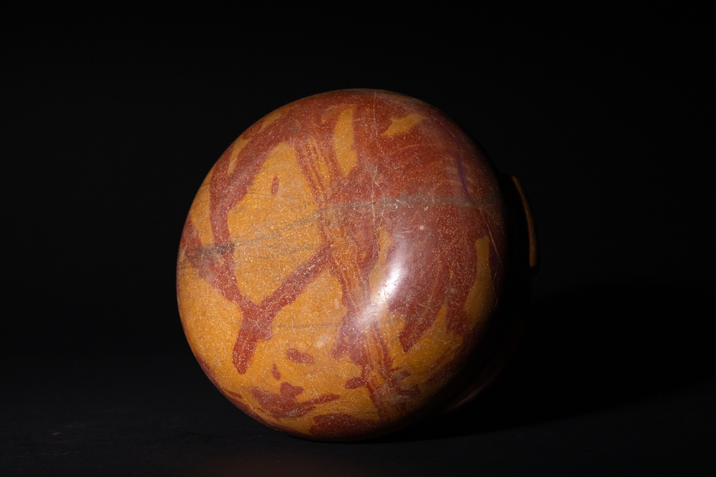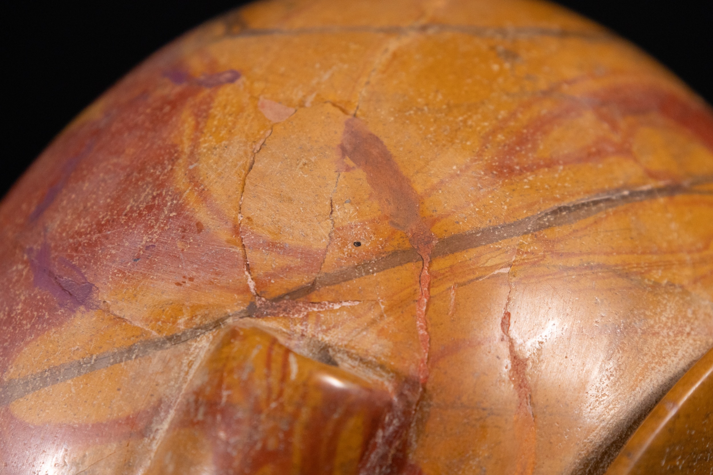 Visible surface wear, numerous scratches, several stable fissures or hairline cracks across the body, and minor pitting, all consistent with age and use.