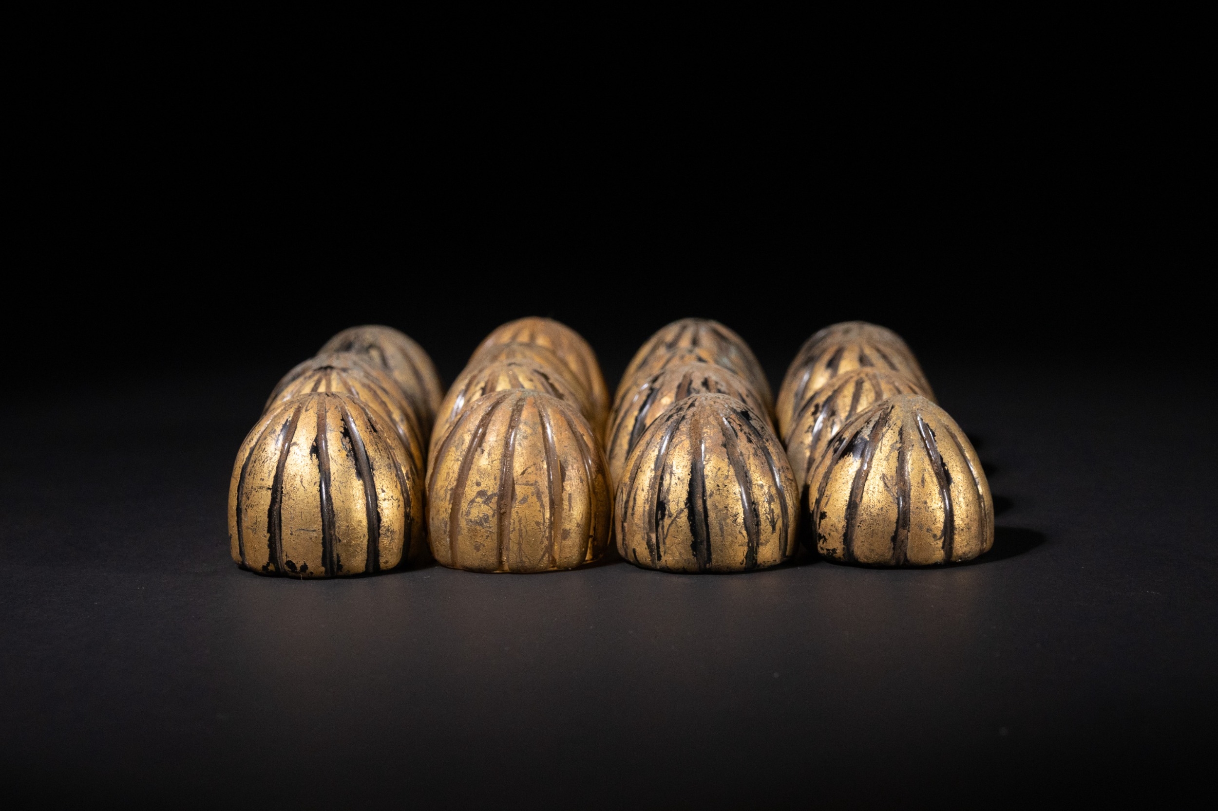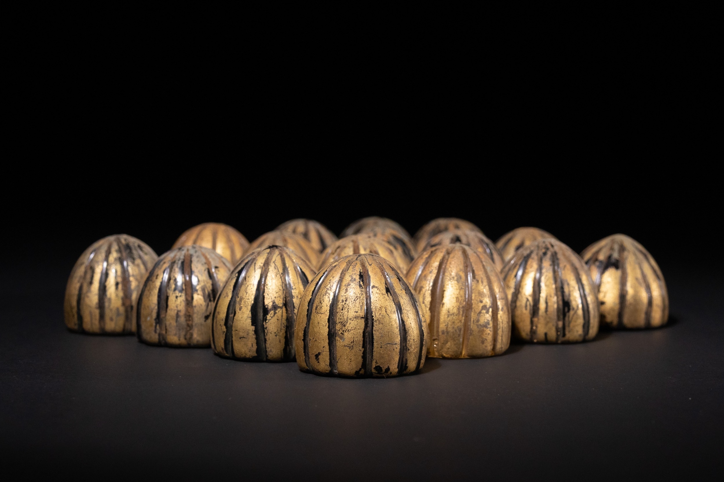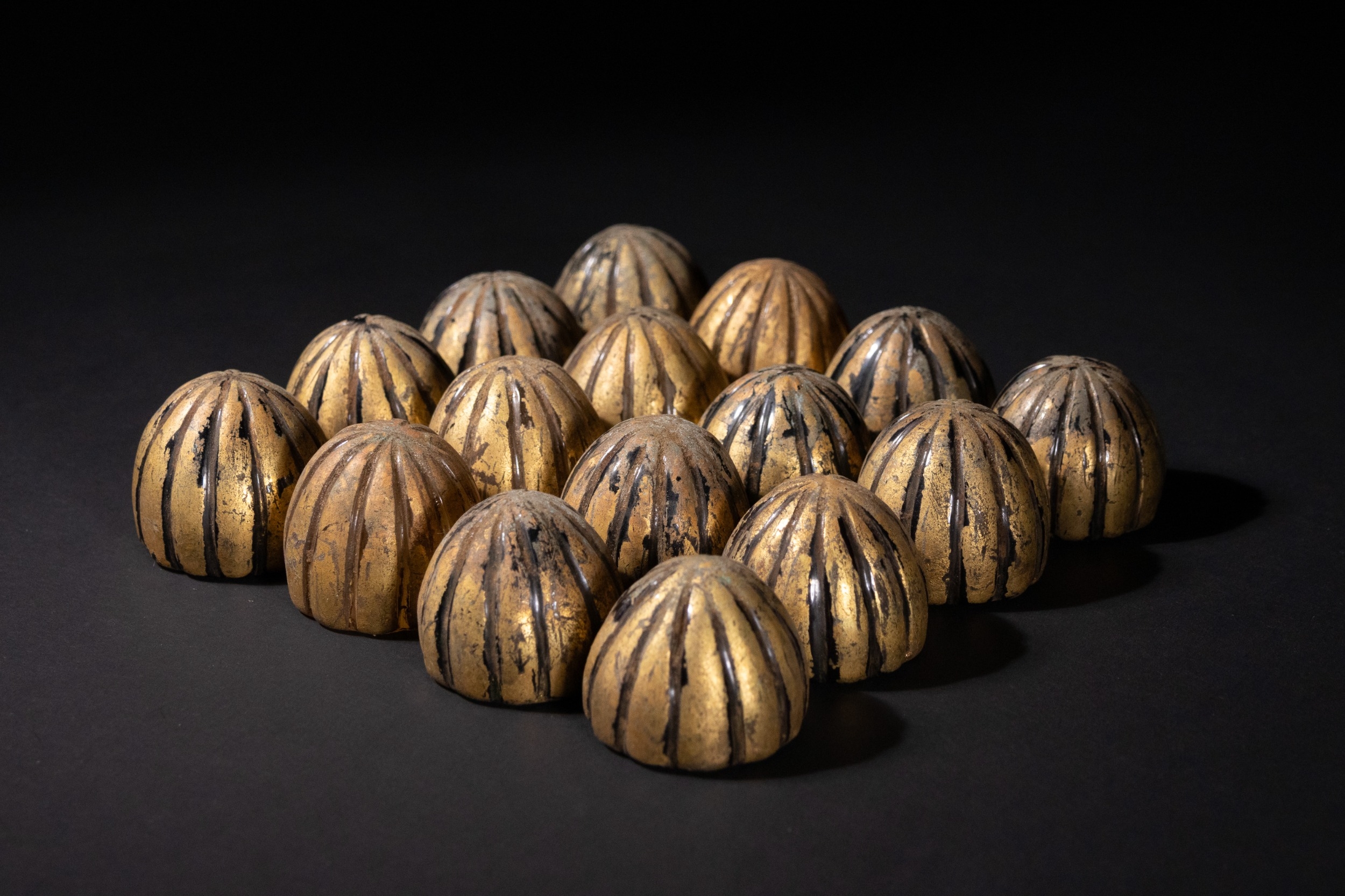 A Set of Indian Glass Pachisi Game Pieces, 19th Century - A set of fifteen Indian Pachisi game pieces. Each small, dome-shaped object exhibits a segmented or fluted exterior, finished in gilt. The flat undersides are uniformly treated with a dark, glossy, possibly lacquered coating. Stylistically, the pieces present an organic form, suggestive of melons or stylized flower buds.