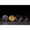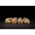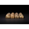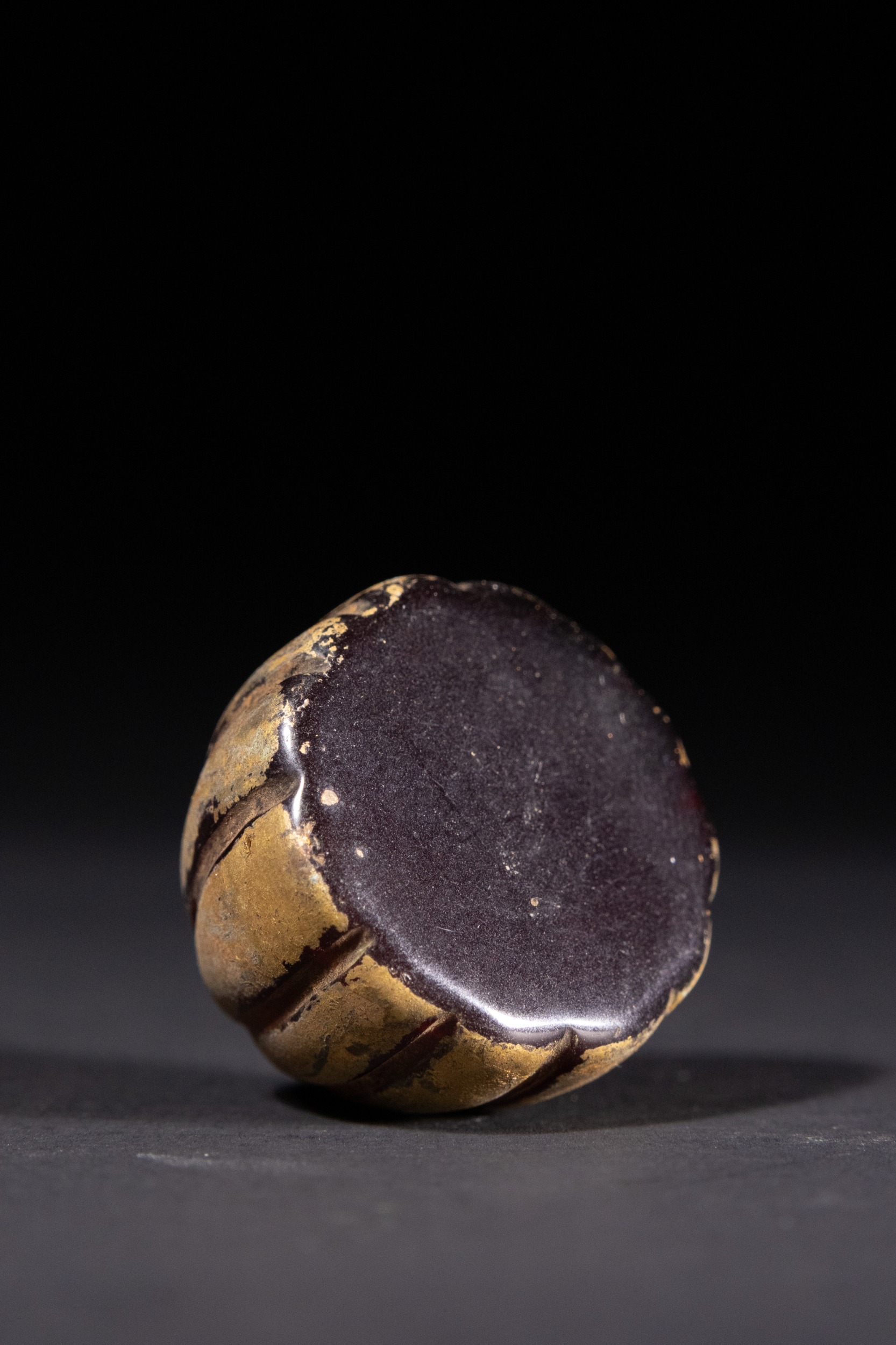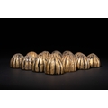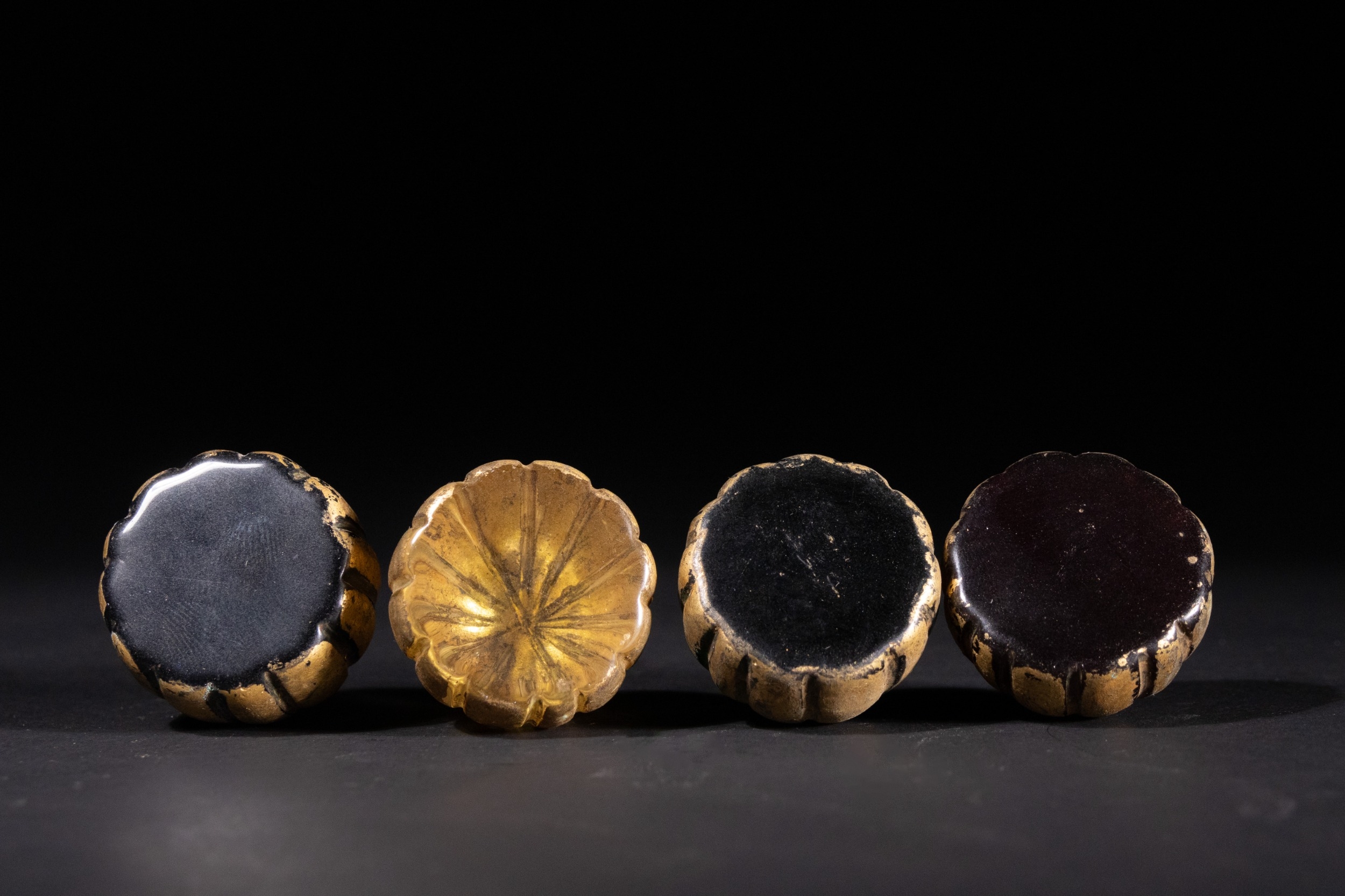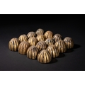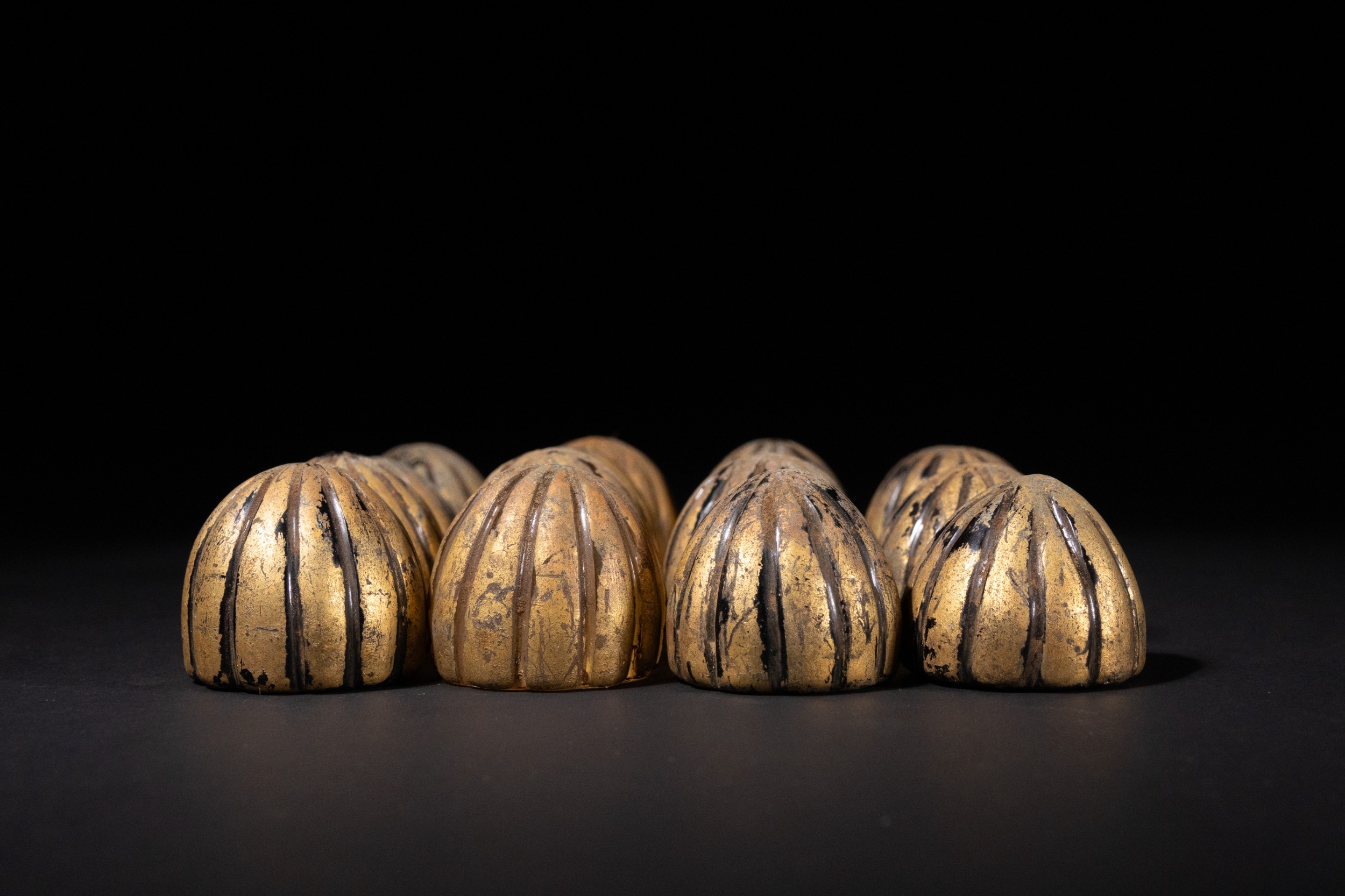 A Set of Indian Glass Pachisi Game Pieces, 19th Century - A set of fifteen Indian Pachisi game pieces. Each small, dome-shaped object exhibits a segmented or fluted exterior, finished in gilt. The flat undersides are uniformly treated with a dark, glossy, possibly lacquered coating. Stylistically, the pieces present an organic form, suggestive of melons or stylized flower buds.