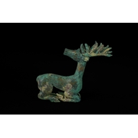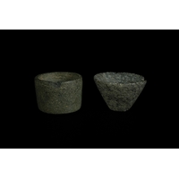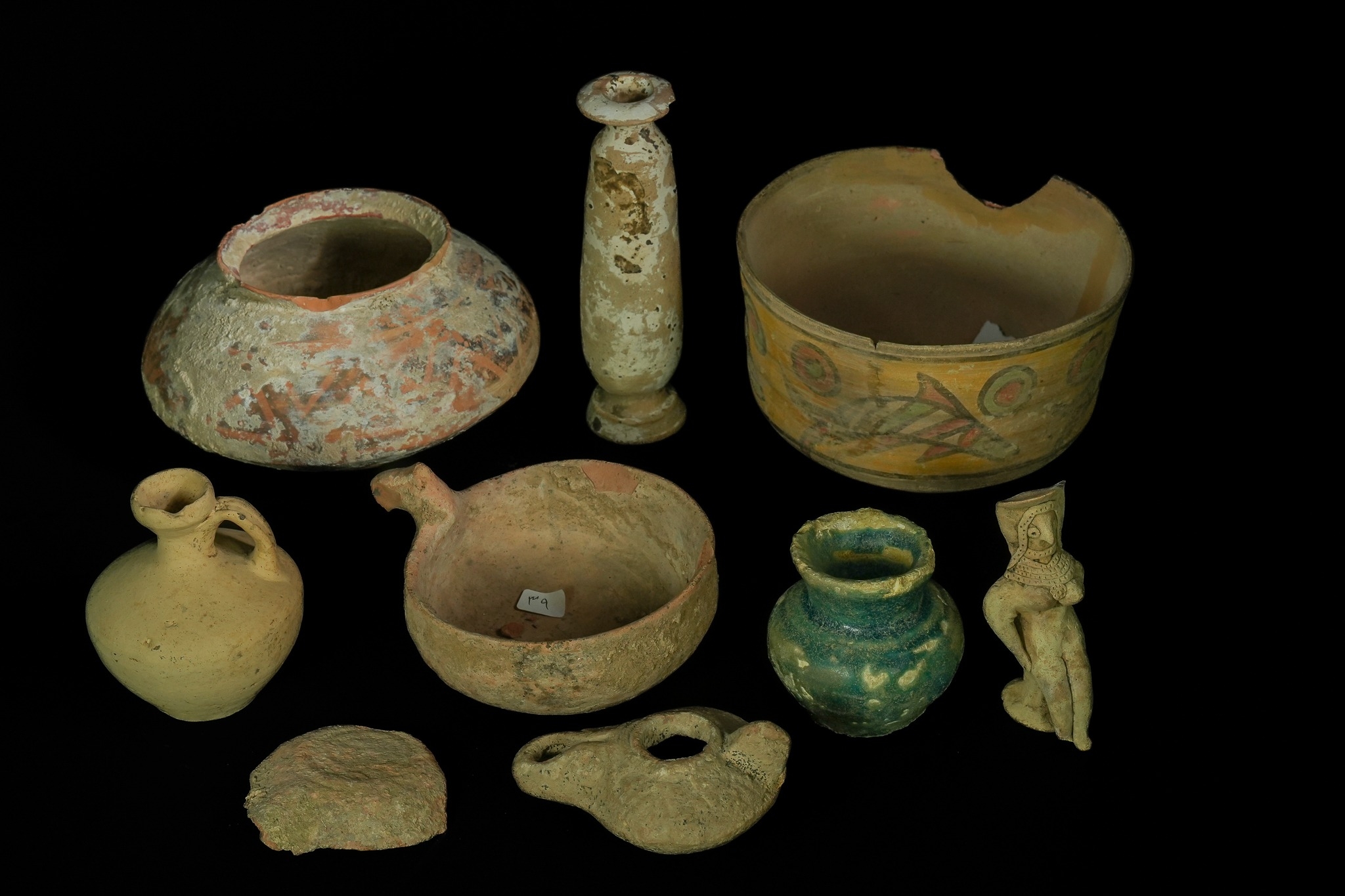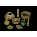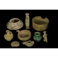 A Mixed Group of Indus Valley Terracotta Vessels, 2nd Millennium BC - A mixed group of nine ancient ceramic artifacts, attributed to the Indus Valley Civilisation and dating to the 2nd Millennium BC. The collection comprises various utilitarian vessels, a figural statuette, an oil lamp-like object, and a pottery shard. Primarily unglazed earthenware or terracotta, the pieces display diverse forms and decorative styles. Some items feature remnants of painted motifs in red, orange, yellow, and green pigments, while one small jar showcases a mottled turquoise-green glaze. Modern inventory numbers, such as "53" and "39," are visible on white adhesive labels on some items.