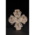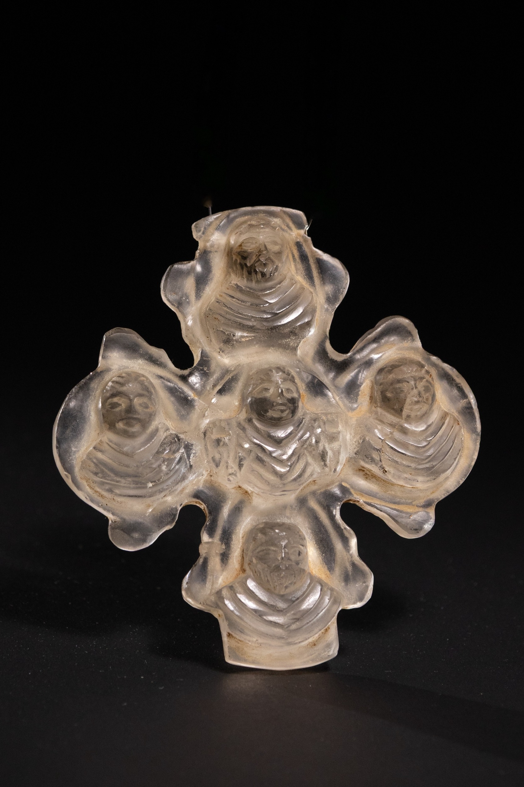 A rare and intricately carved cross-shaped pendant fashioned from translucent rock crystal, featuring five sculpted, robed figures in high relief—one at the centre and one at each terminal of the cross. The figures, likely representing saints or apostles, are shown with serene expressions and stylized, draped garments