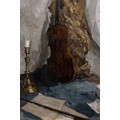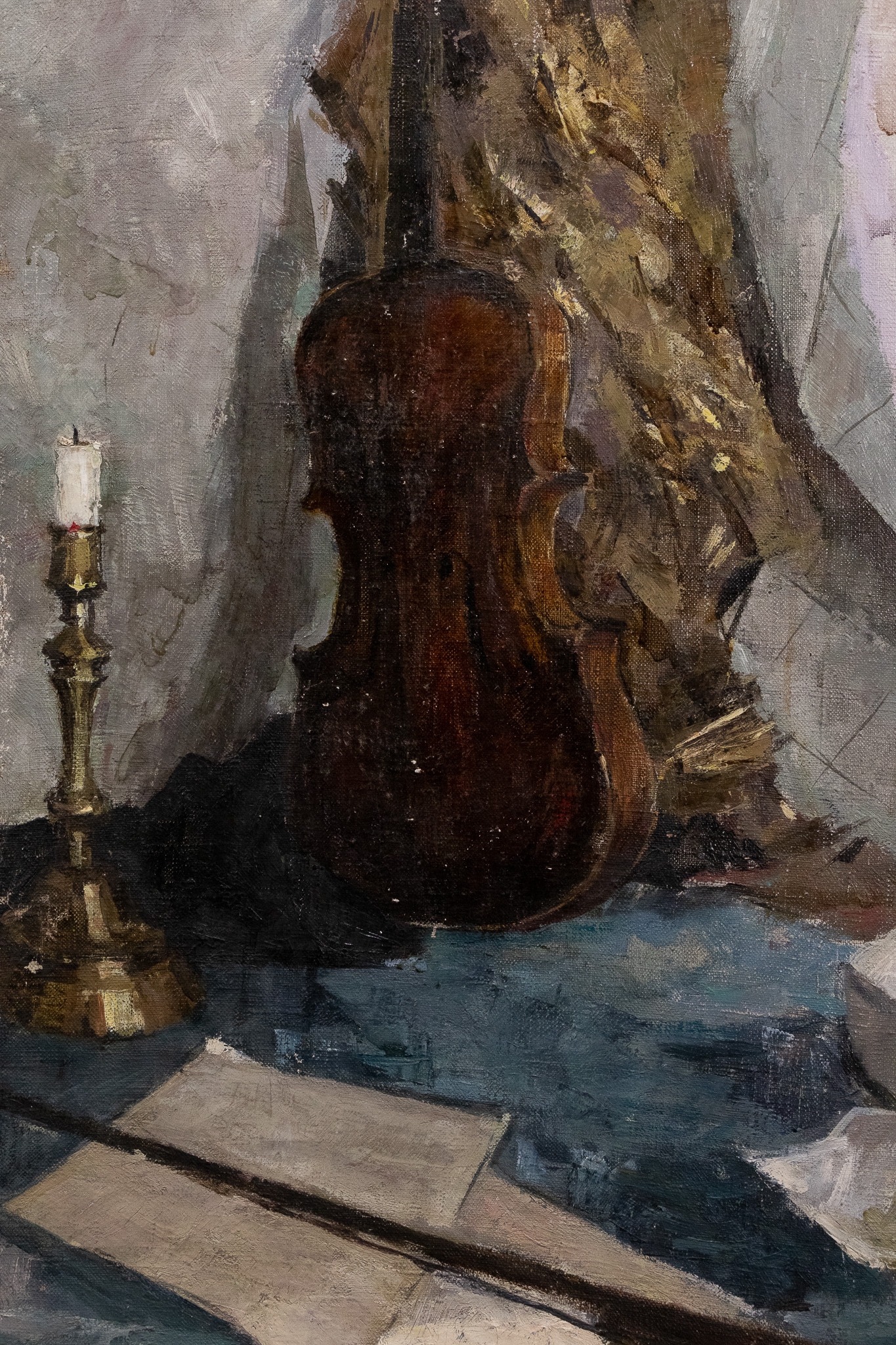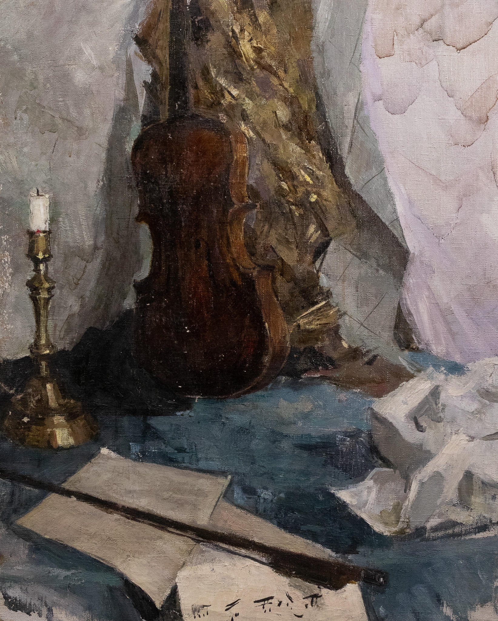 The composition is executed with expressive, confident brushwork, particularly visible in the textured handling of the drapery and the subtle modelling of light across the instrument’s curved surface. The white plaster fragment to the right introduces a sculptural element, balancing the verticality of the violin and candle. The restrained palette and painterly surface give the work a contemplative, studio-like atmosphere.