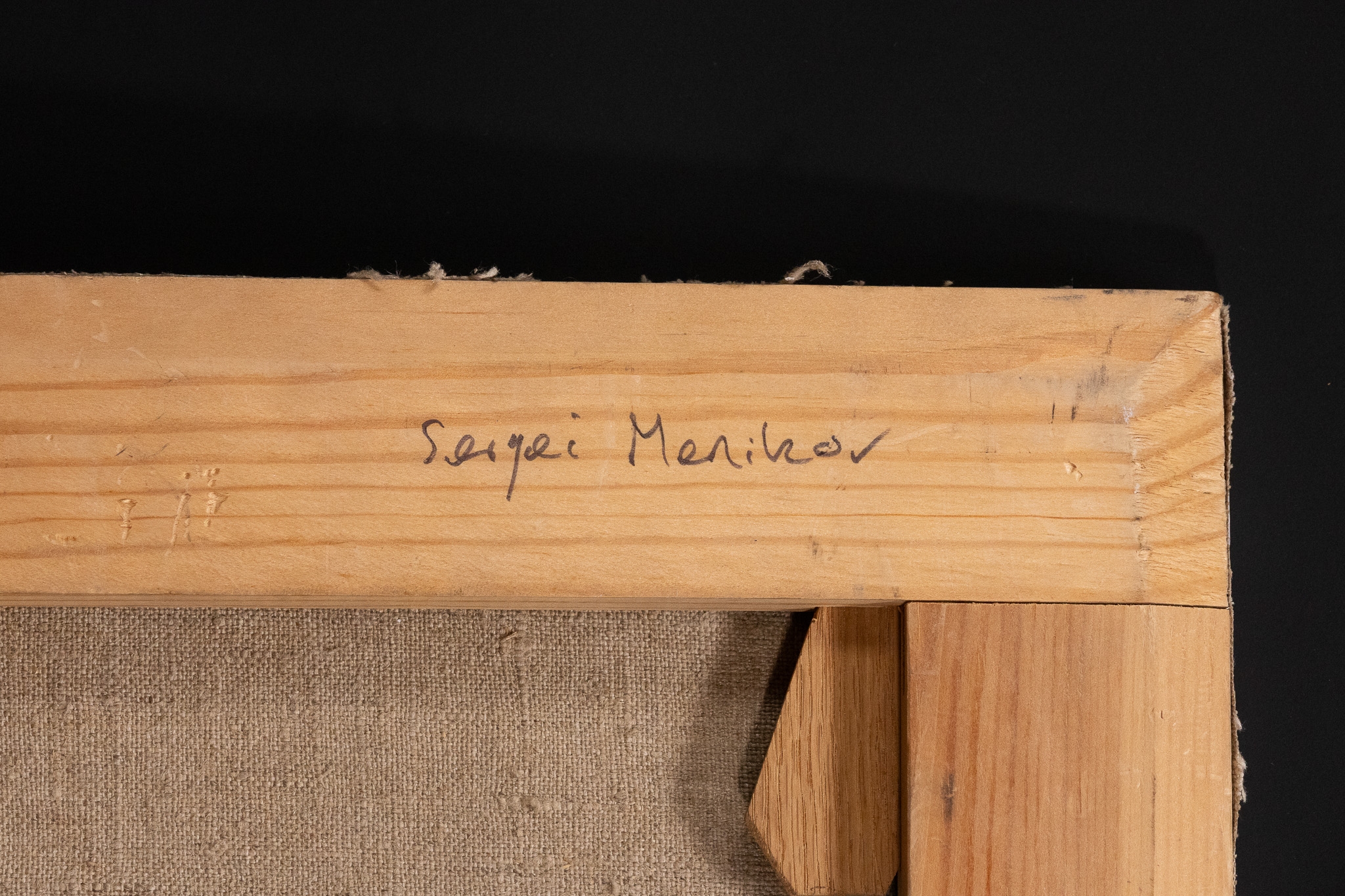 A Russian oil on canvas still life composition by Sergei Menikov, depicting a violin resting beside a brass candlestick with a partially burned candle, arranged upon a draped table with scattered sheet music. The violin stands upright against softly rendered fabric in the background, its rich brown tones contrasting with the cooler blues and muted greys of the surrounding cloth.
