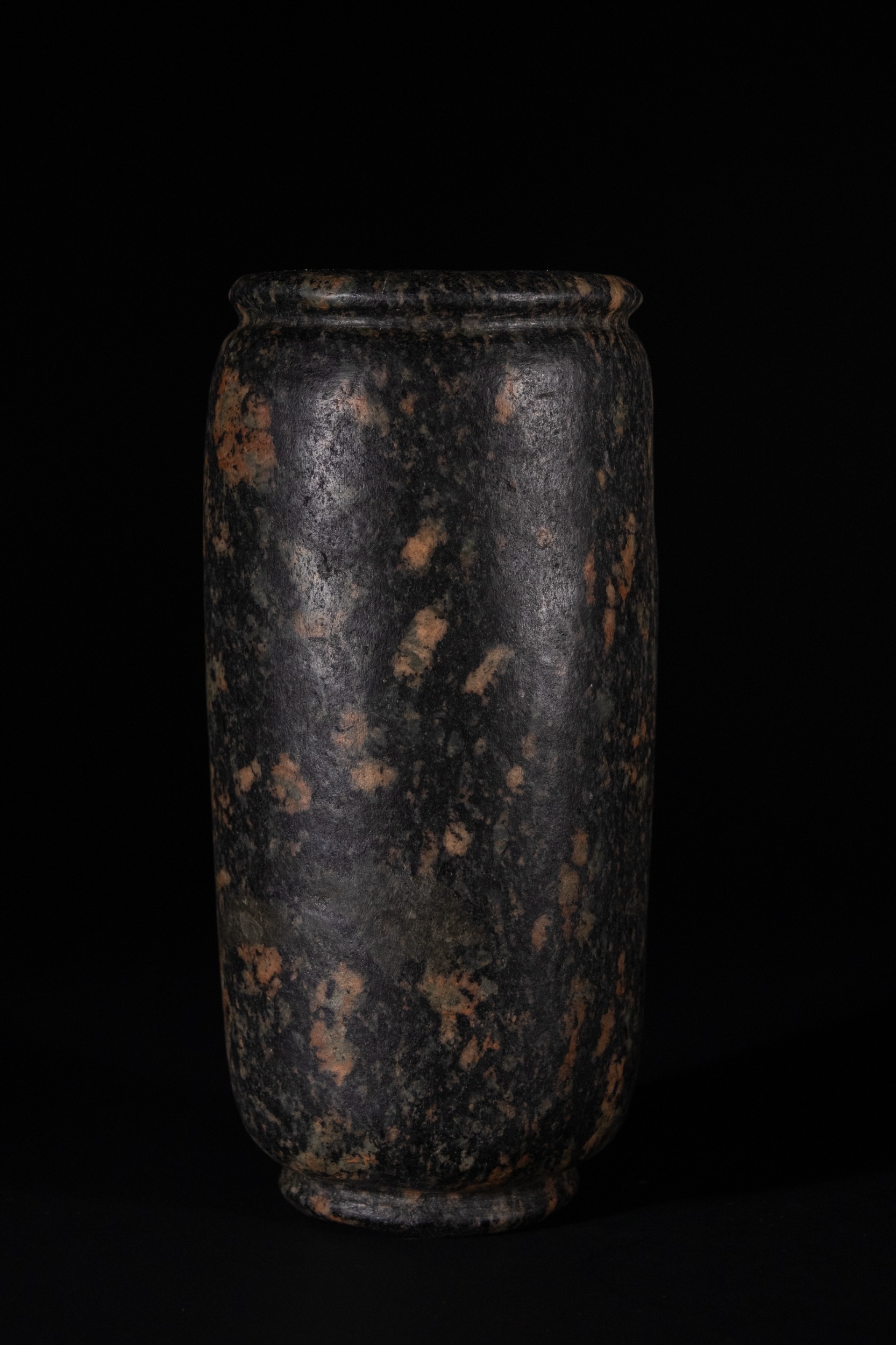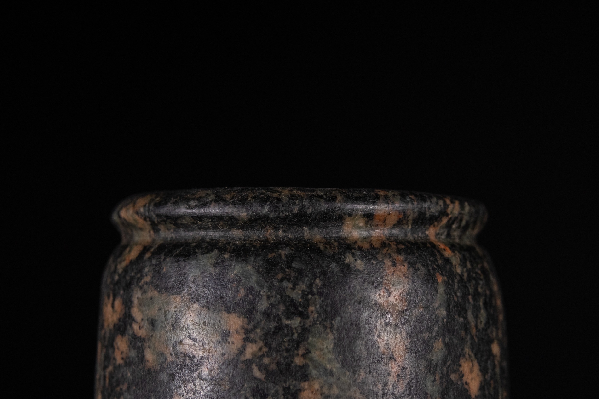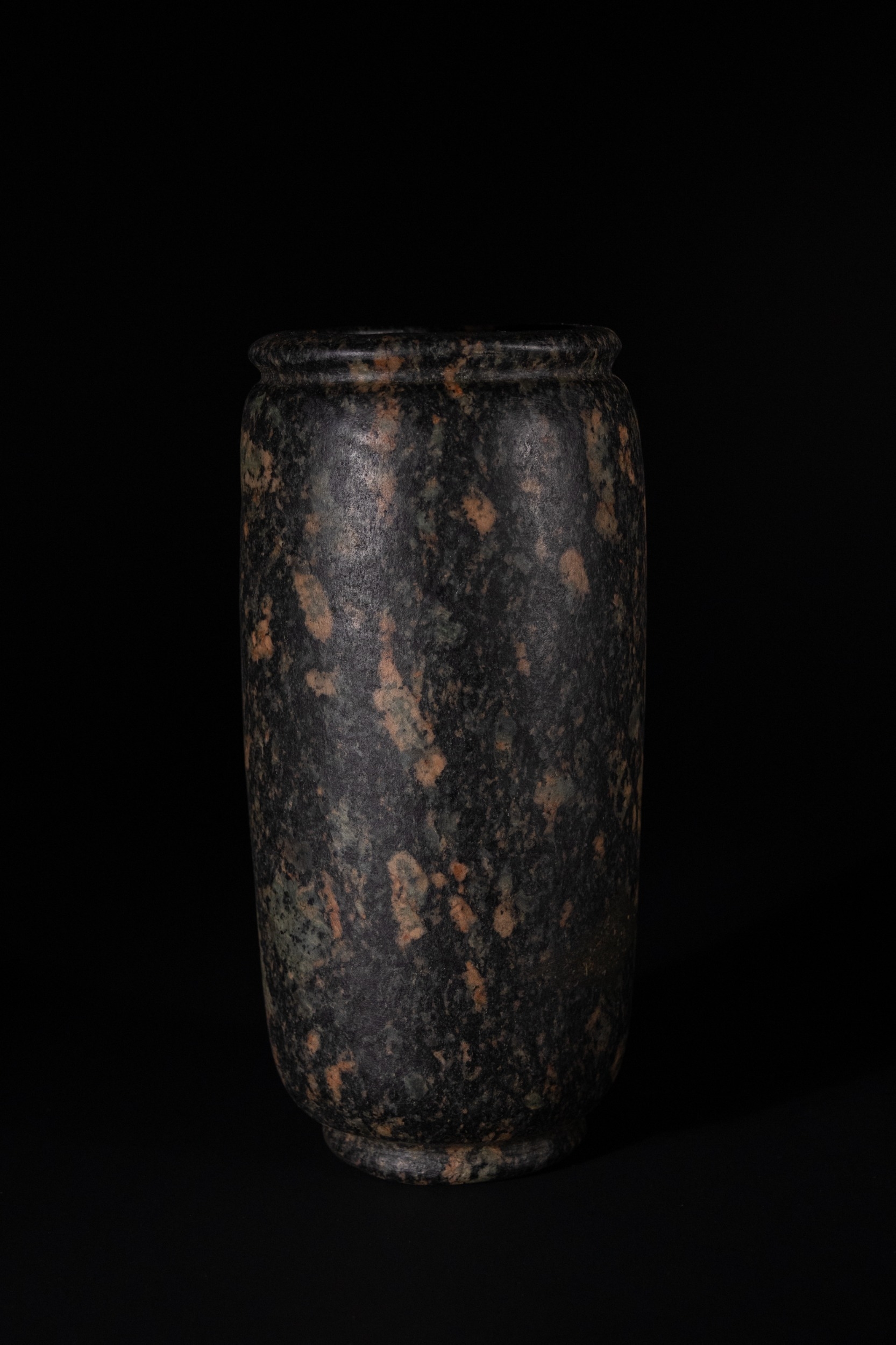 An Egyptian Early Dynastic Funerary Vase in Byrsian Marble or Steatite, 2nd Millennium BC – Early 1st Millennium BC - An Egyptian Early Dynastic Funerary Vase in Byrsian Marble or Steatite, dating to the 2nd Millennium BC – Early 1st Millennium BC. The cylindrical stone vessel features a simple, robust form, carved from a dense, mottled stone displaying speckles of dark green, black, and reddish-brown/tan. It presents a slightly everted, rounded rim and a subtly flared base.