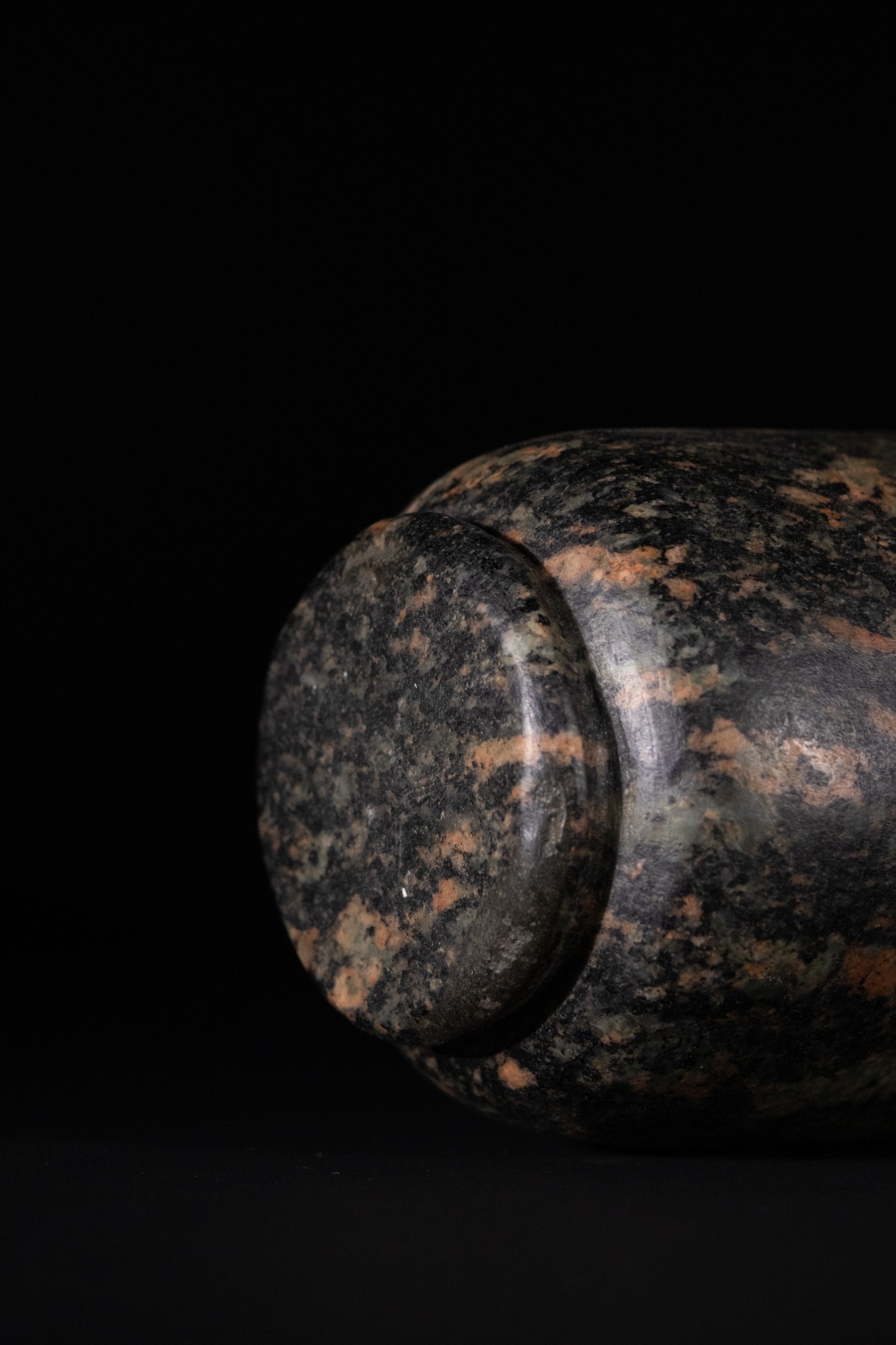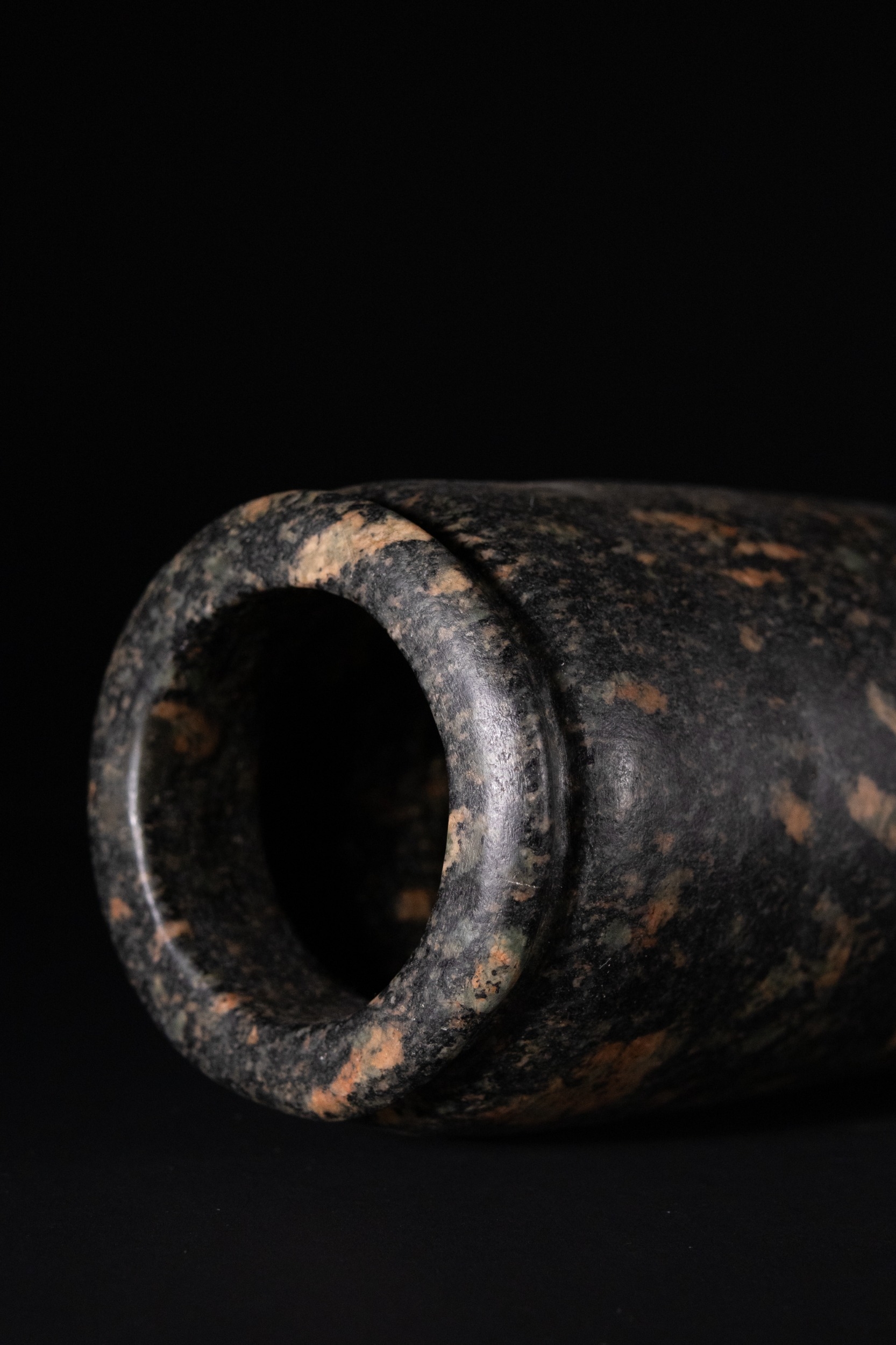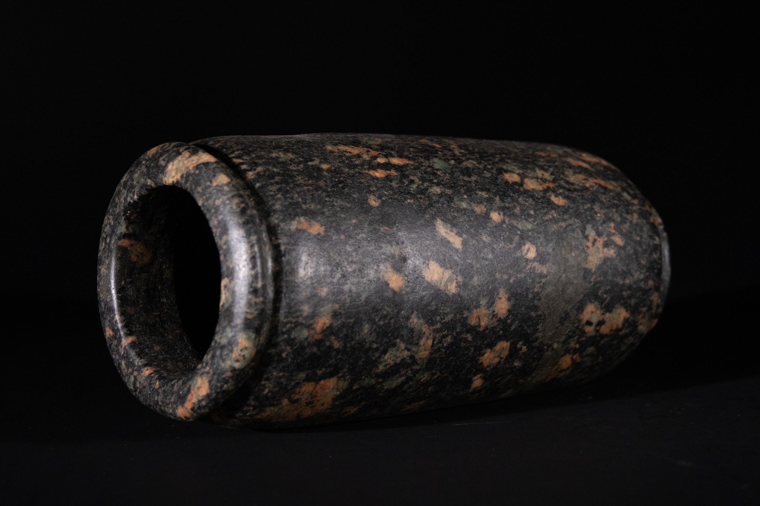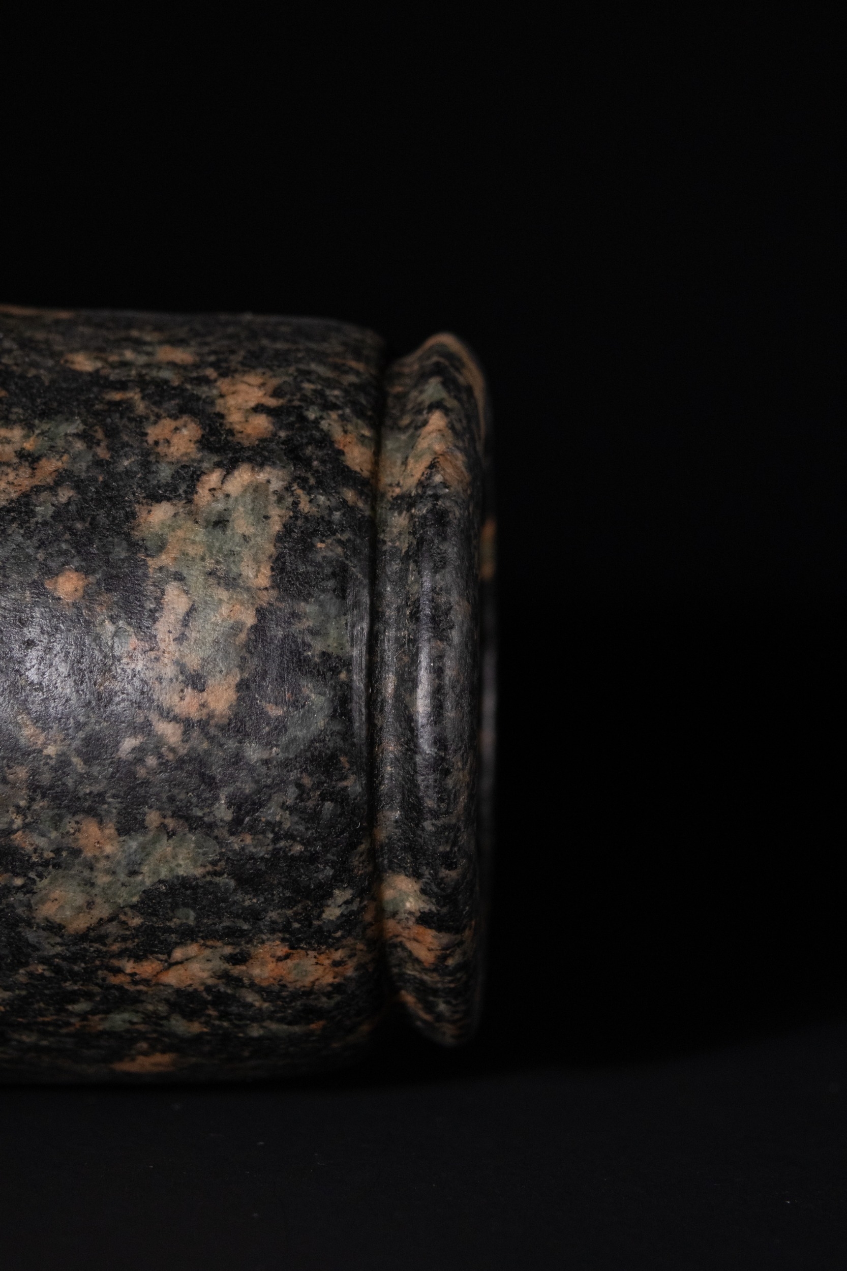 An Egyptian Early Dynastic Funerary Vase in Byrsian Marble or Steatite, 2nd Millennium BC – Early 1st Millennium BC - An Egyptian Early Dynastic Funerary Vase in Byrsian Marble or Steatite, dating to the 2nd Millennium BC – Early 1st Millennium BC. The cylindrical stone vessel features a simple, robust form, carved from a dense, mottled stone displaying speckles of dark green, black, and reddish-brown/tan. It presents a slightly everted, rounded rim and a subtly flared base.