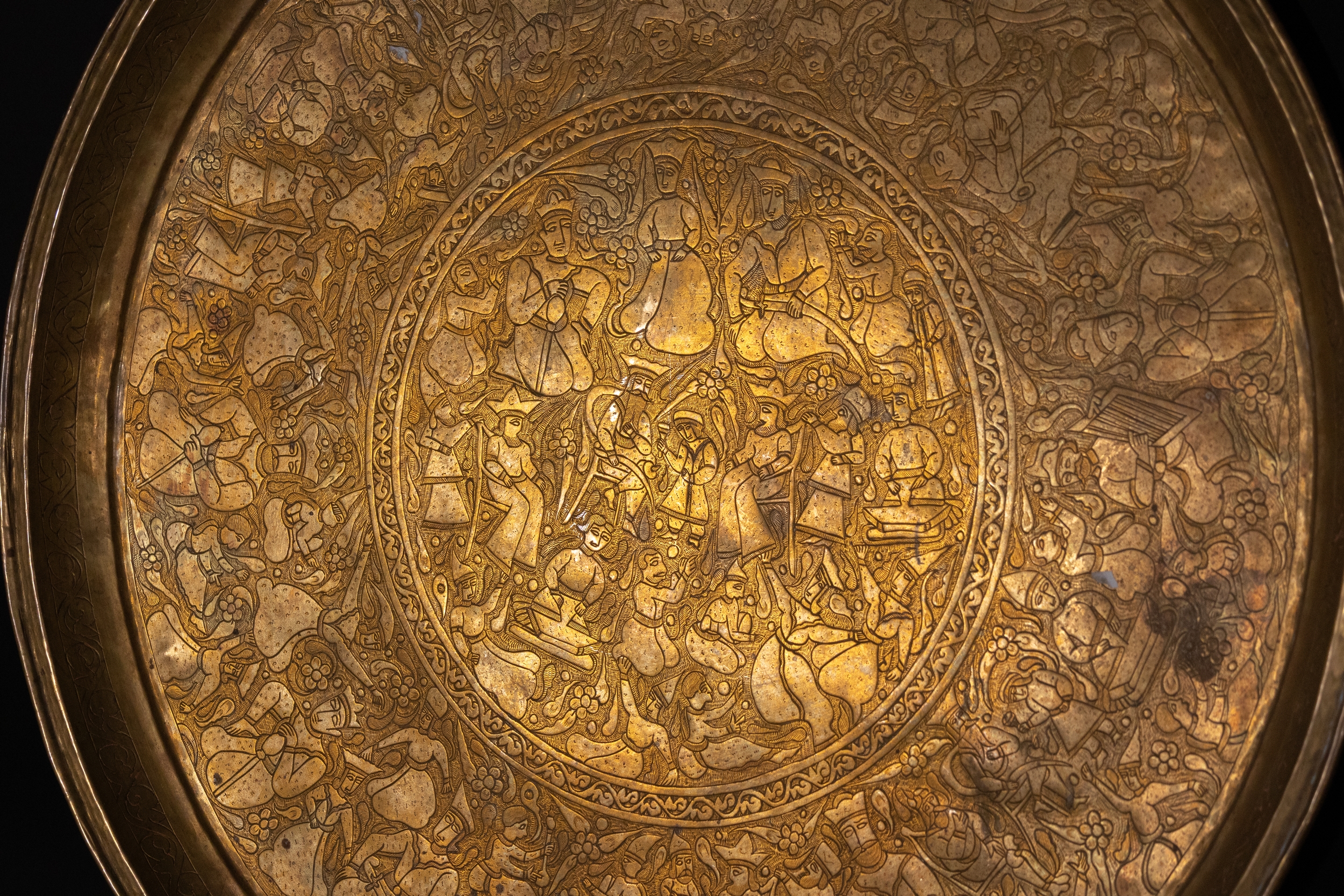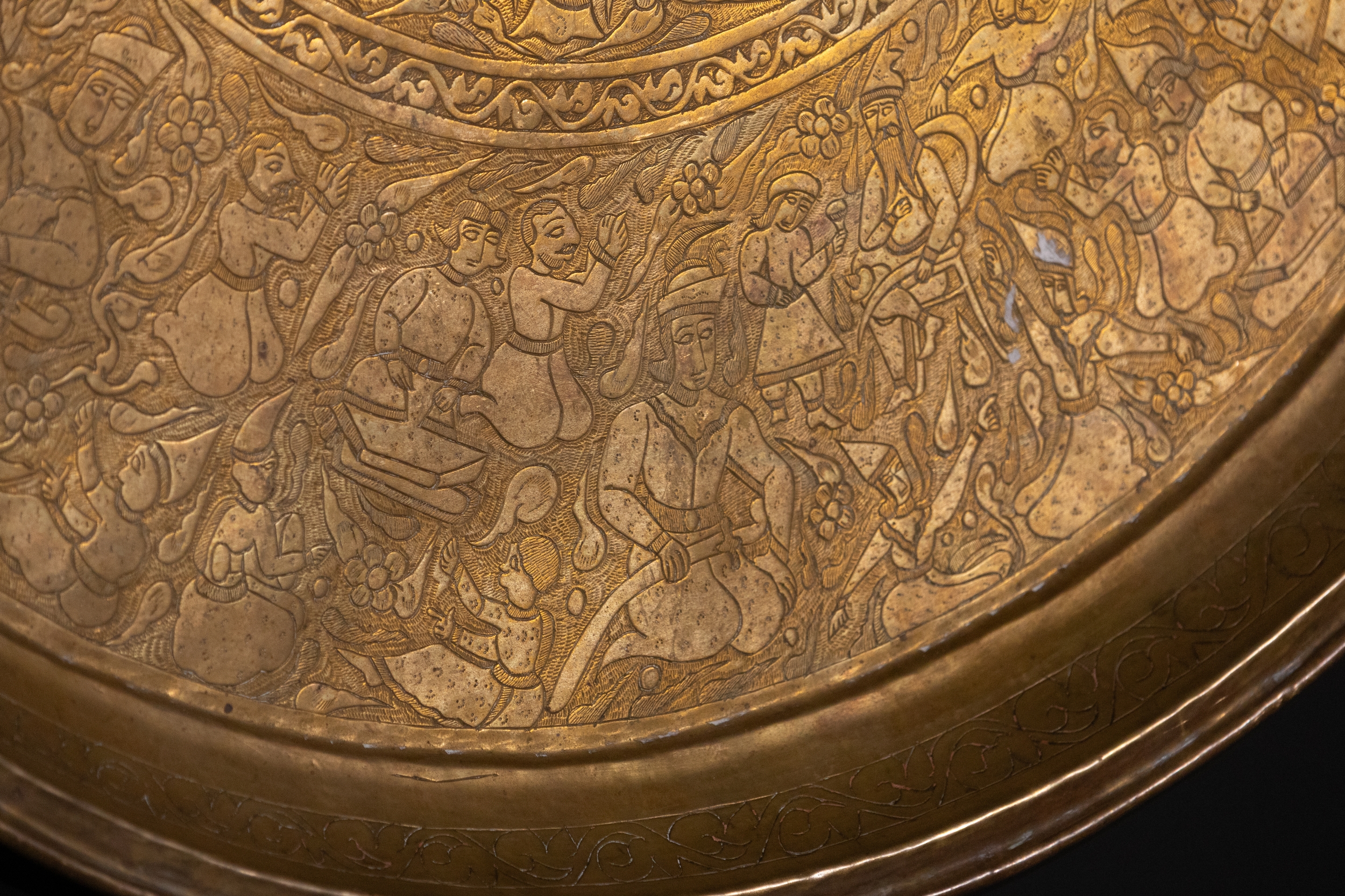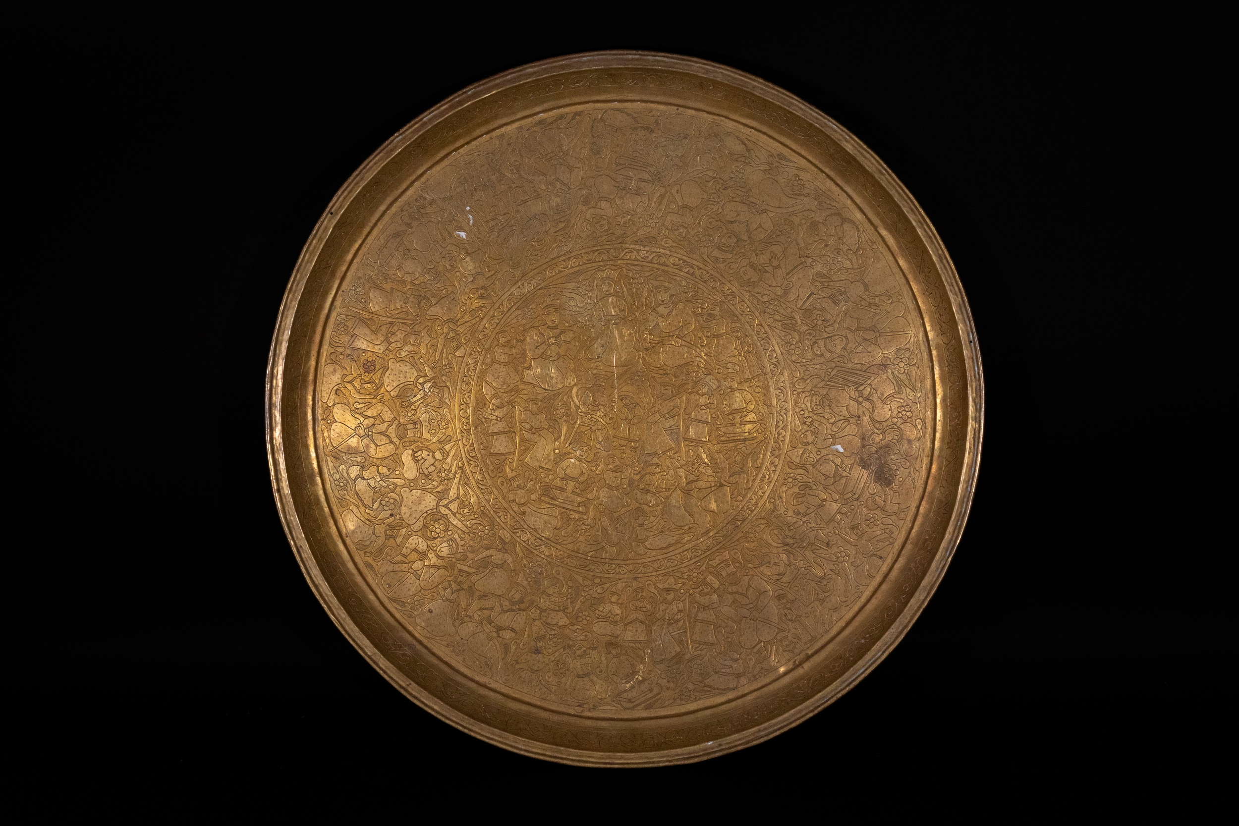 A Qajar Brass Tray with Courtly Scene, Persia, 19th–20th Century.