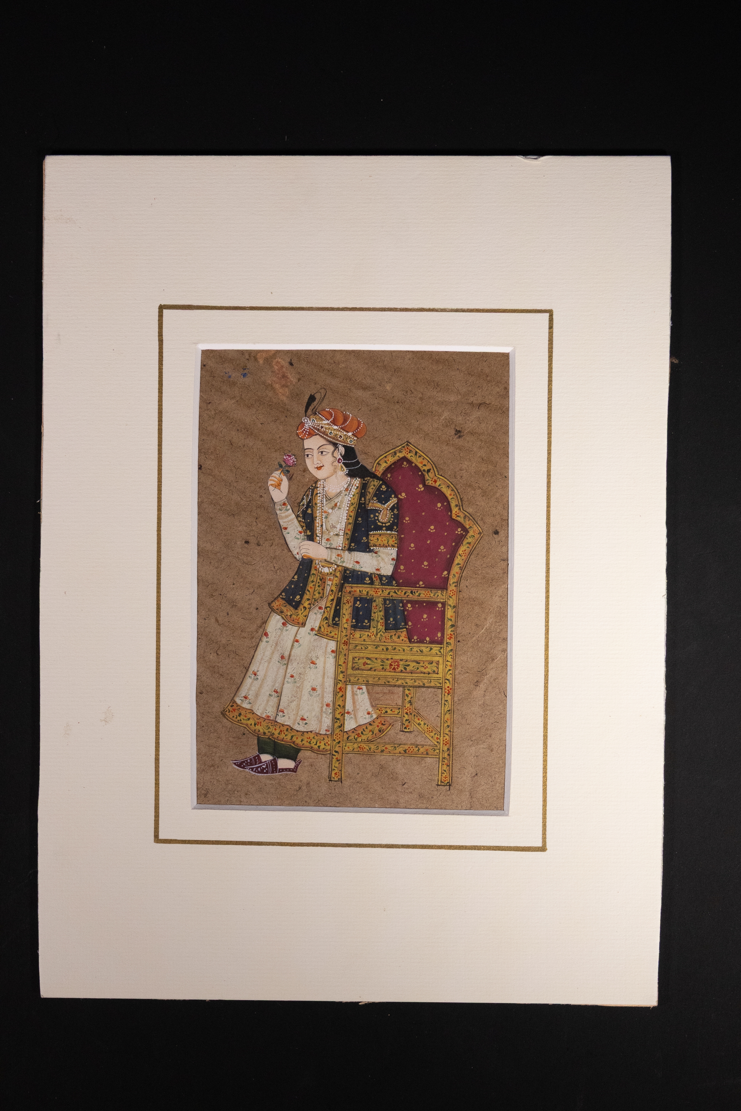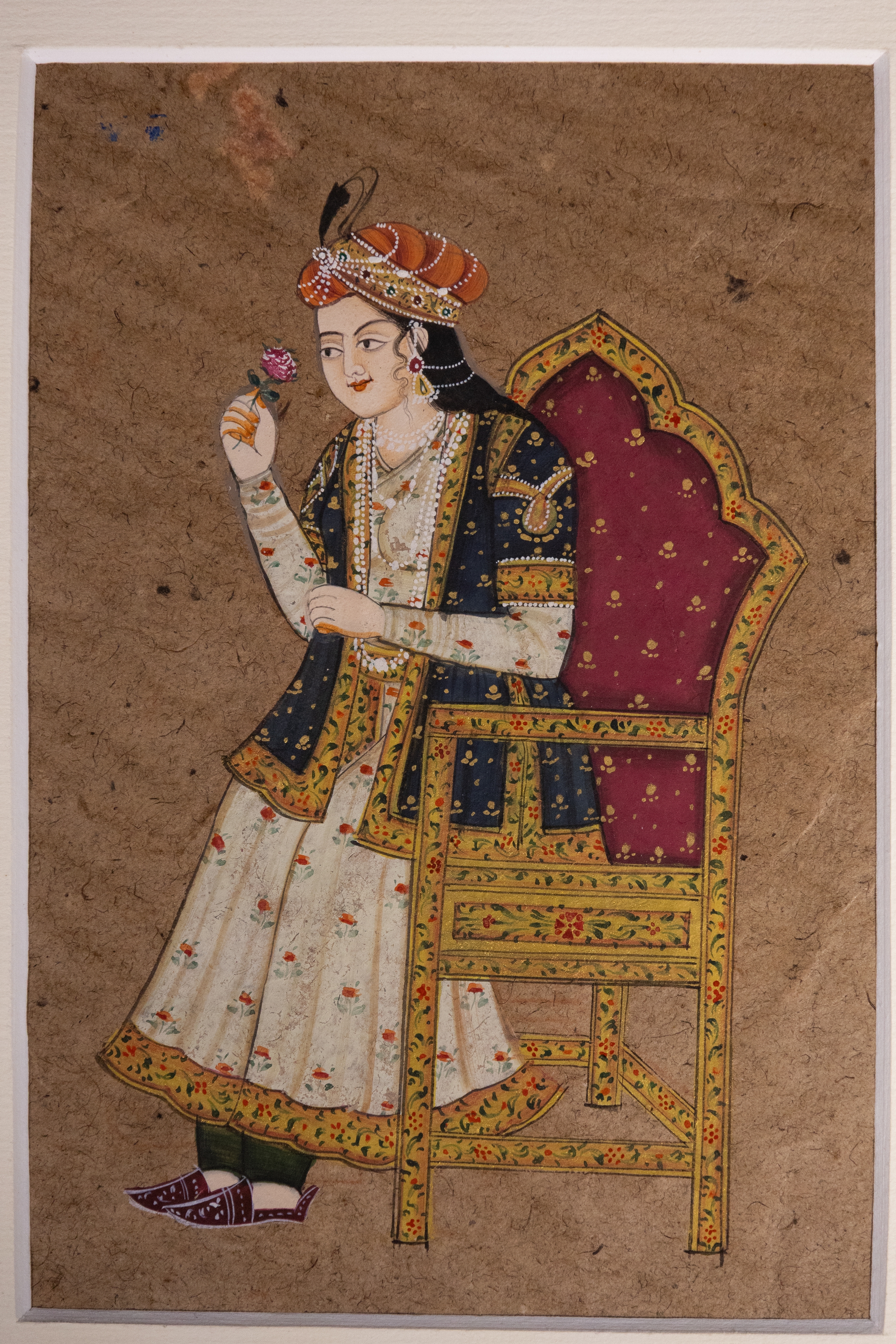 An intricately painted Qajar miniature depicting a regal Persian nobleman seated on a high-backed throne chair, holding a delicate pink rose. The sitter is adorned in richly detailed robes featuring floral motifs, paired with a dark navy waistcoat and a layered pearl necklace. His turban is crowned with a plume, highlighting his aristocratic status.