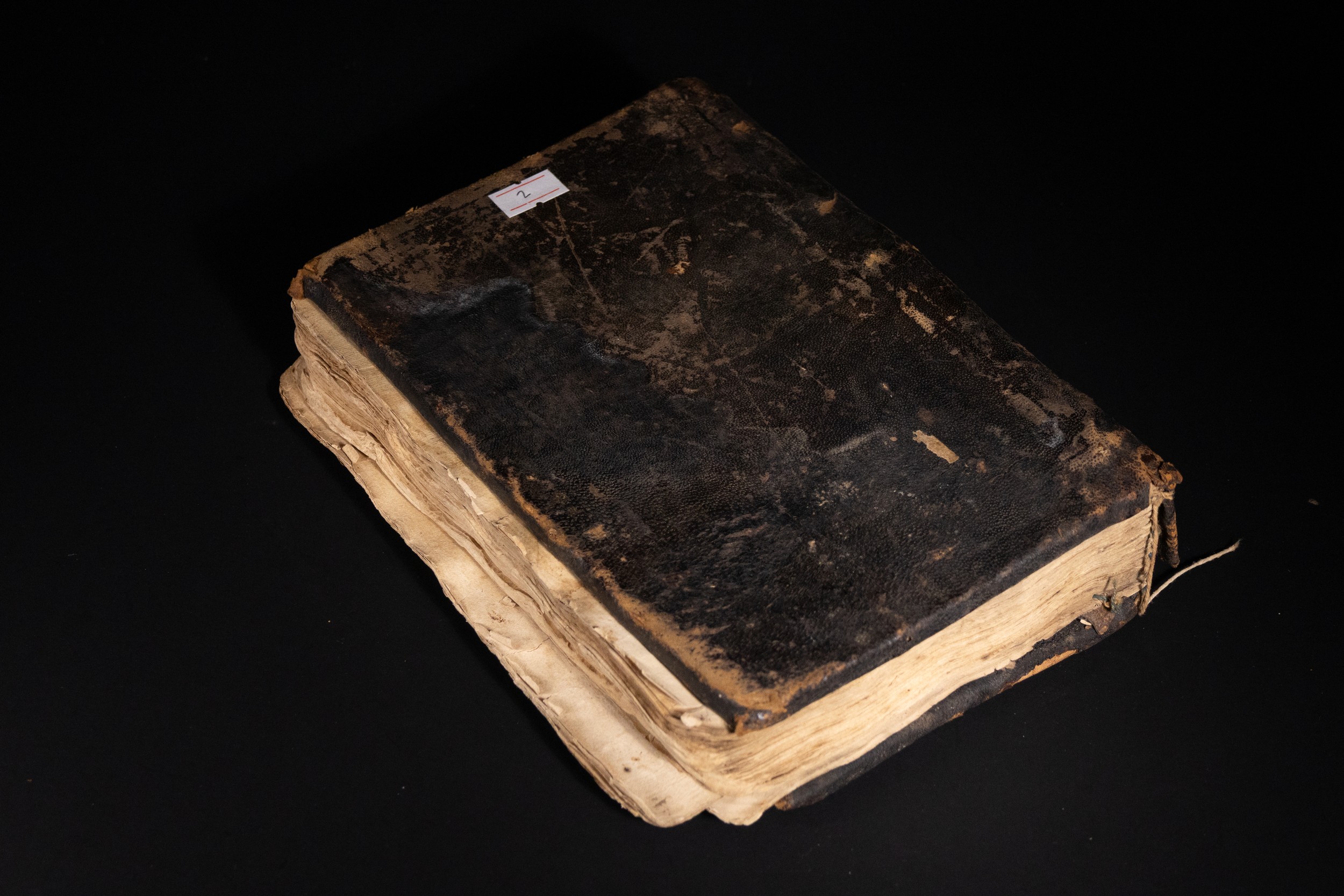 Bound in worn black leather, this manuscript is written in distinctive Maghrebi or West African script. Though incomplete, it bears clear traces of Quranic verses in red and black ink.