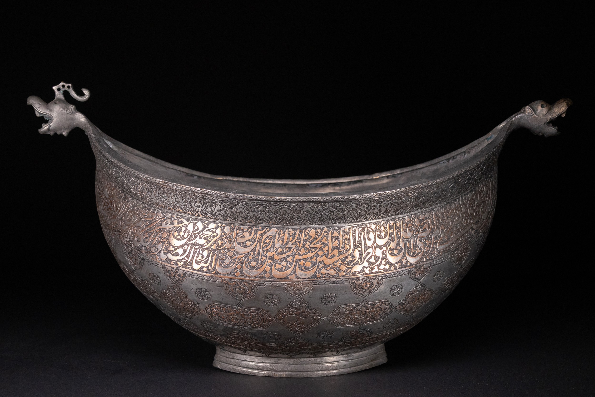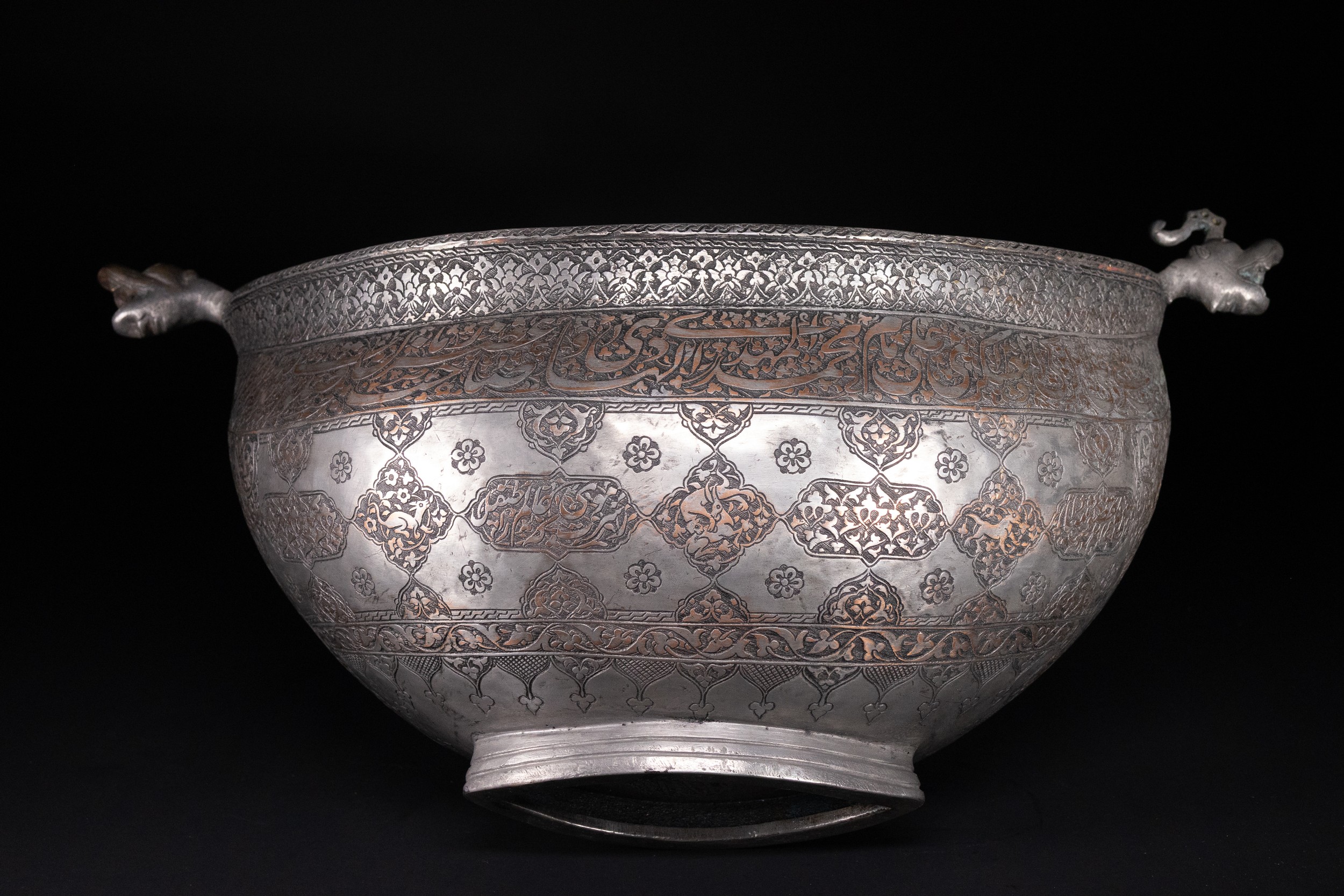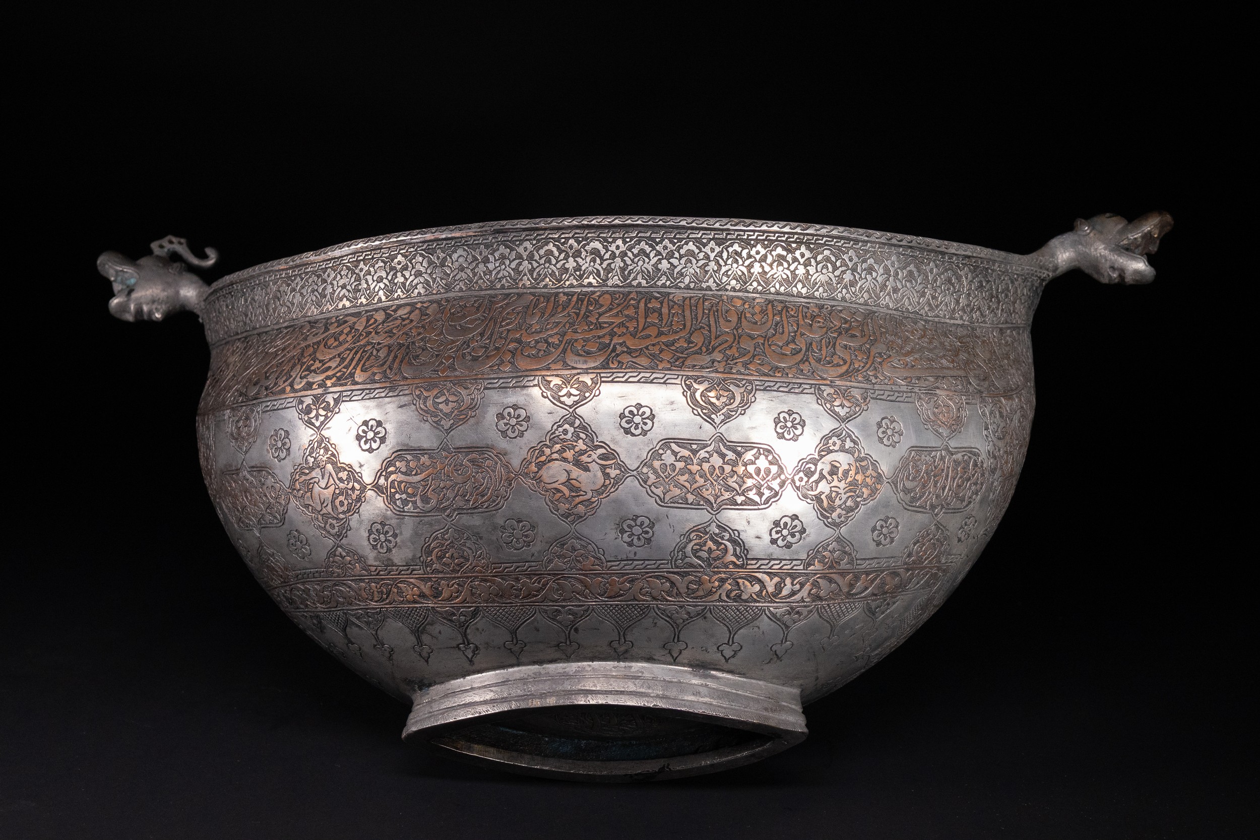 This finely hammered hemispherical basin features extensive bands of inlaid Arabic and Persian calligraphy against a tinned copper ground. The upper register showcases flowing nastaʿlīq script filled with invocations and poetic inscriptions, bordered above by a floral arabesque frieze. Below, a lozenge-patterned field alternates between calligraphic cartouches and paired mythical beasts amid scrolling foliage. Twin dragon-head handles project from either side, adding a dramatic sculptural element. The base bears a central medallion with the word "Allah" inscribed in elegant script.