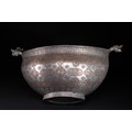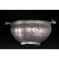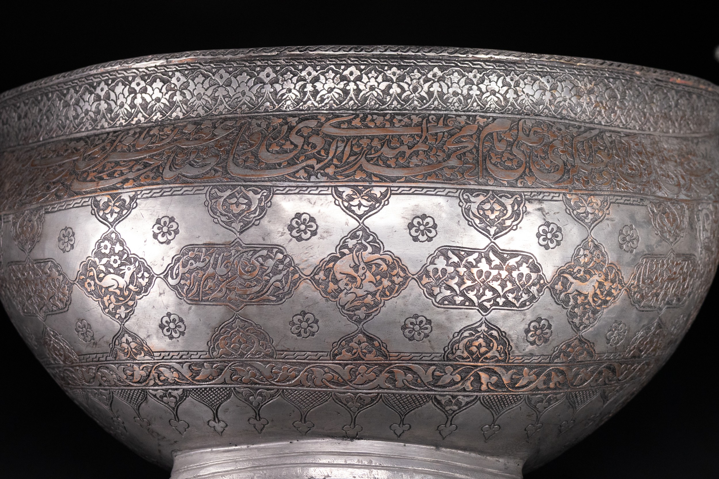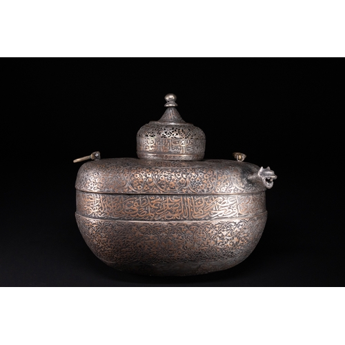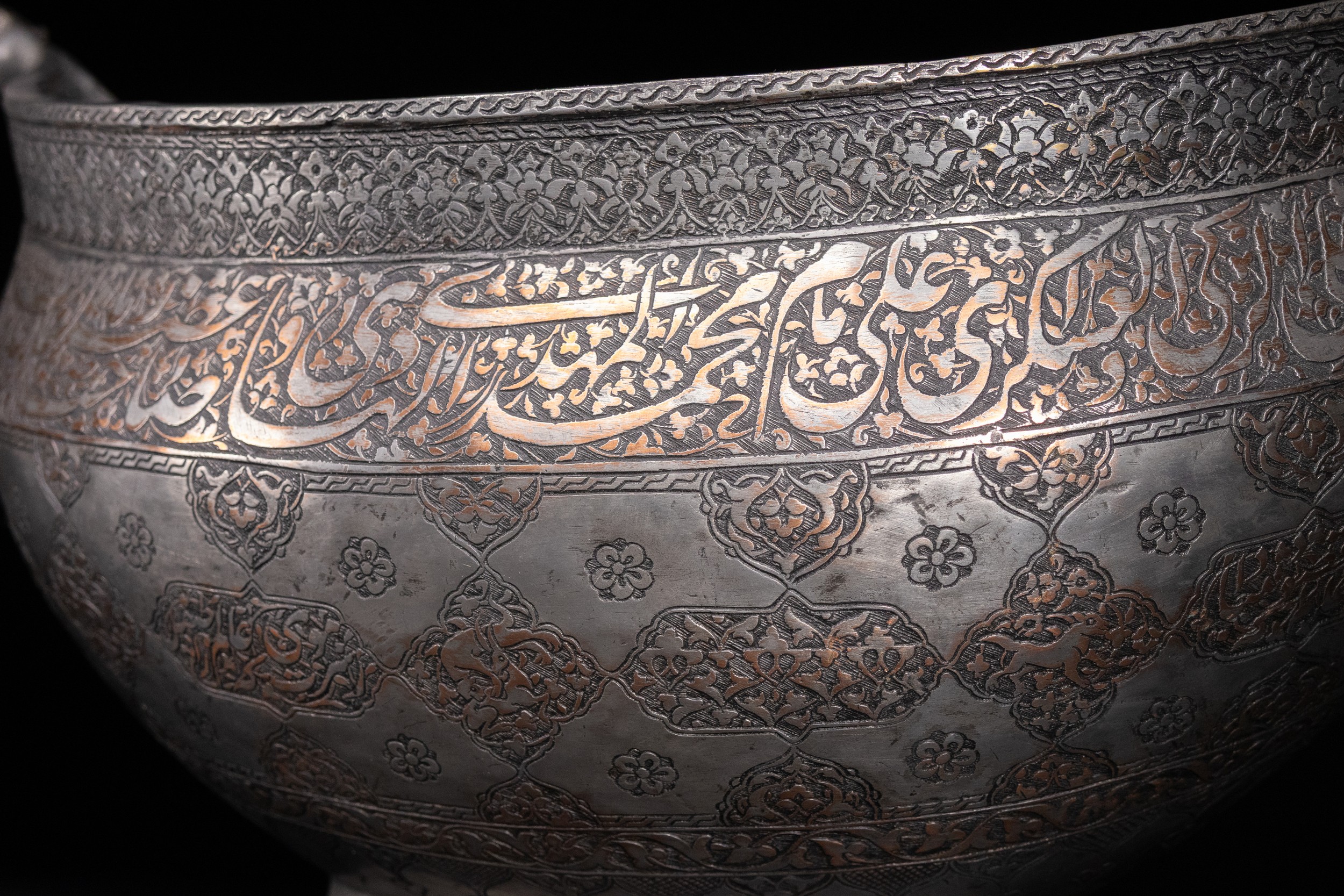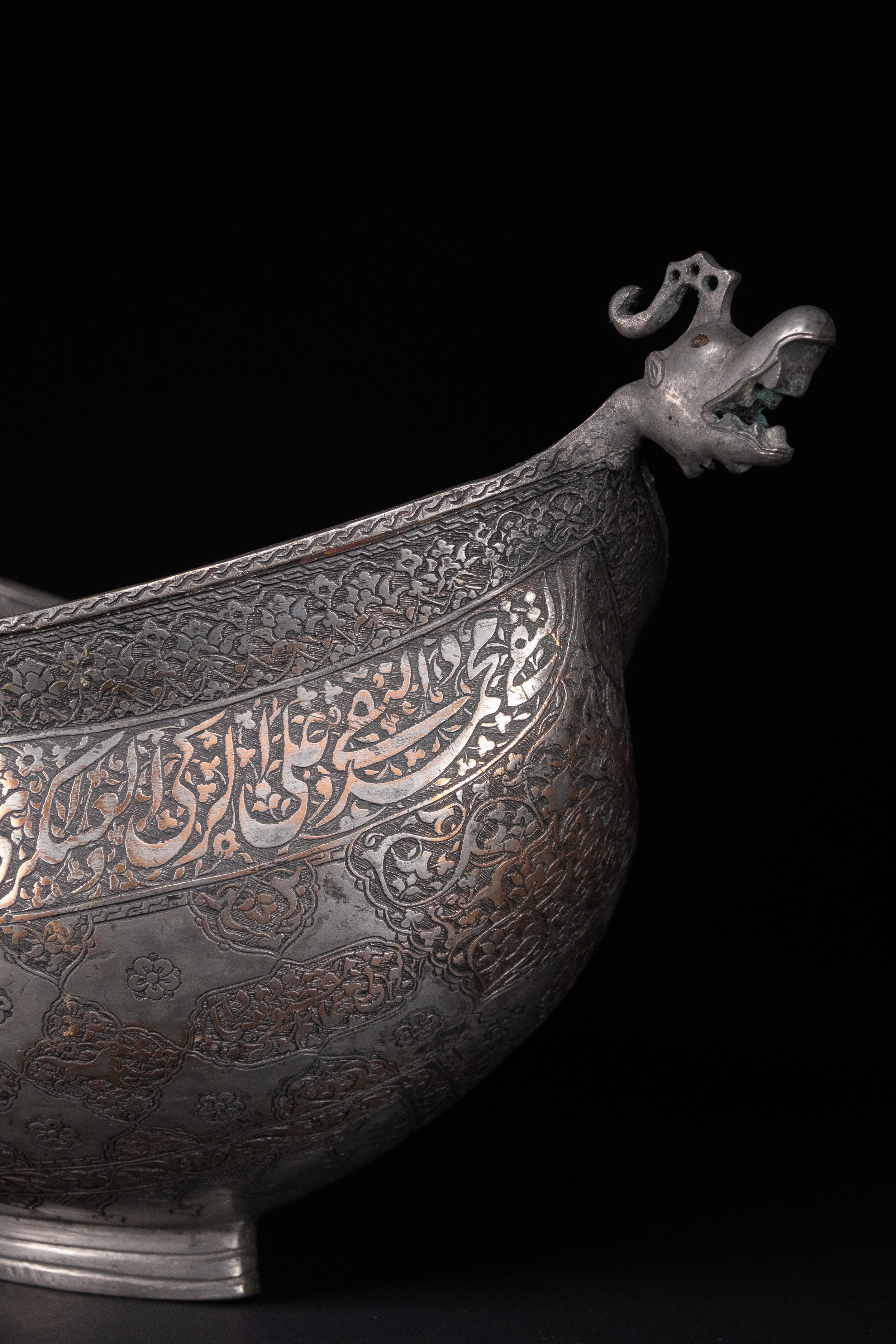 This finely hammered hemispherical basin features extensive bands of inlaid Arabic and Persian calligraphy against a tinned copper ground. The upper register showcases flowing nastaʿlīq script filled with invocations and poetic inscriptions, bordered above by a floral arabesque frieze. Below, a lozenge-patterned field alternates between calligraphic cartouches and paired mythical beasts amid scrolling foliage. Twin dragon-head handles project from either side, adding a dramatic sculptural element. The base bears a central medallion with the word "Allah" inscribed in elegant script.