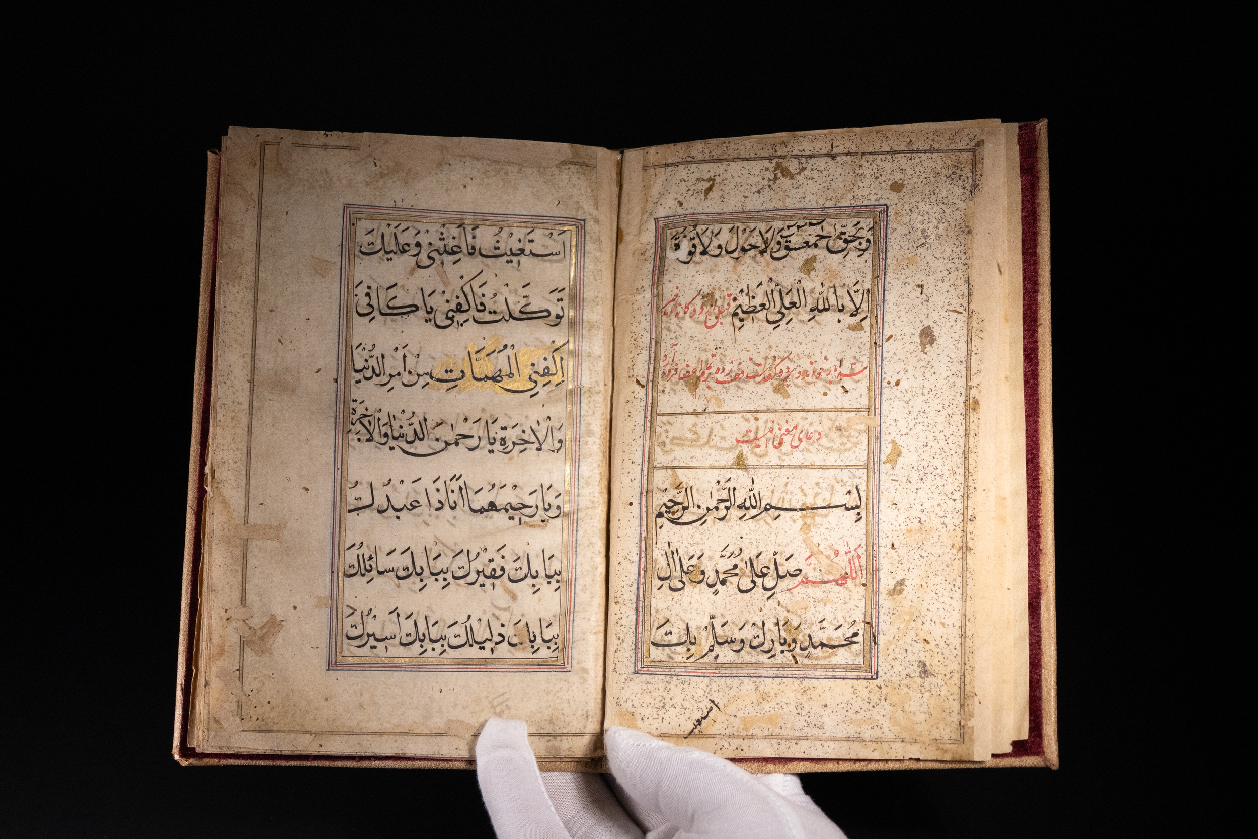 A finely illuminated Islamic manuscript featuring a series of devotional prayers written in elegant Arabic script. The manuscript is richly adorned with gold leaf decoration throughout, including elaborate headings and floral marginal embellishments.