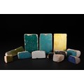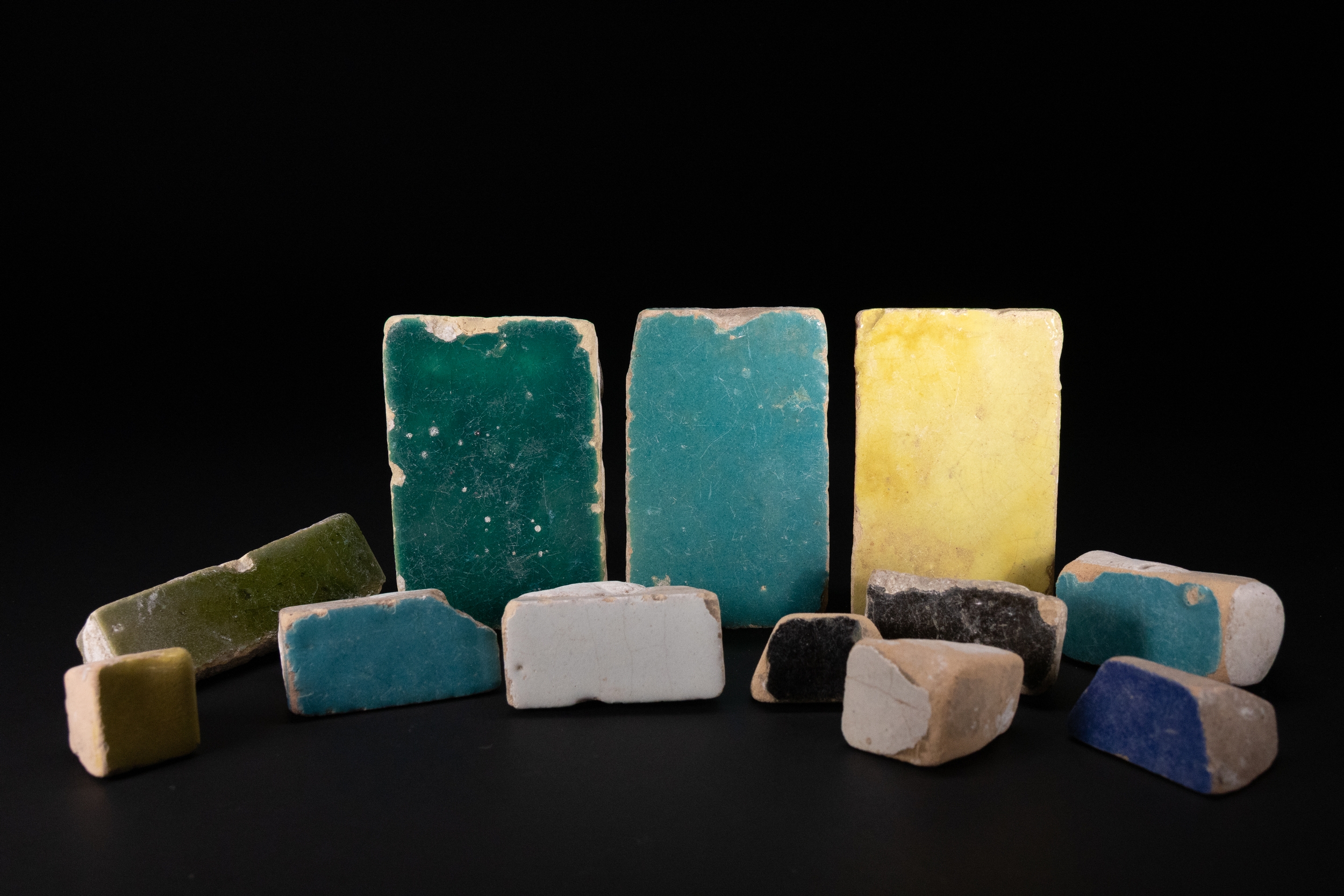A varied group of ceramic tile fragments, rectangular and irregular in form, displaying vibrant glazed surfaces in turquoise, cobalt blue, green, yellow, white, and black tones.