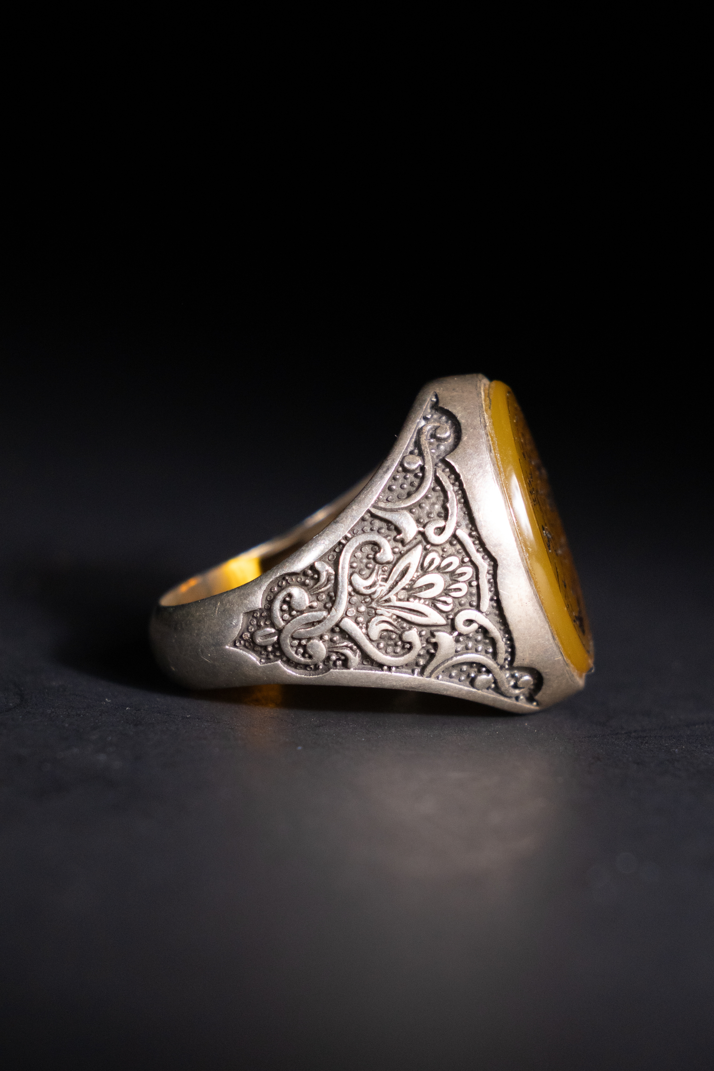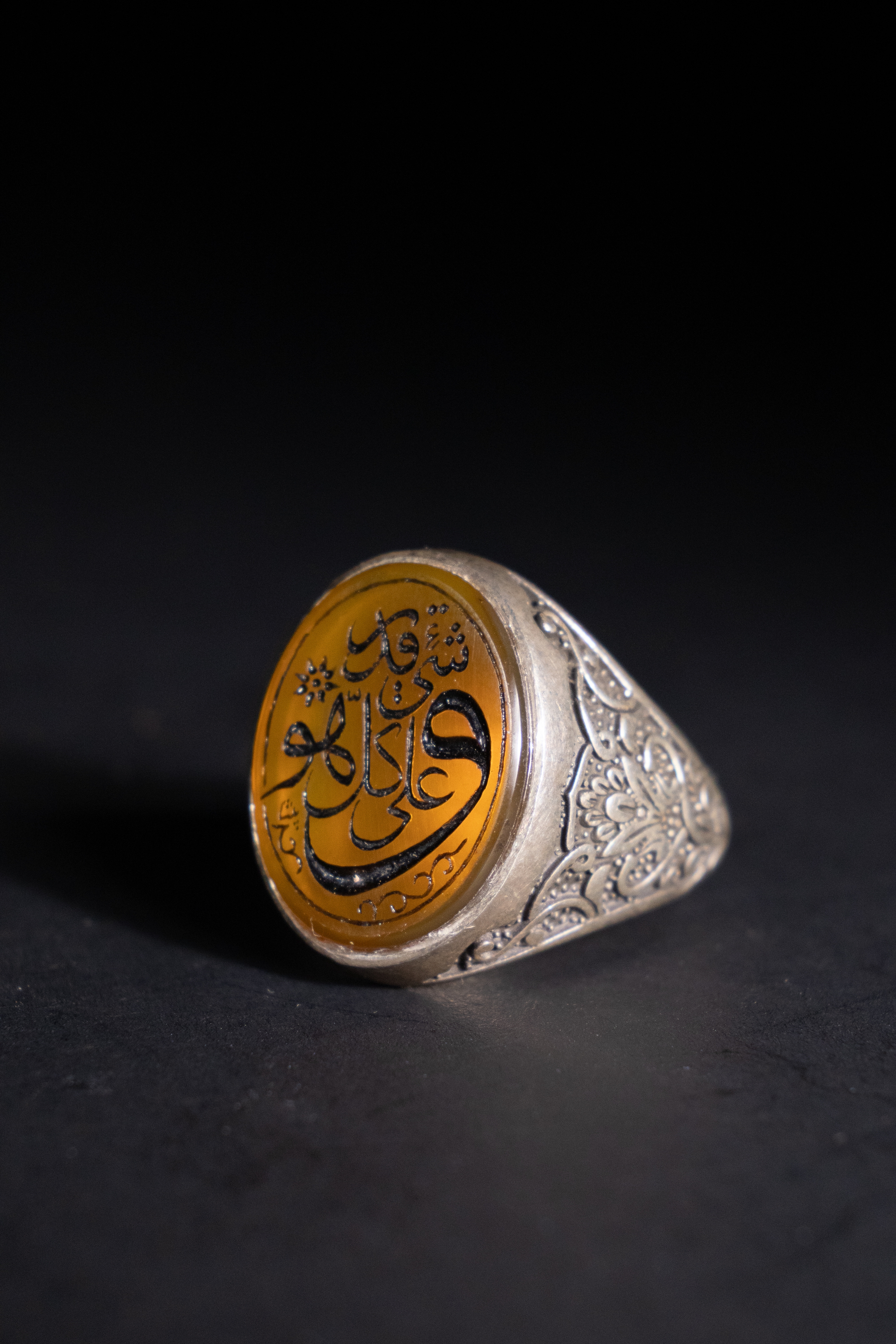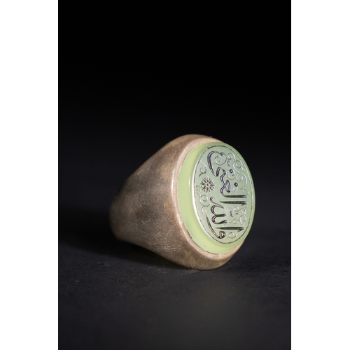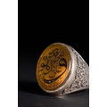 An Islamic Silver Ring with Amber-Toned Agate Inscription.