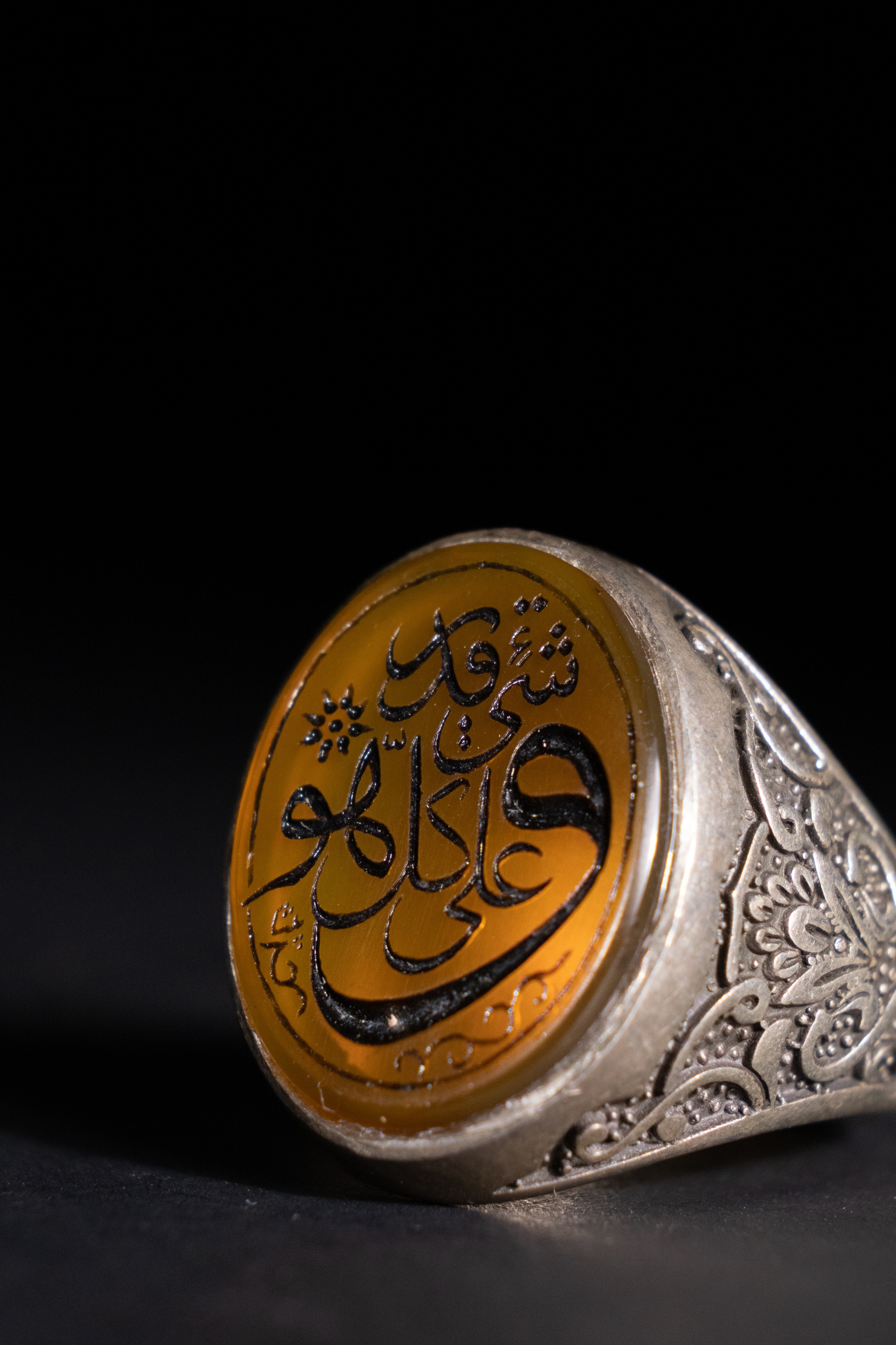 A silver ring featuring an amber-toned agate inscribed in black Arabic script with the phrase "He bore witness that there is no god but Allah, Ali is the wali of Allah".