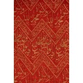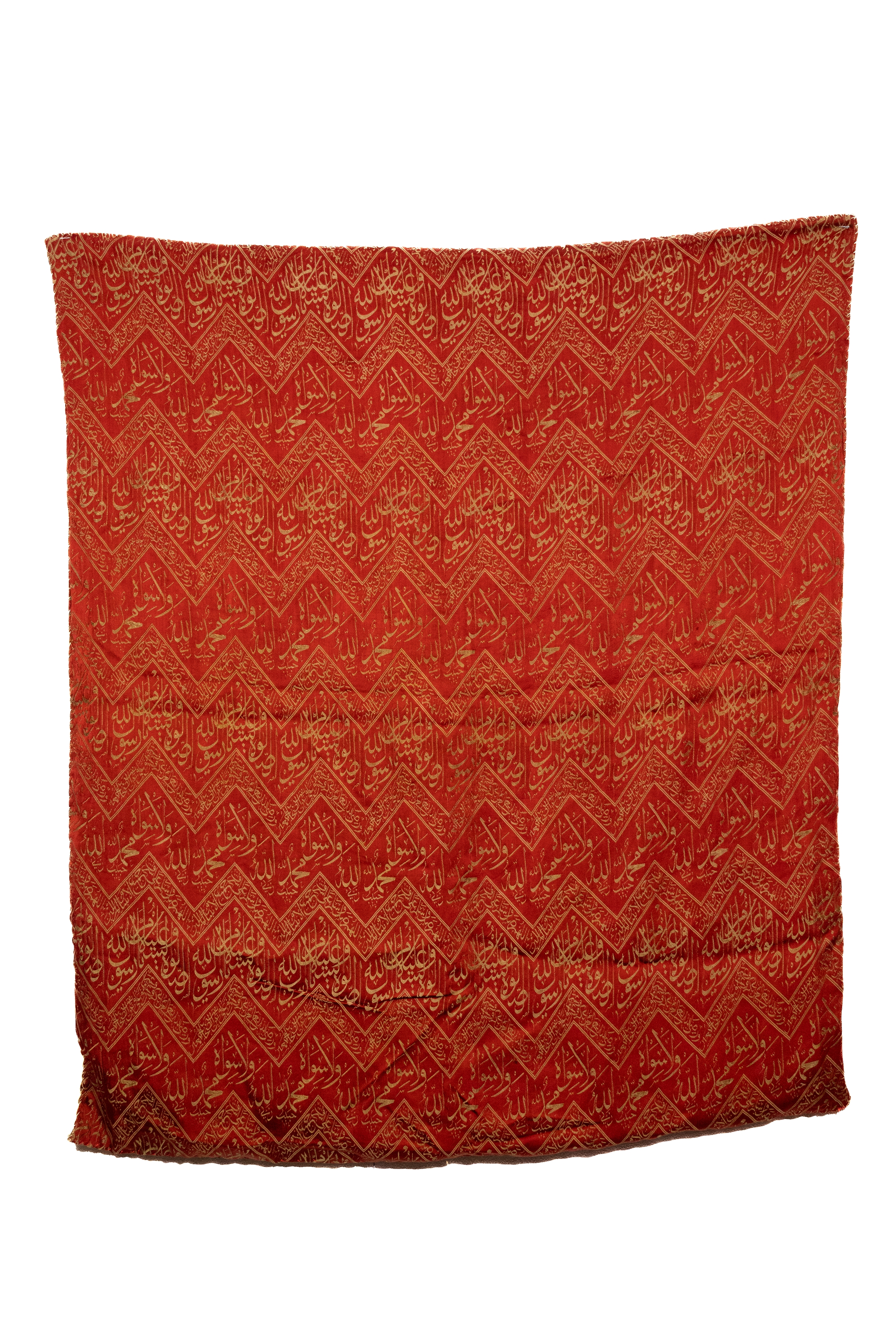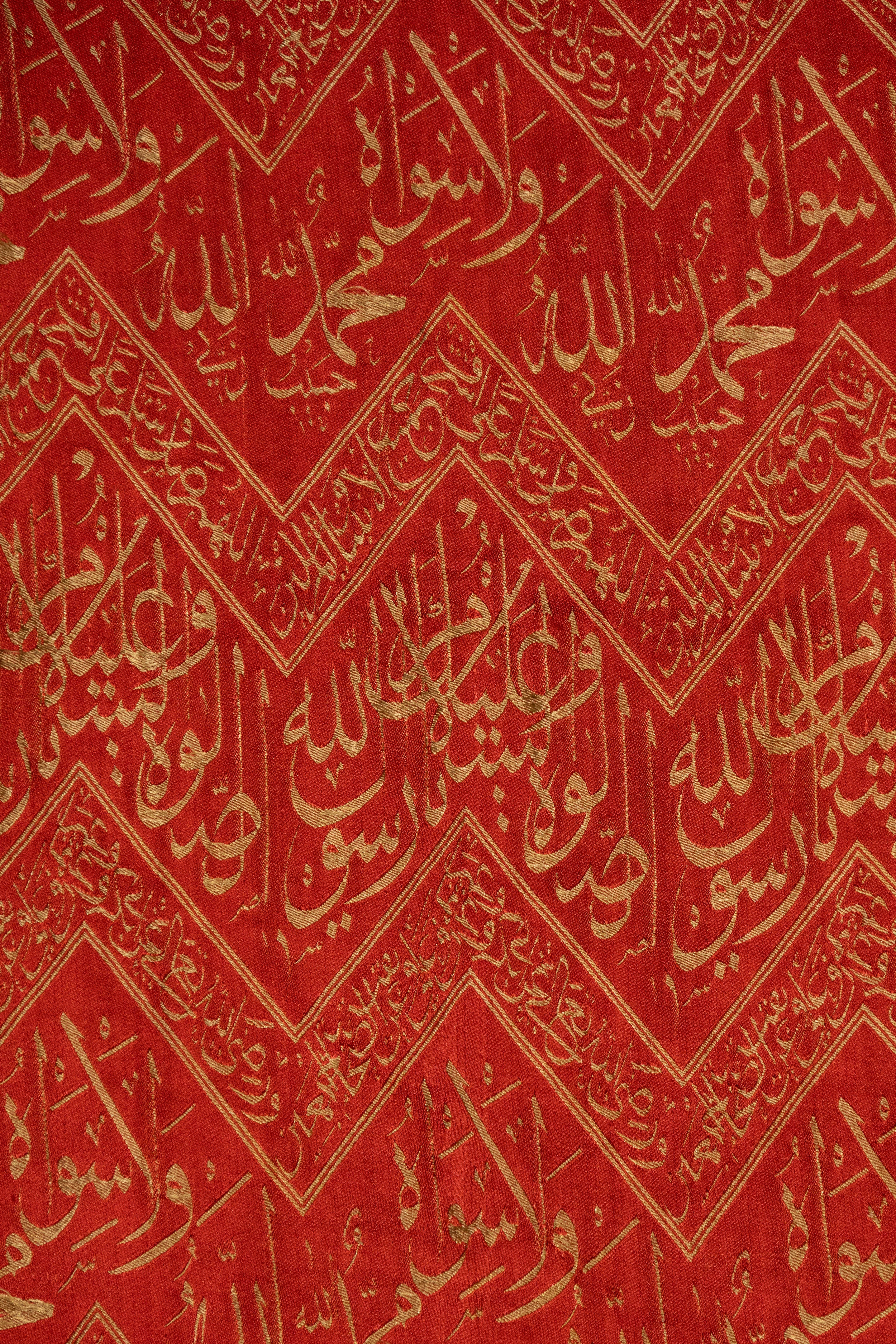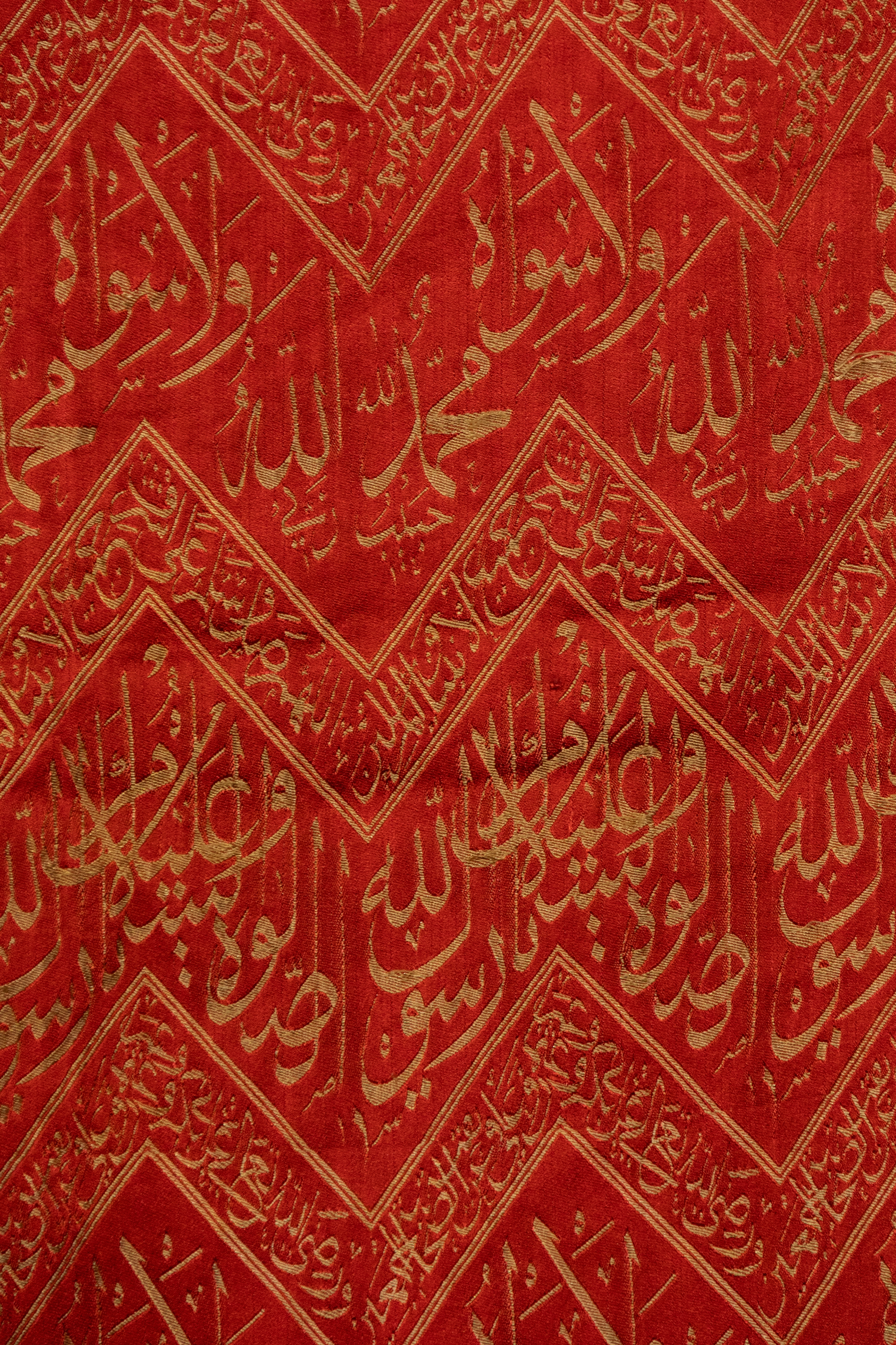 Crafted in rich crimson with woven threaded inscriptions, the composition features repeated diagonal registers of the Shahada (“There is no god but Allah, Muhammad is the Messenger of Allah”) and other Quranic phrases in elegant thuluth script. Each chevron band is bordered with geometric floral motifs.