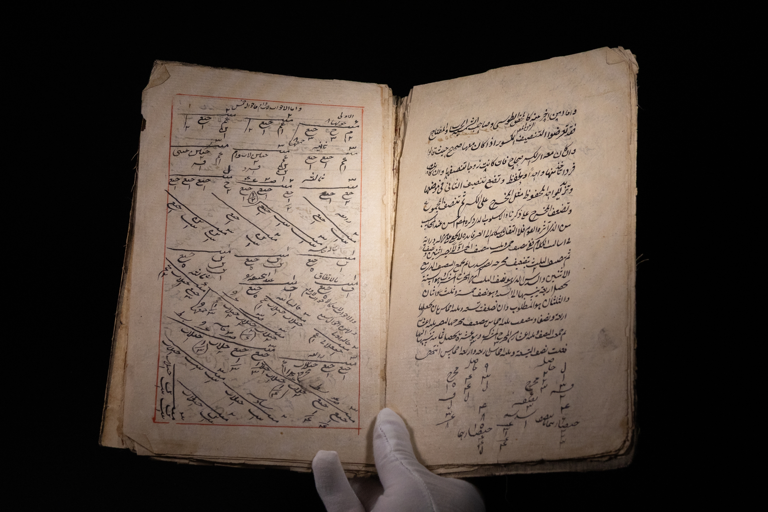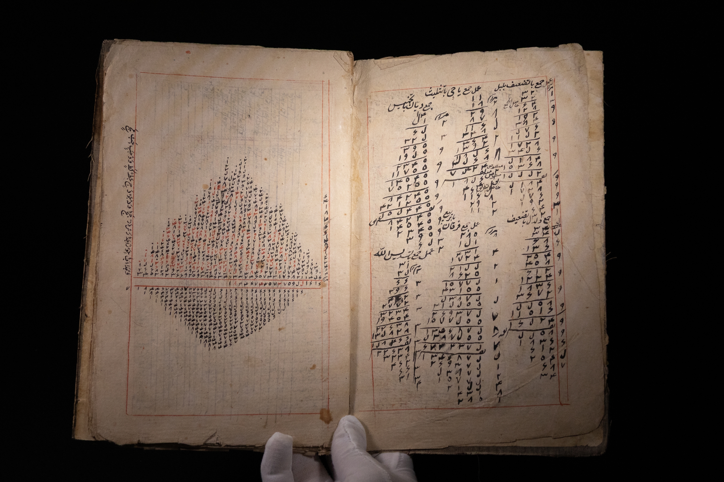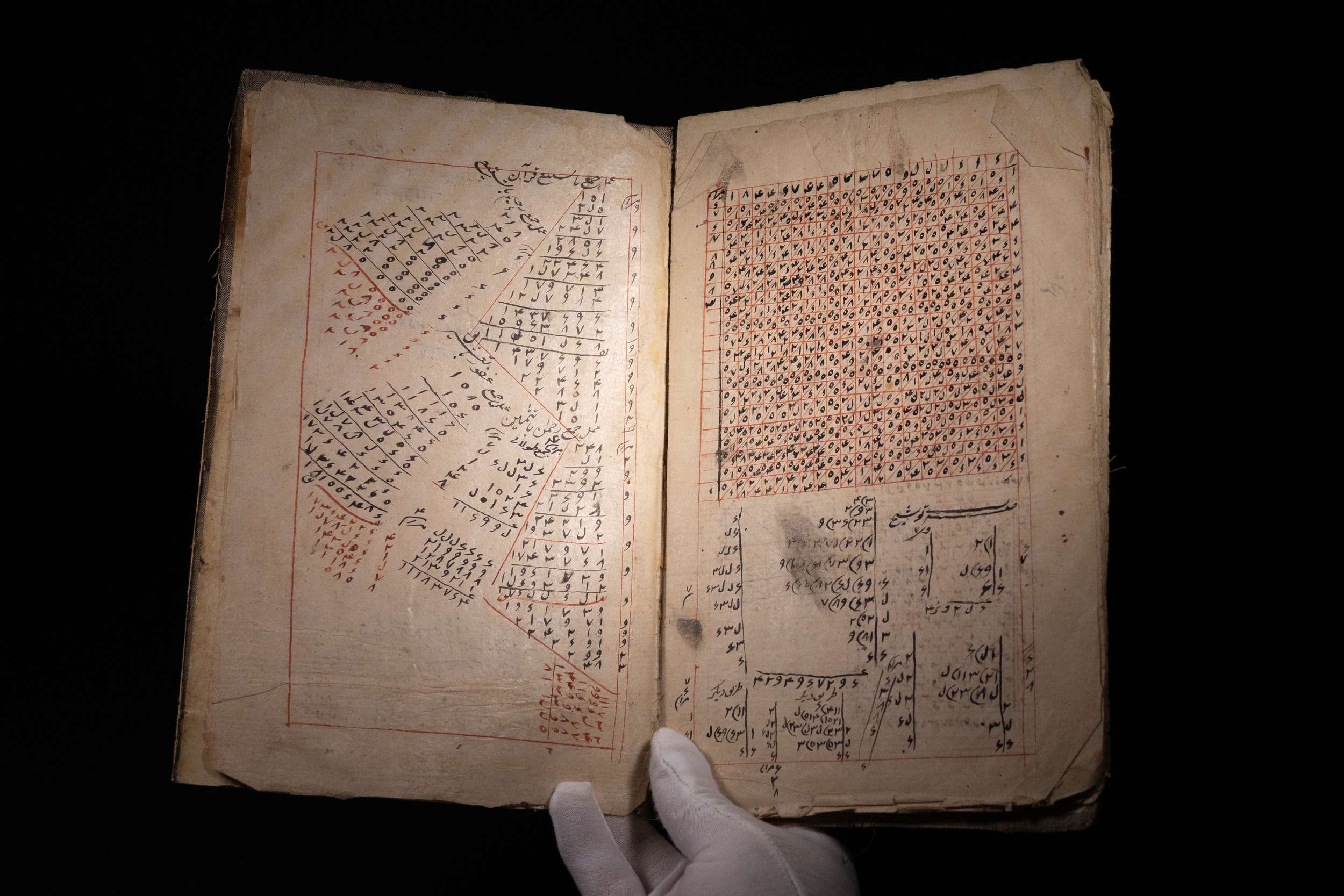A Persian manuscript comprising densely inscribed folios on mathematical and divinatory calculations. The content includes intricate numerical tables, geomantic diagrams, and densely arranged script in black and red ink, framed within ruled borders.