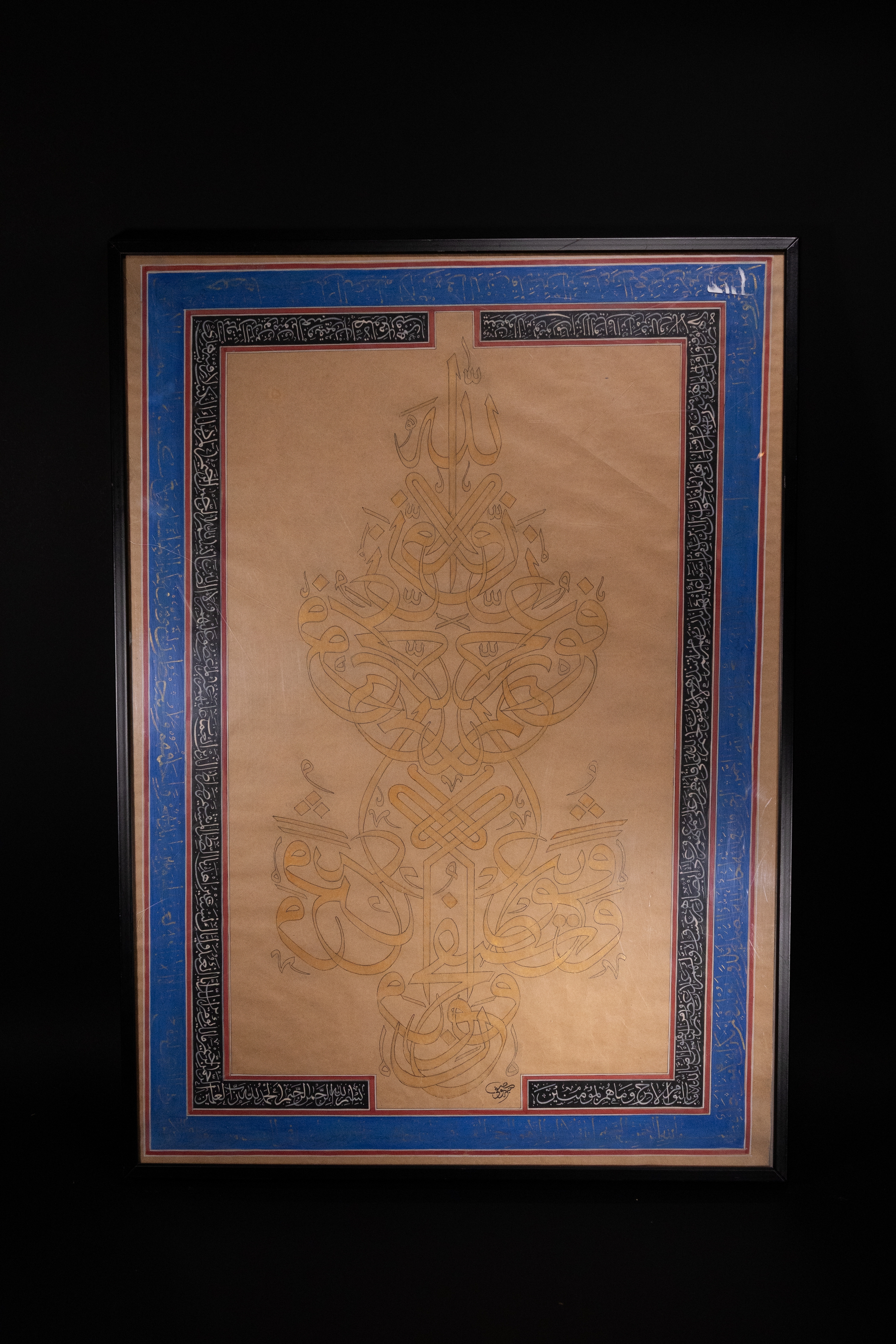 An Ottoman Islamic calligraphic composition rendered on paper, featuring dense swirling lines of Arabic script in the form of a large stylised tughra. The central calligraphy is bordered by an elaborate illuminated frame in deep blue and black panels, inscribed in silver with additional Qur’anic verses and invocations. The calligrapher’s signature appears in the lower right.