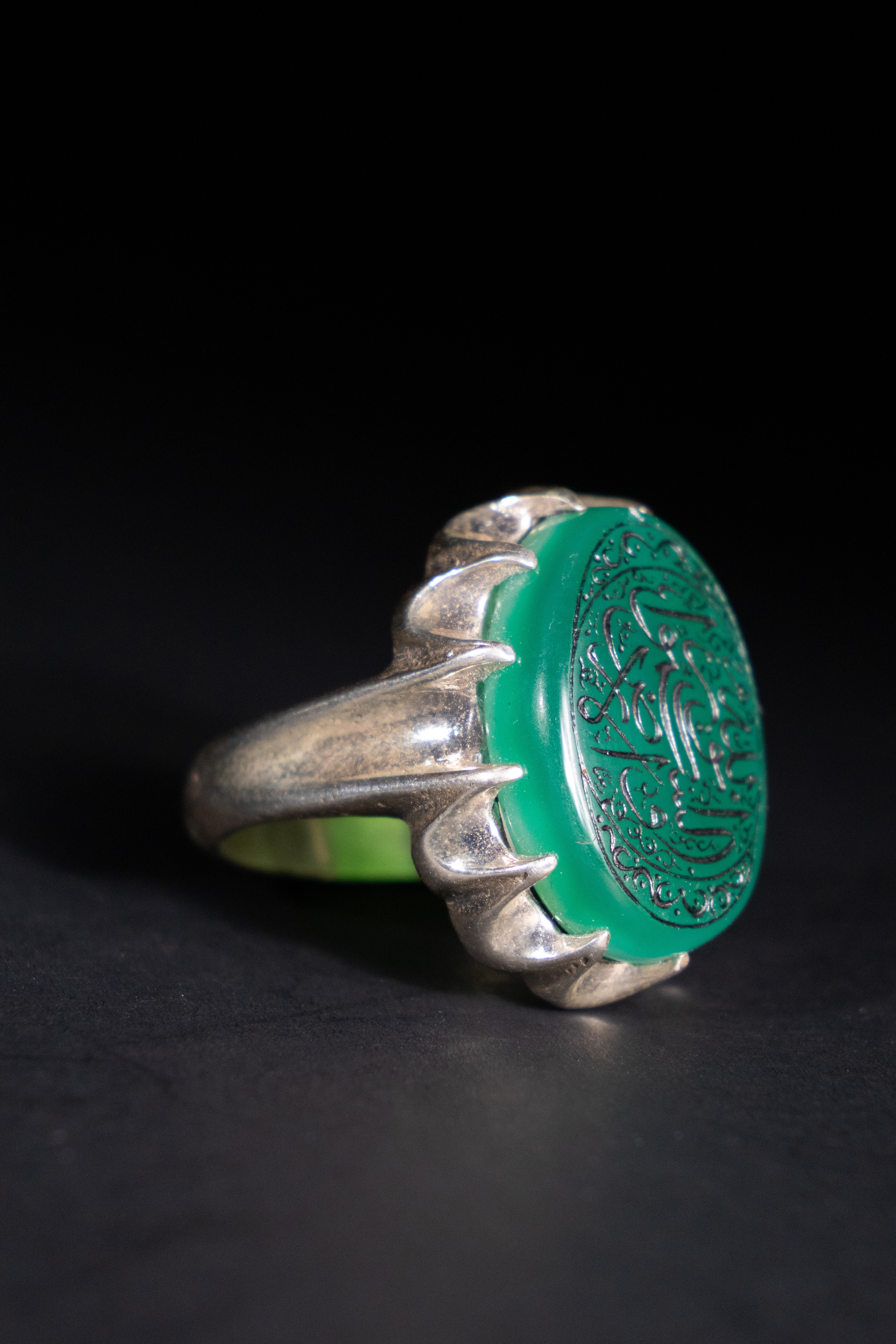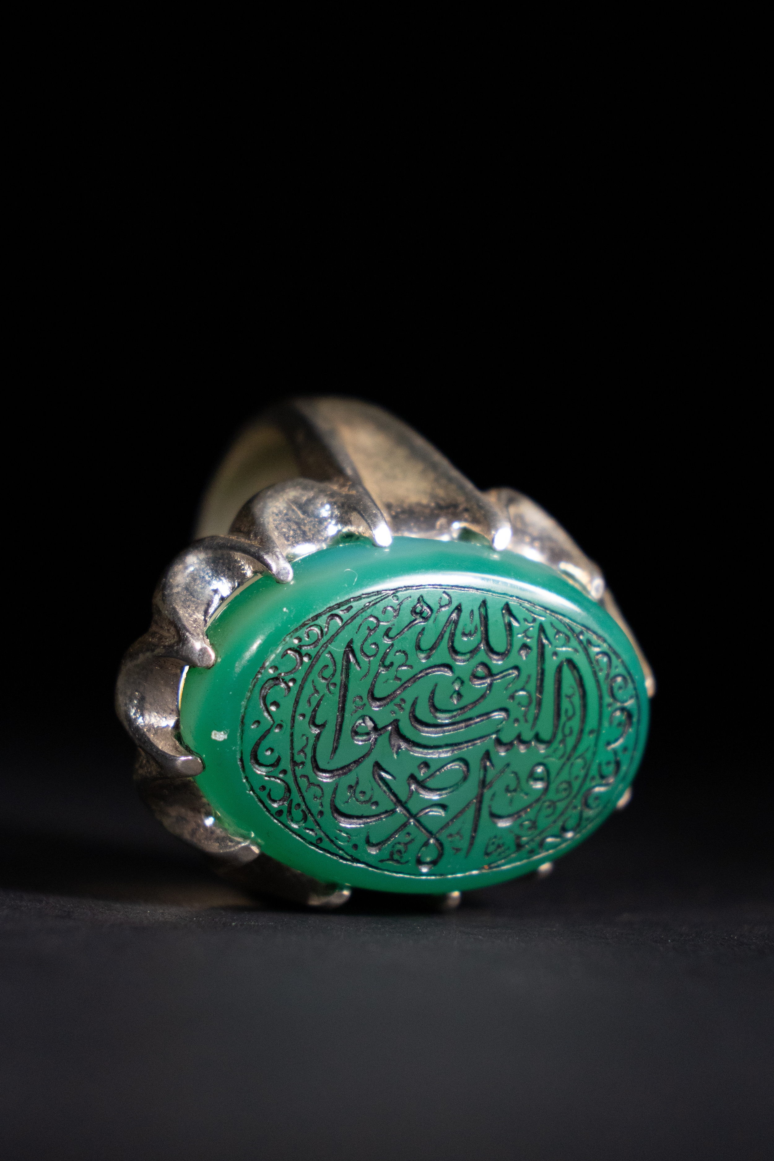 This silver ring features a finely carved green agate stone, oval in shape, held in a raised silver setting with curved prongs. The surface of the agate bears intricate Arabic calligraphy, including the phrase "O Allah, send blessings upon Muhammad and the family of Muhammad", surrounded by decorative motifs.