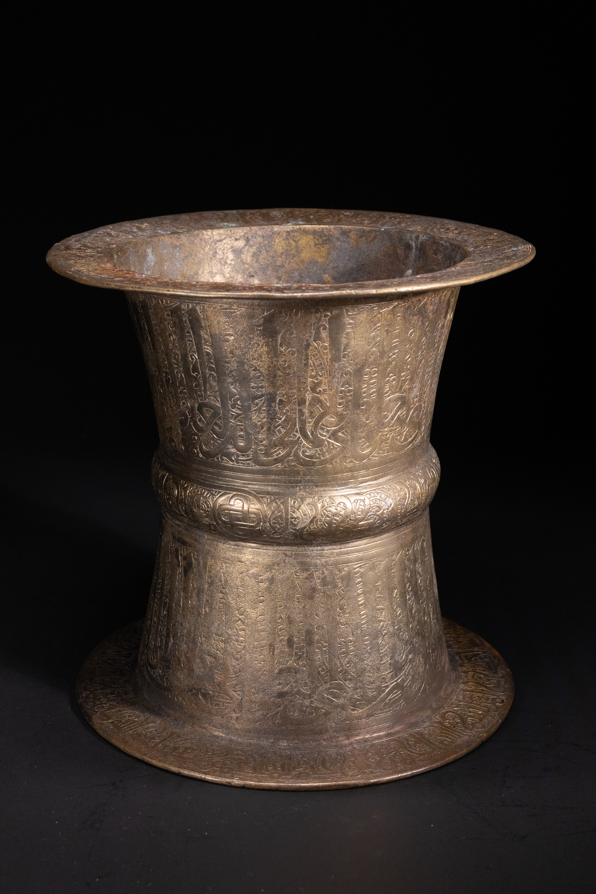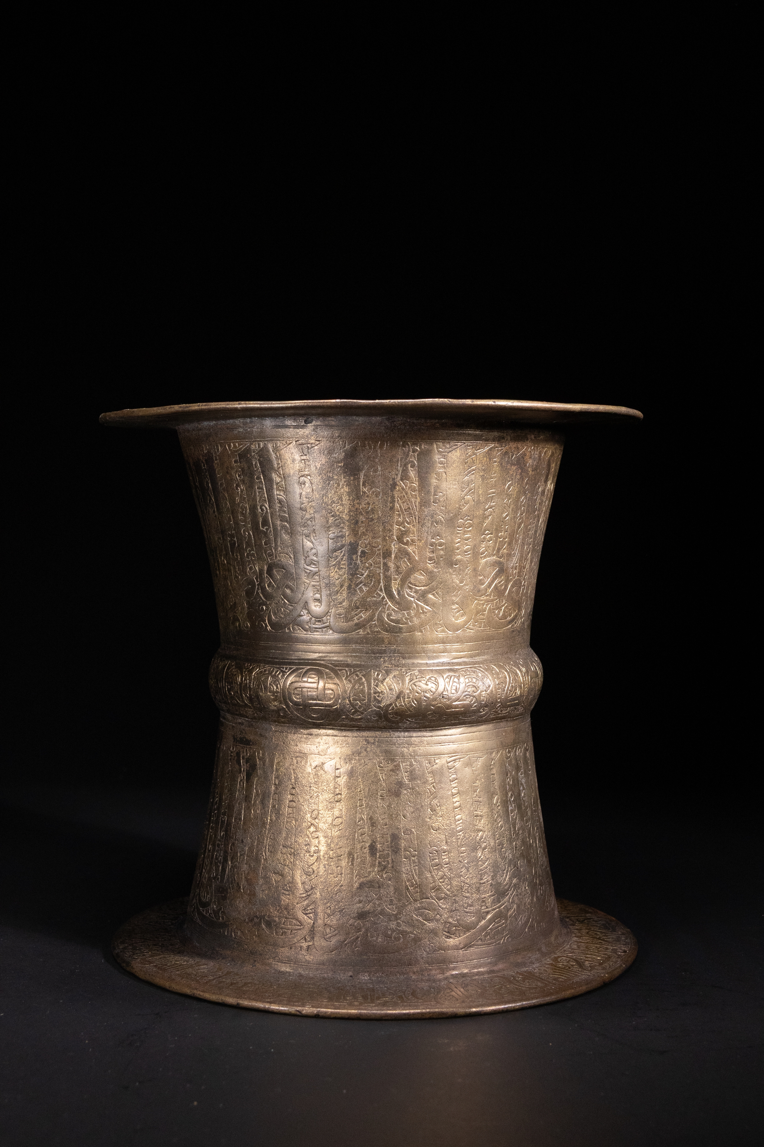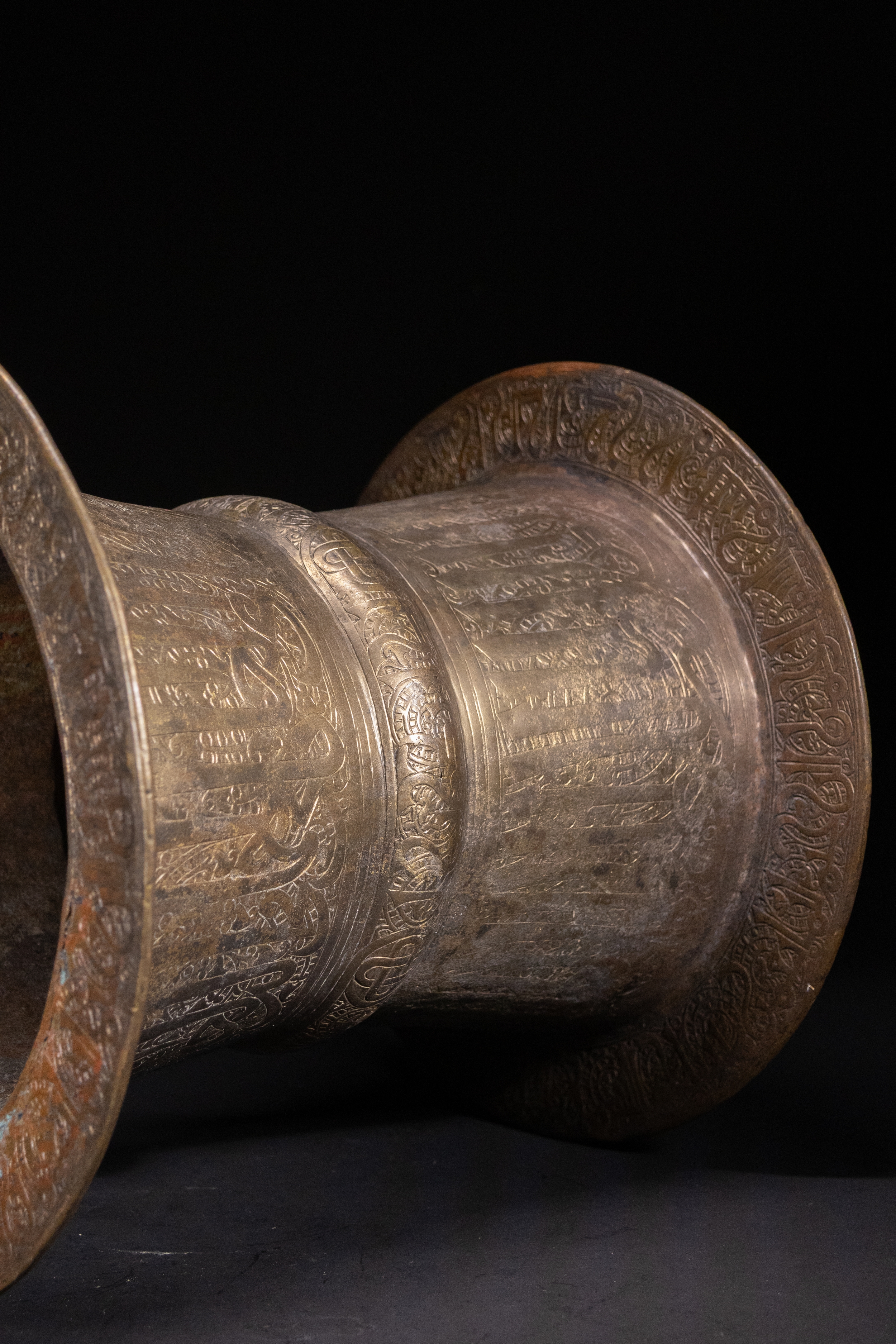 An Islamic brass tray stand featuring a flared and waisted cylindrical body with a broad circular base and rim. The surface is adorned with intricate bands of Arabic inscriptions in thuluth script, repeating around the upper and lower sections, interspersed with geometric and vegetal patterns. The top rim and central band are also finely inscribed, lending the stand a harmonious and symmetrical appearance.