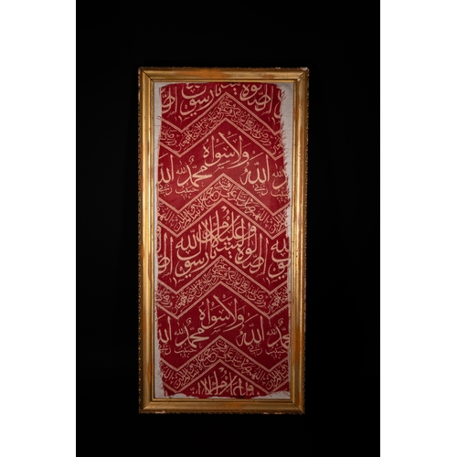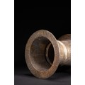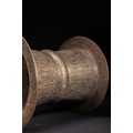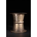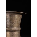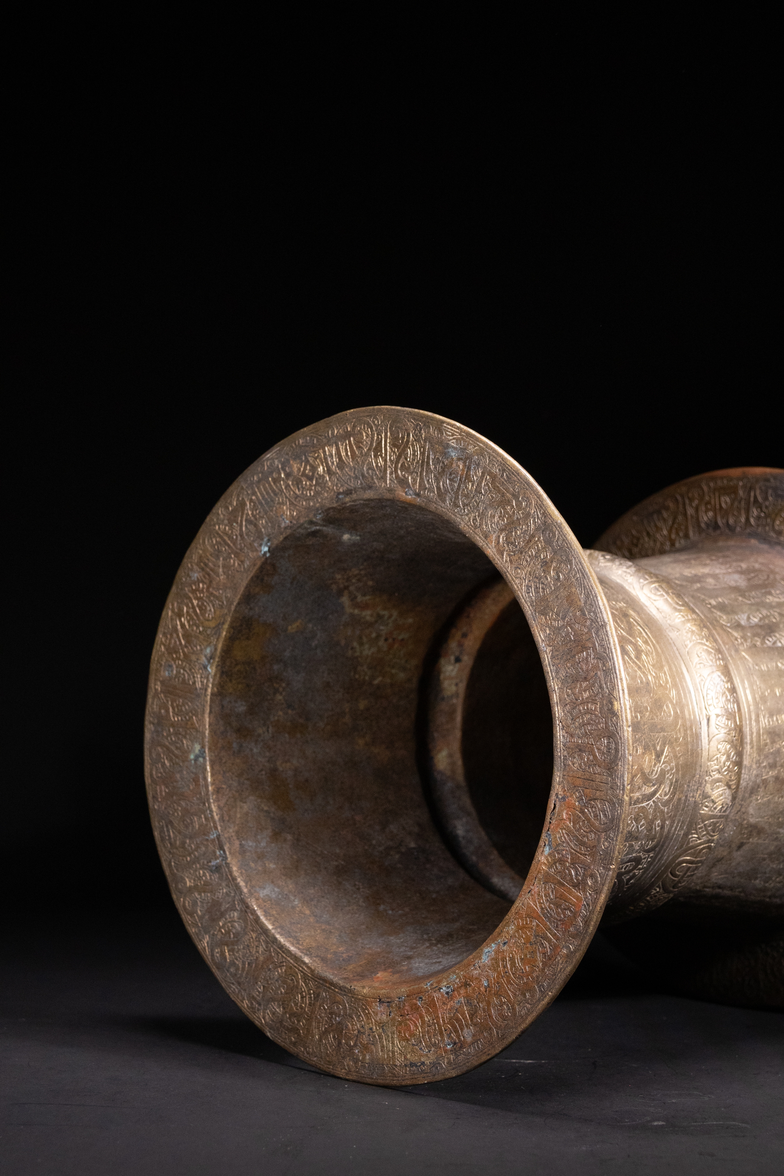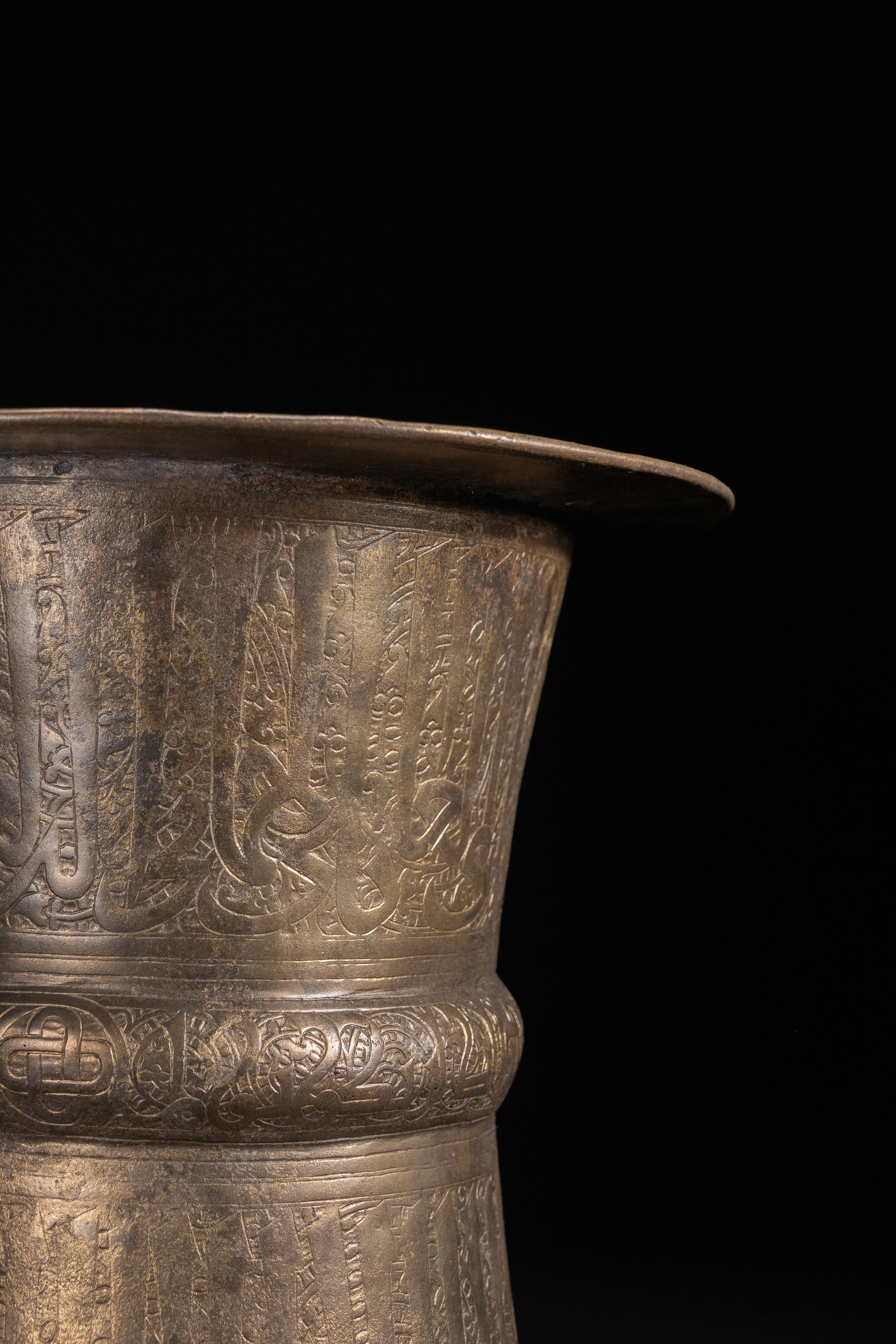 An Islamic brass tray stand featuring a flared and waisted cylindrical body with a broad circular base and rim. The surface is adorned with intricate bands of Arabic inscriptions in thuluth script, repeating around the upper and lower sections, interspersed with geometric and vegetal patterns. The top rim and central band are also finely inscribed, lending the stand a harmonious and symmetrical appearance.