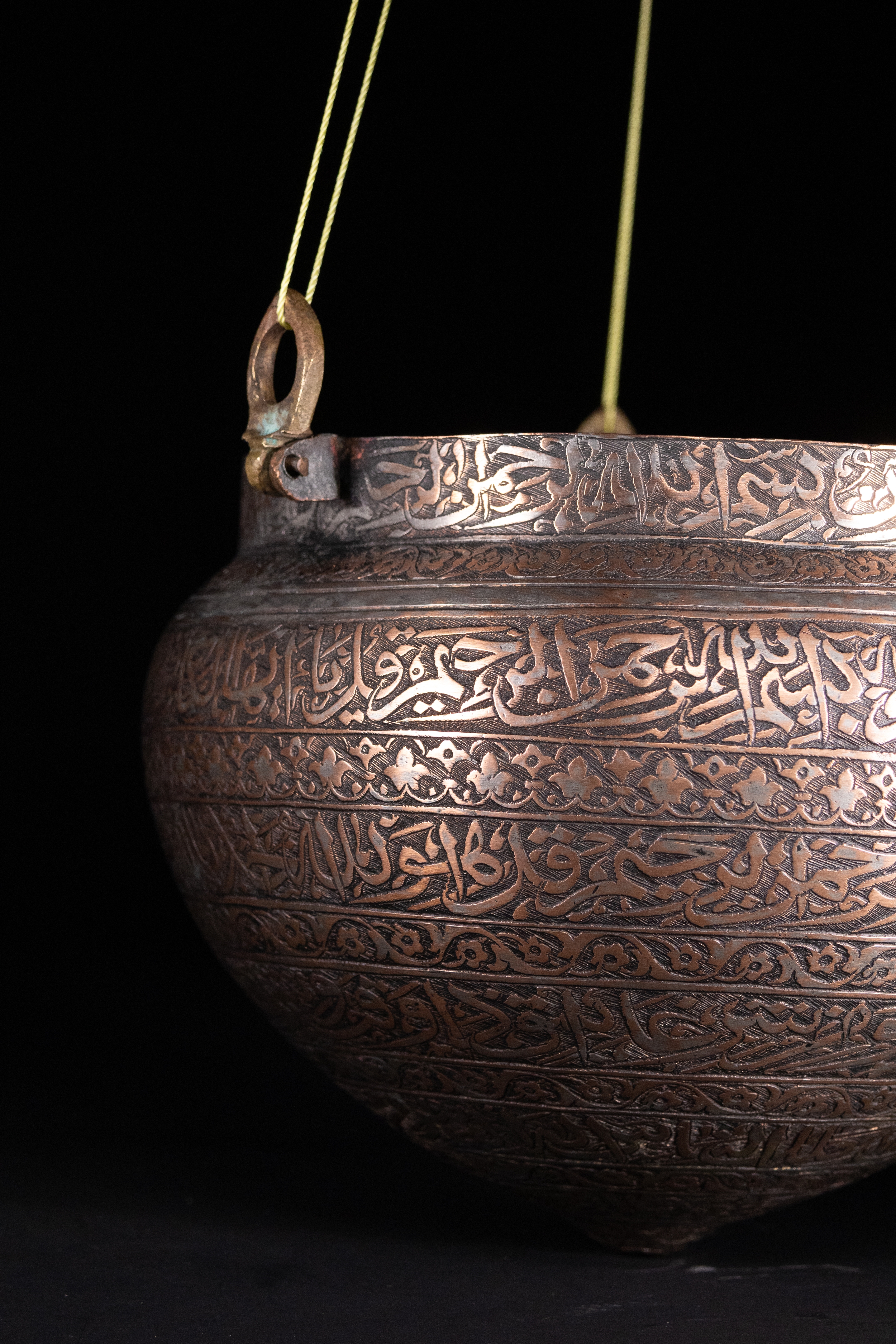 This cast brass hanging lamp features a bulbous form with a pointed base and is finely engraved with multiple bands of Arabic inscriptions, likely comprising Qur'anic verses and invocations. The script is interspersed with delicate floral motifs, adding to the vessel's visual richness. Three suspension loops are affixed to the rim, allowing the lamp to be hung.