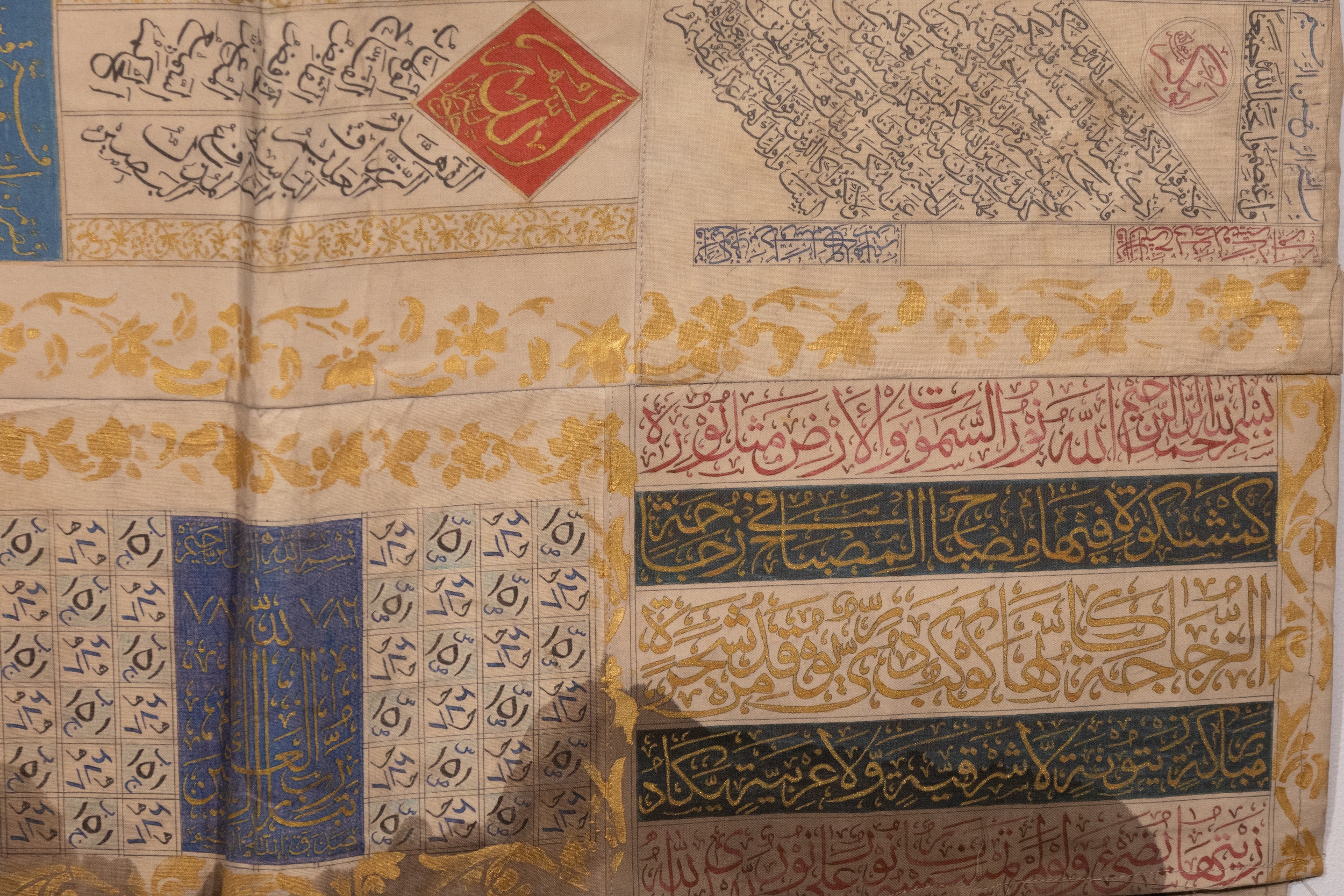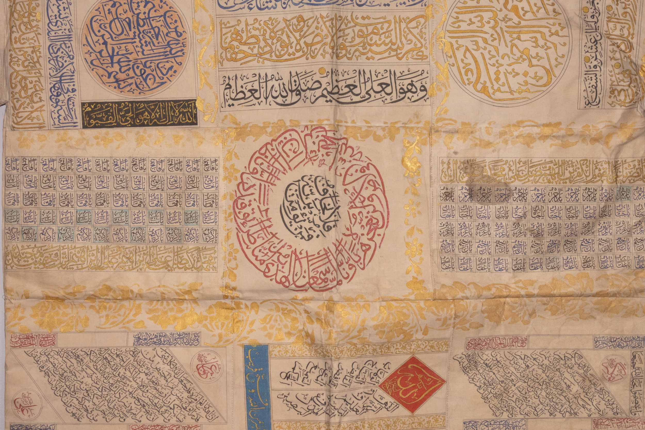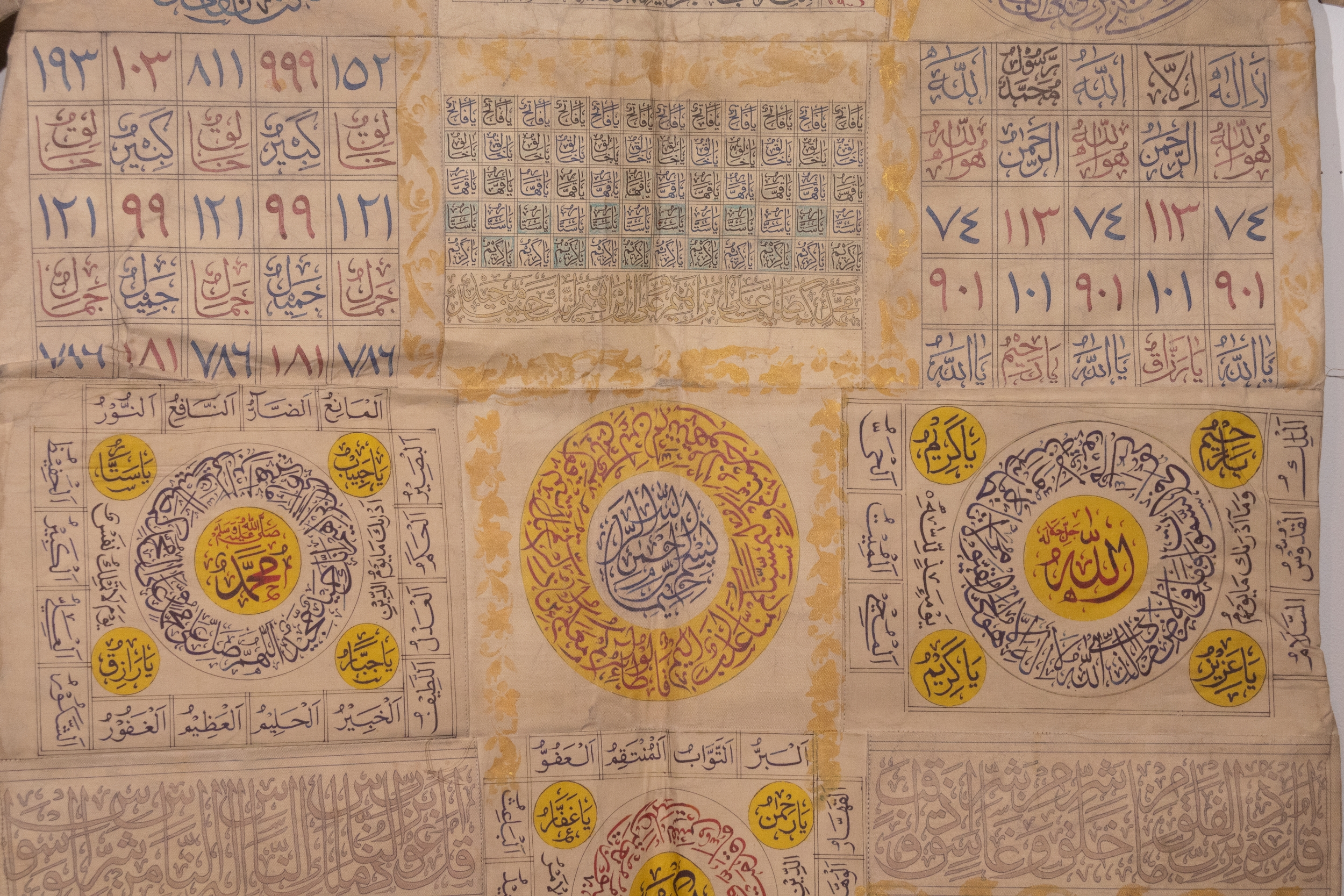 An Ottoman talismanic shirt composed of finely woven fabric meticulously inscribed with Qur'anic verses, Asma’ al-Husna (The 99 Names of Allah), and intricate magic squares. Both the front and back are densely decorated with vibrant black, red, blue, and gold ink, forming circular medallions, linear calligraphy, and numerical grids believed to offer divine protection. Often worn under garments by warriors or high-ranking individuals.