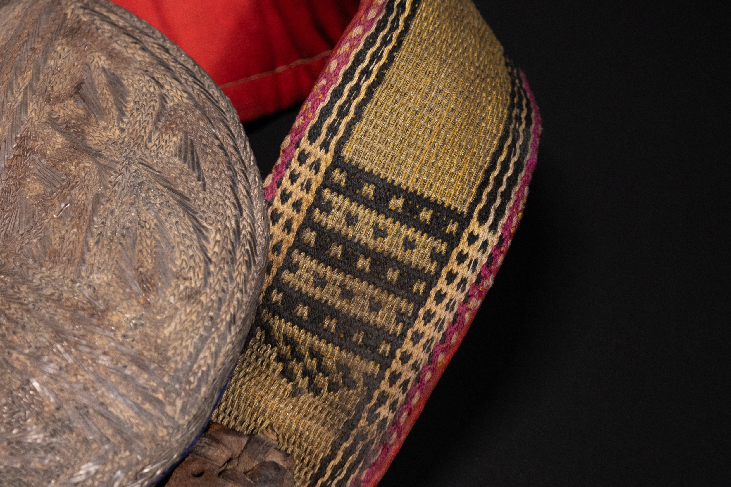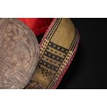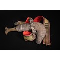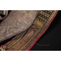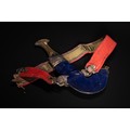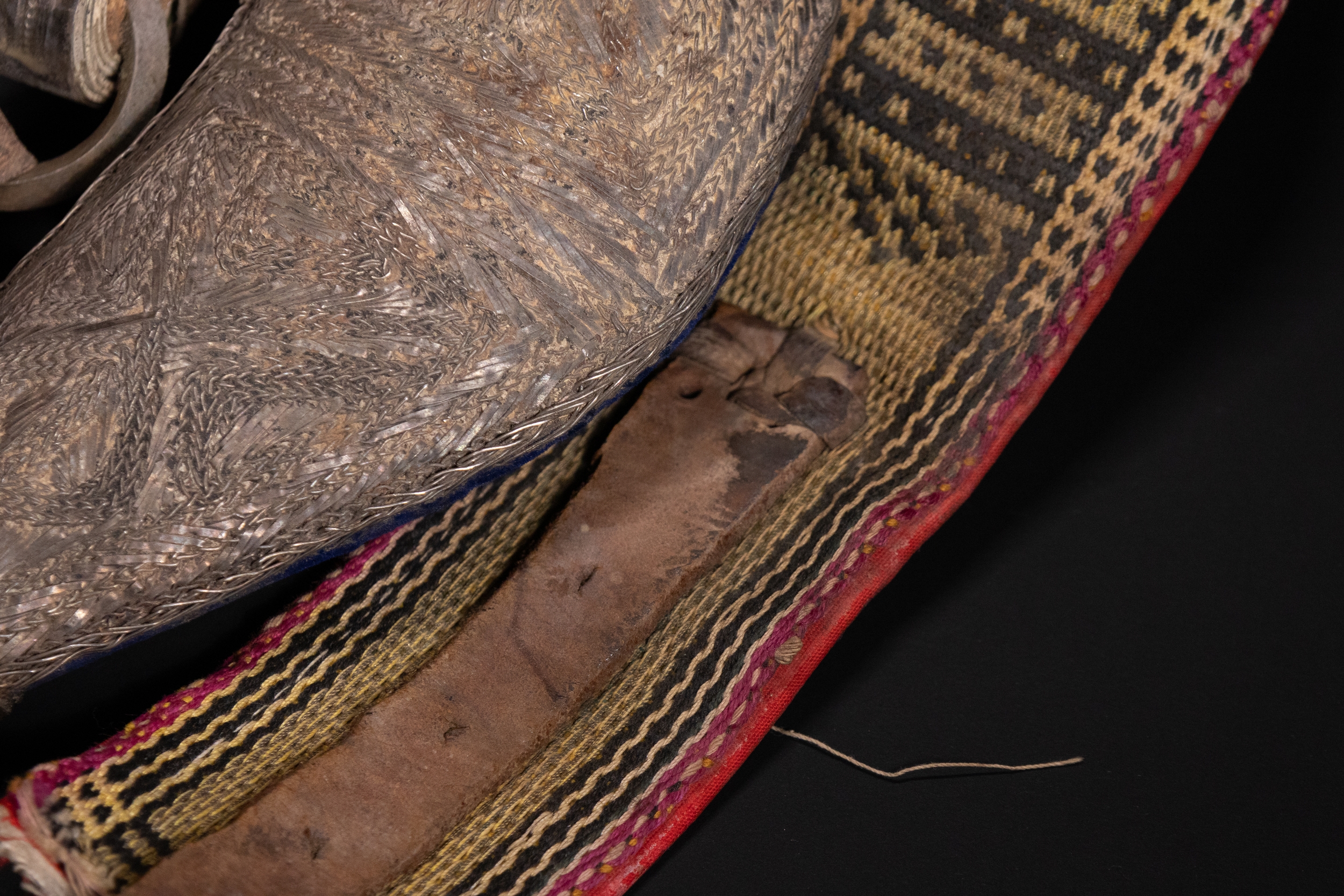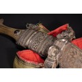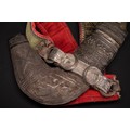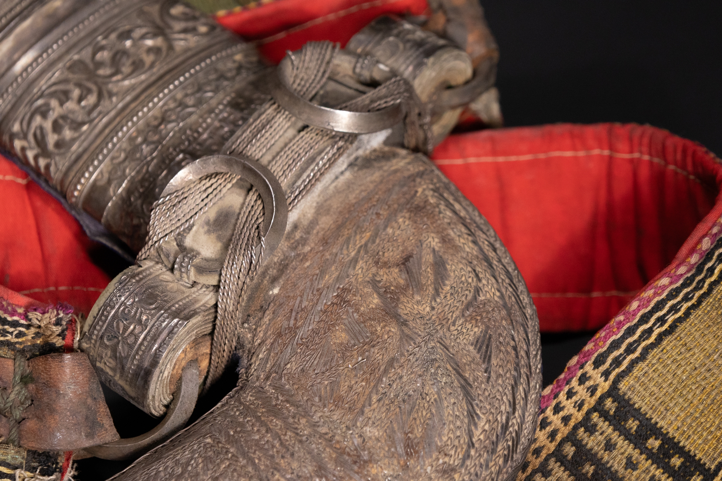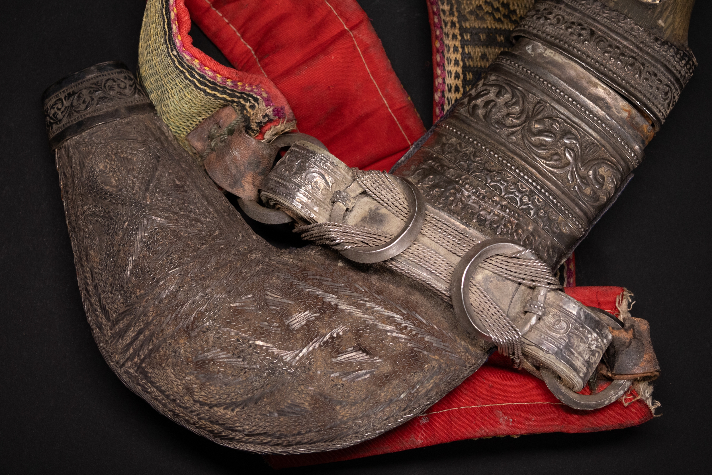 The hilt is crafted from dark rhino horn with rounded pommel ends, adorned with floral white metal bosses. The scabbard is clad in intricately chased white metal with geometric and foliate motifs, featuring raised bands and multiple suspension rings attached to plaited cords. The reverse is lined in rich blue velvet and mounted with a woven textile belt in yellow and black with red borders.