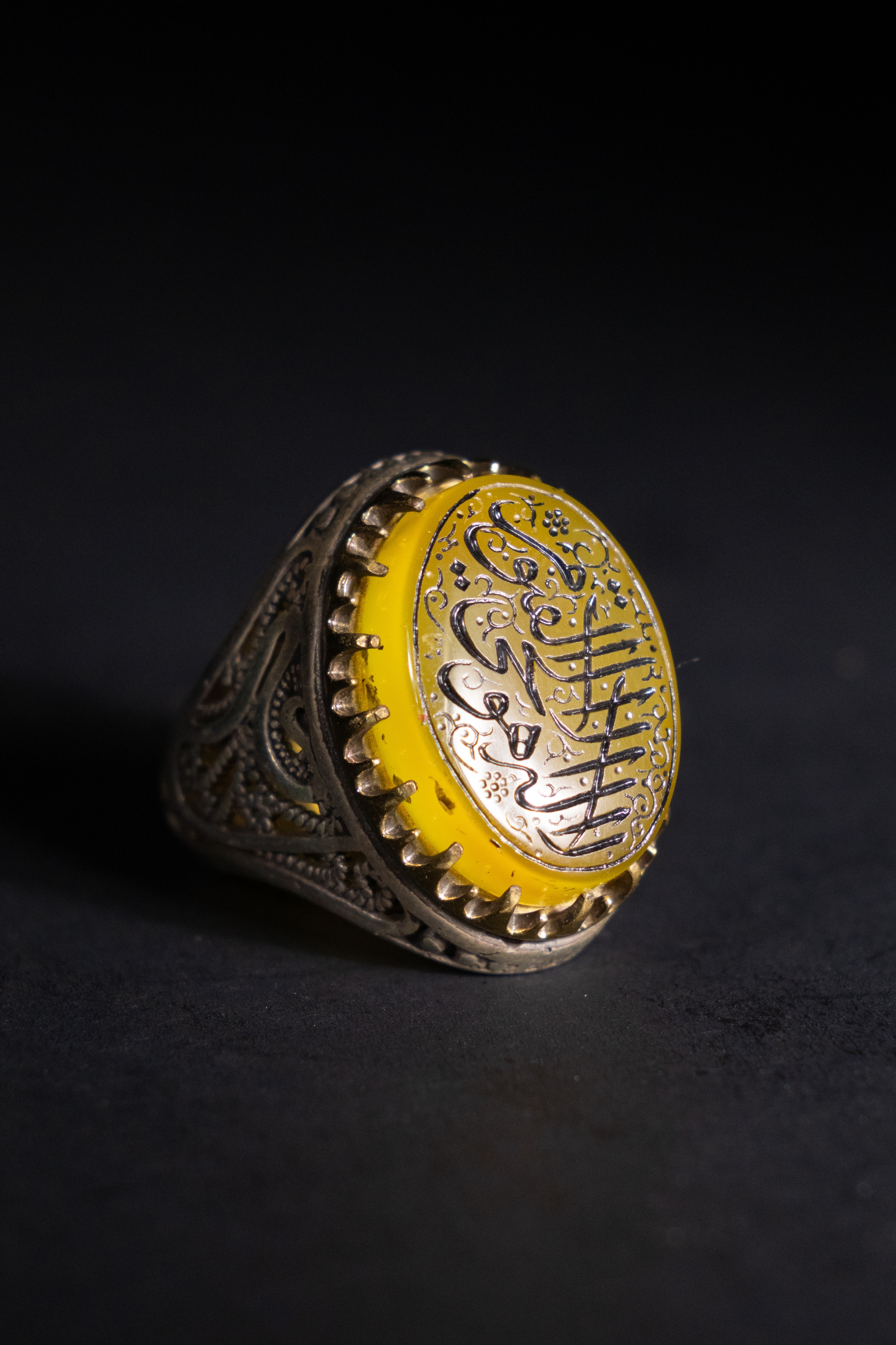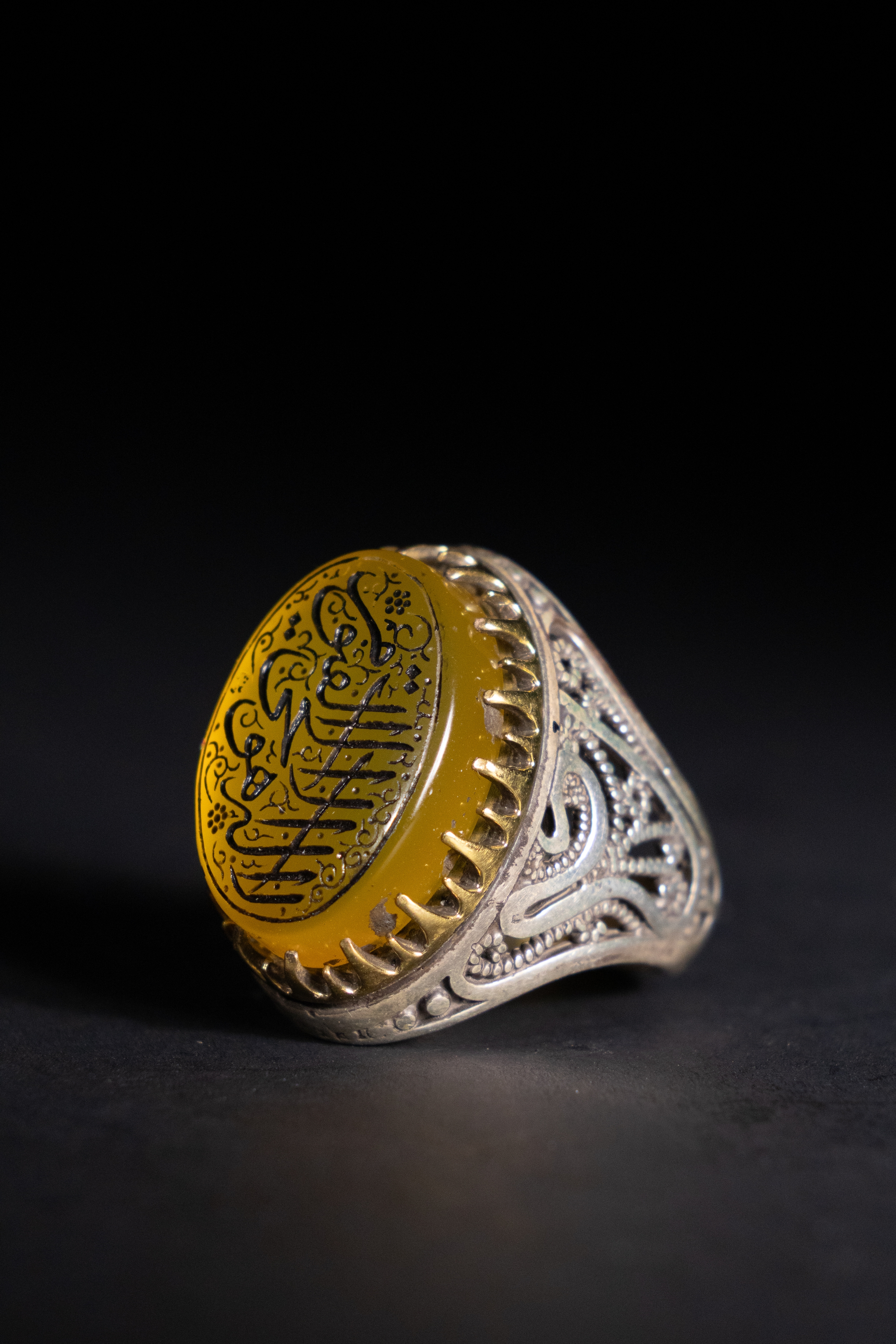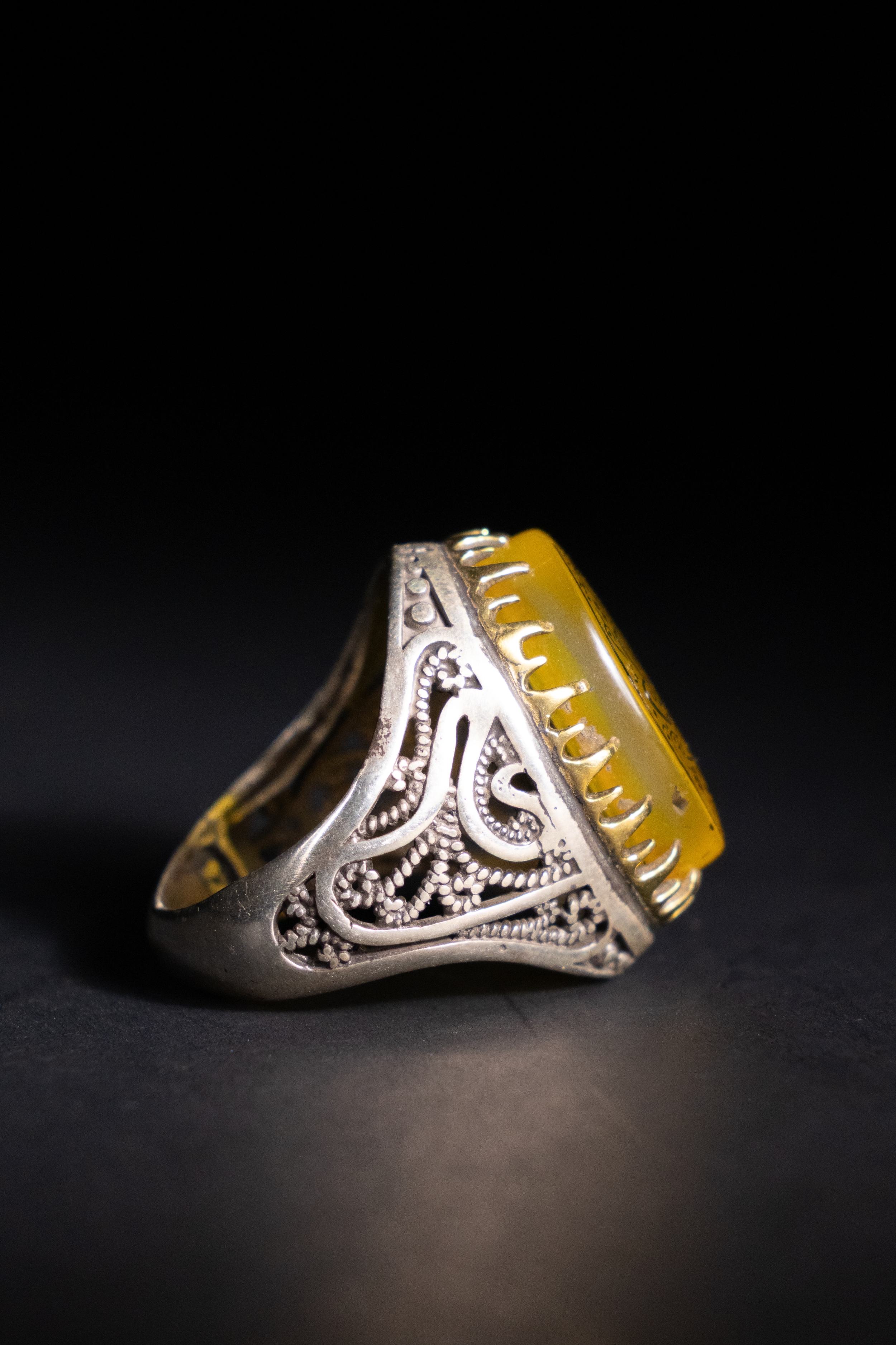 A silver ring featuring a rounded oval yellow agate stone, deeply engraved with ornate Arabic calligraphy and framed by prominent vertical prongs.