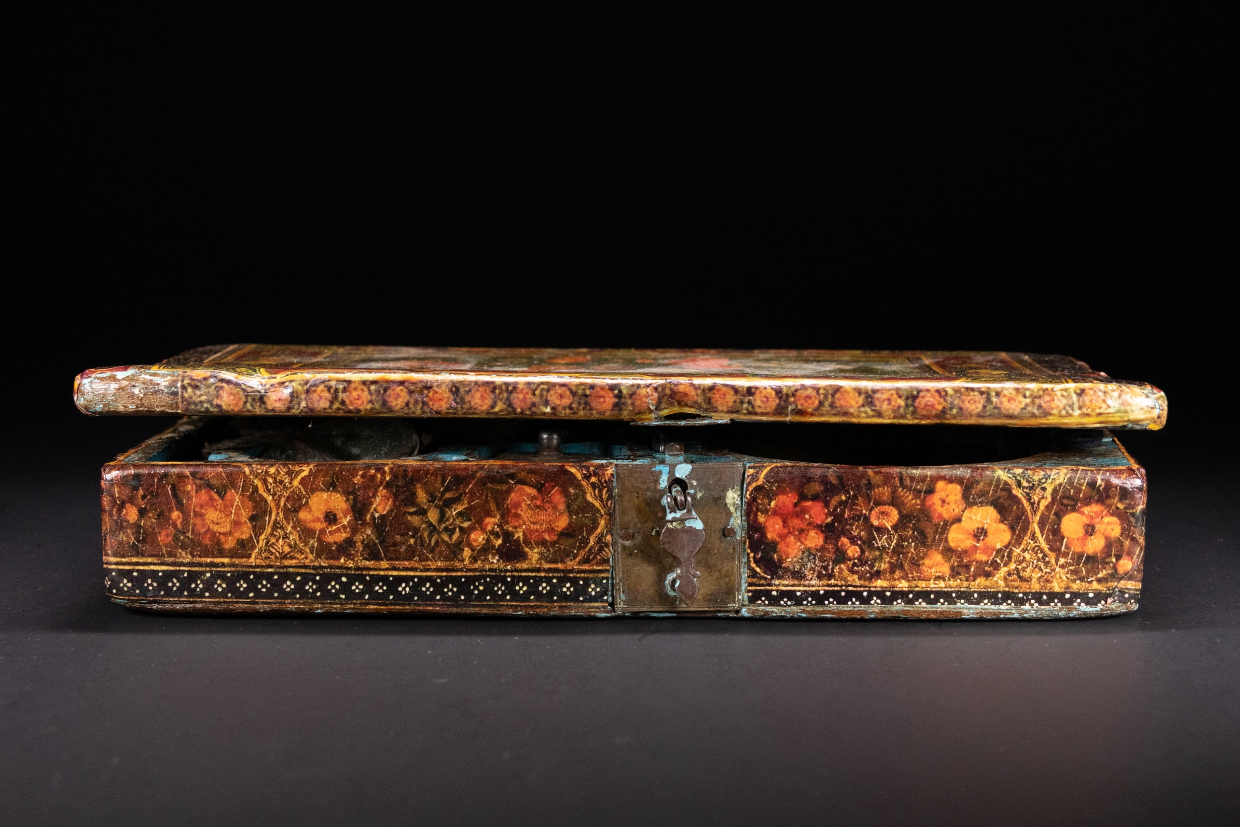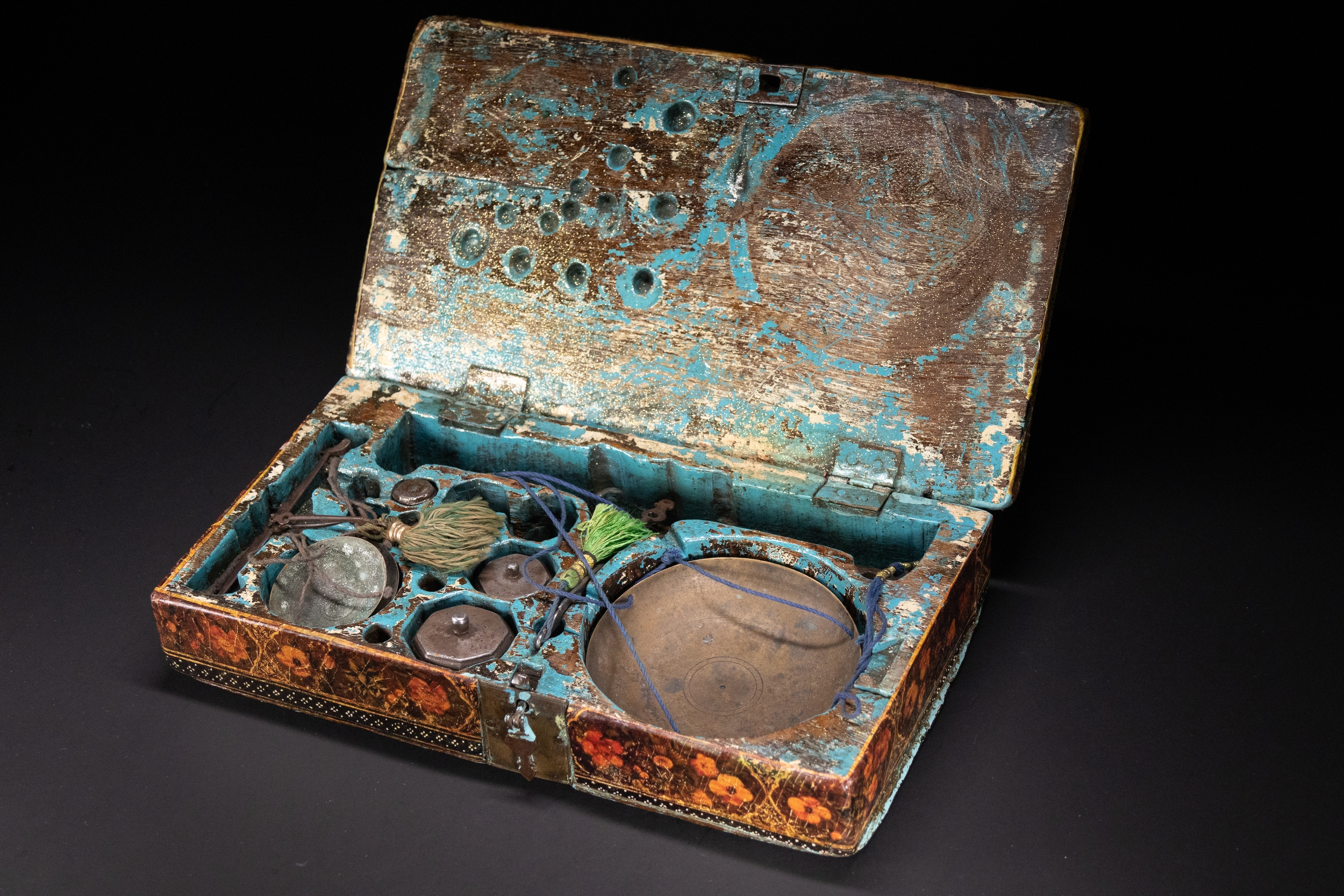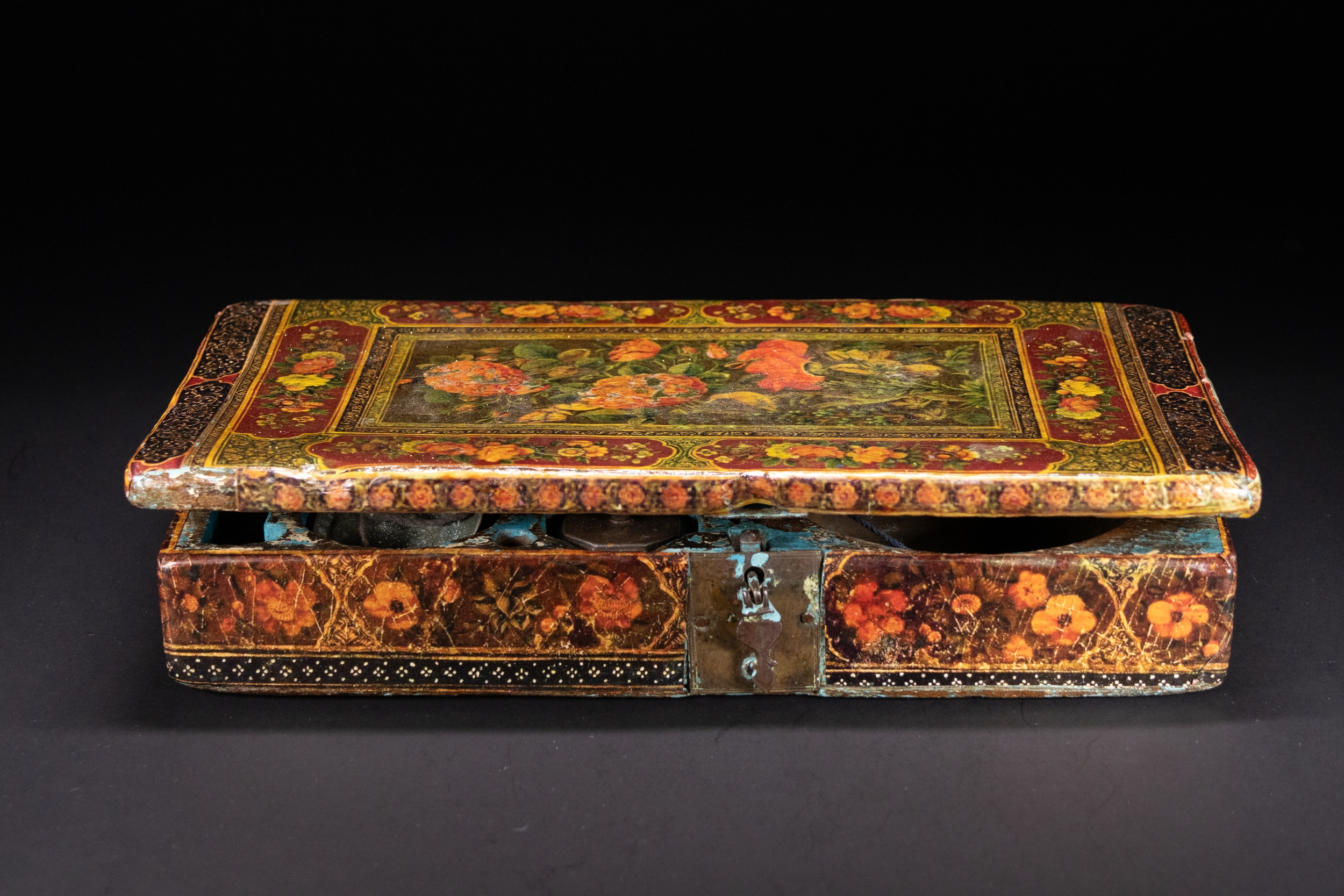 A Qajar Lacquered Merchant’s Scale Box Signed by Hashim of Isfahan, 19th Century.