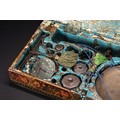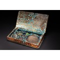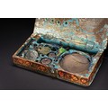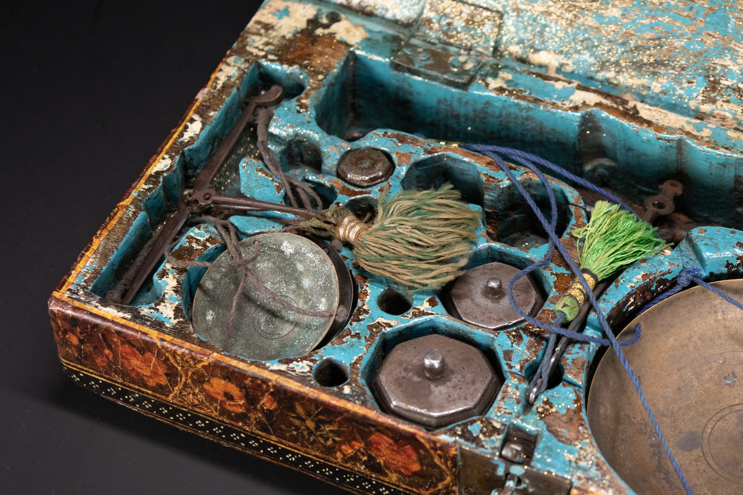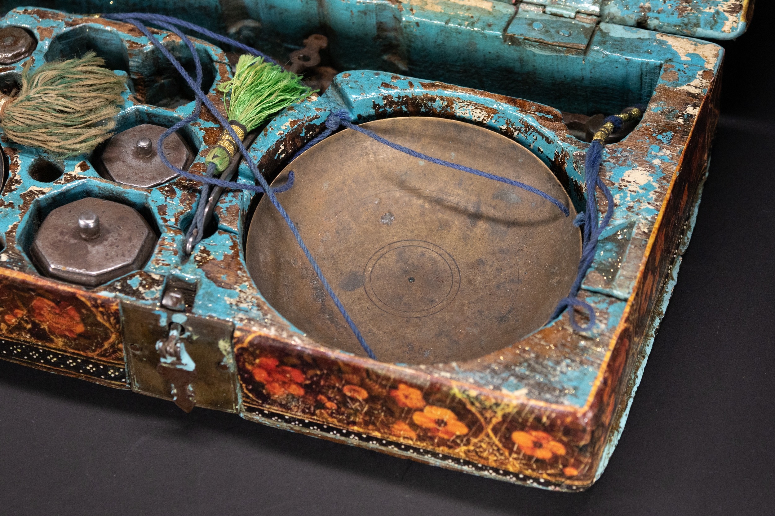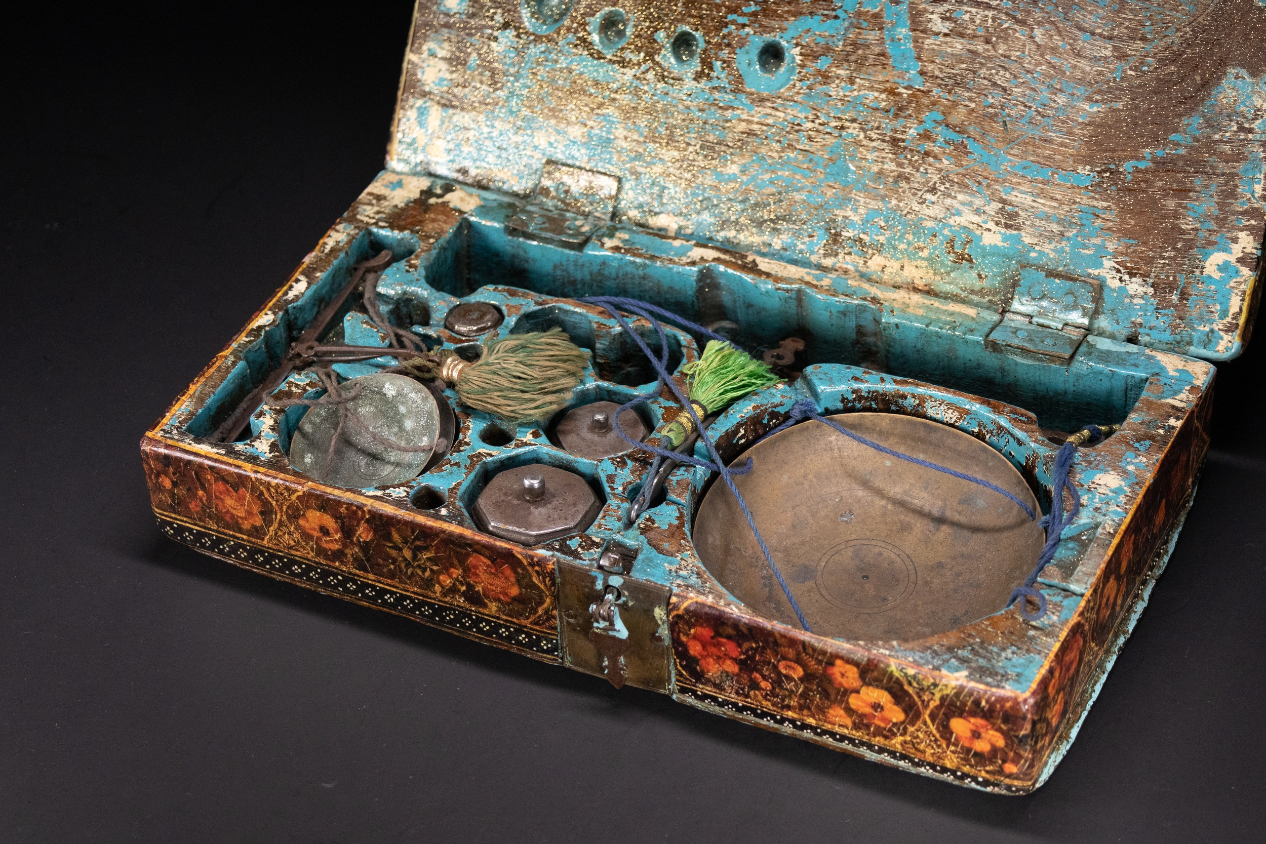 A richly decorated lacquered wood merchant’s scale box from Qajar Iran, signed by Hashim of Isfahan. The exterior is vibrantly adorned with hand-painted floral motifs, set within framed borders of red, yellow, and gold against a deep lacquered ground. The lid features a central bouquet surrounded by cartouches of blooming flowers, enclosed by detailed geometric and floral bands. The interior is fitted in worn turquoise with compartments housing a complete set of merchant’s scales, weights, pans, and silk cords, used historically for weighing precious goods.