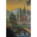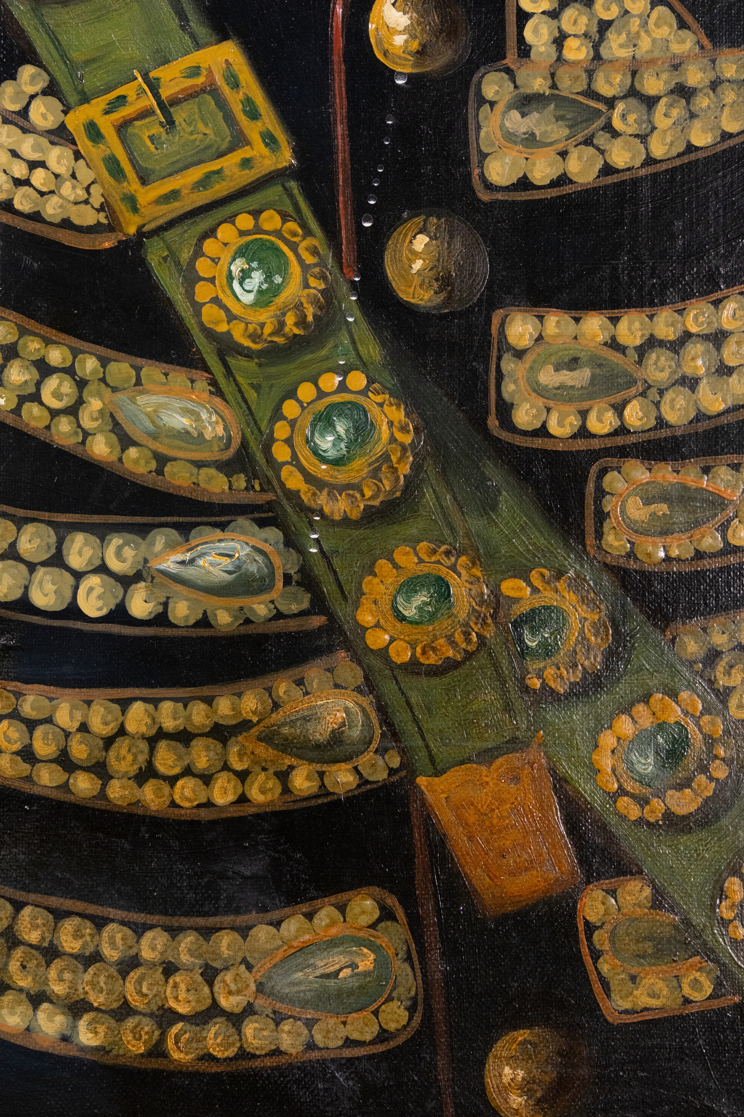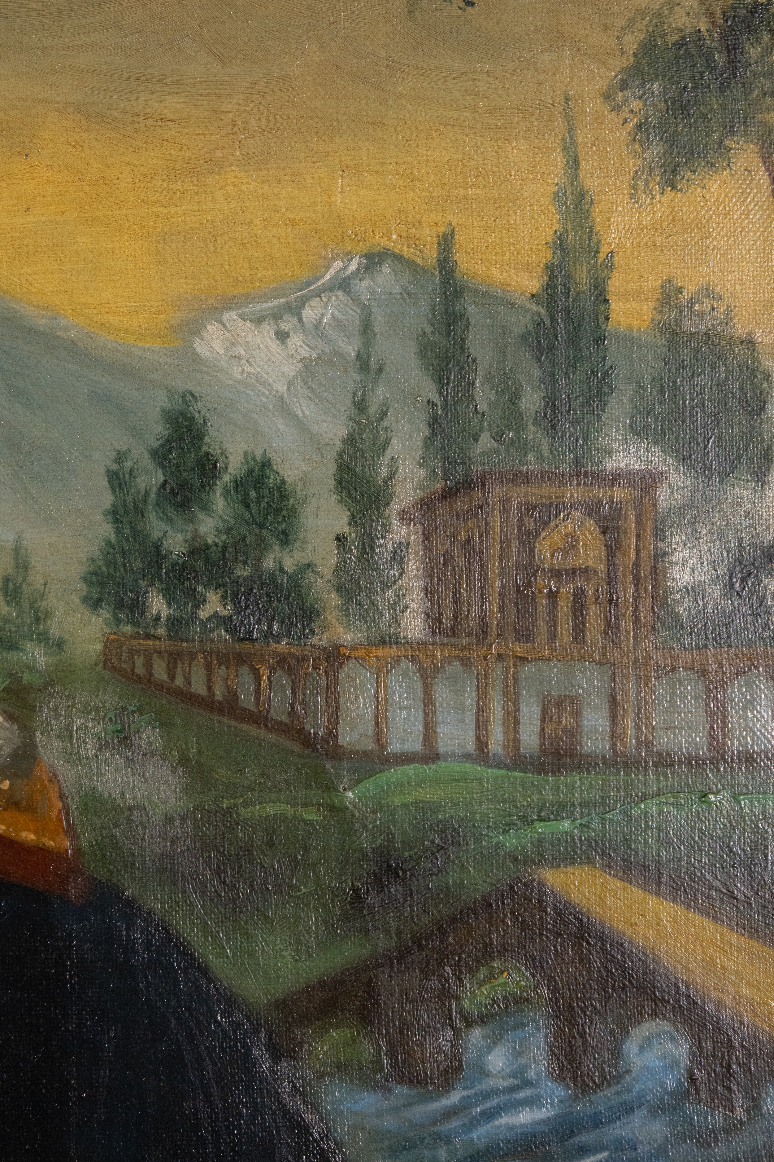An oil on canvas portrait depicting Mozaffar al-Din Shah Qajar (r. 1896–1907), the fifth Qajar king of Persia, shown in full military regalia against a mountainous landscape. His elaborate uniform is adorned with gold-embroidered detailing, pearl-studded epaulettes, and a richly embellished green sash with turquoise jewels. He wears a tall black Qajar-style hat topped with a gold plume and emerald brooch. The background features lush trees, snow-capped peaks, and a palace, possibly evoking royal gardens or the Golestan complex.